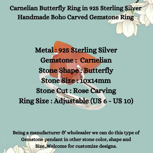 Carnelian Butterfly Ring in 925 Sterling Silver Handmade Boho Carved Gemstone Ring