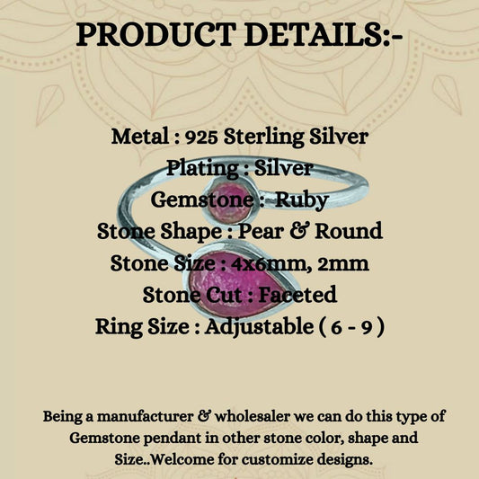 Double Stone Ruby Open Band Ring Adjustable Handmade 925 Sterling Silver Jewelry for Women