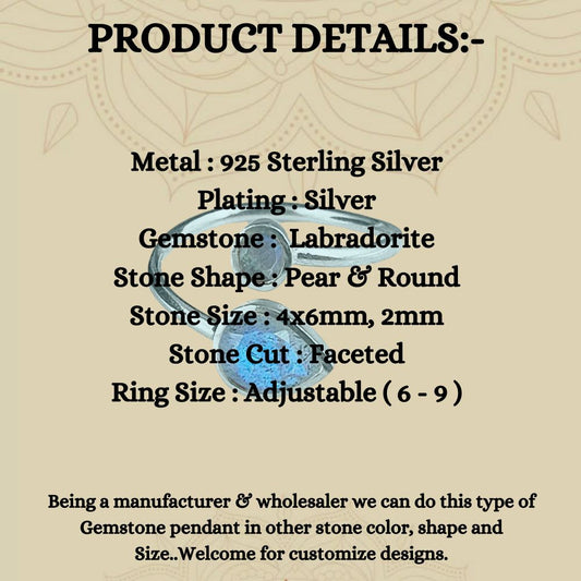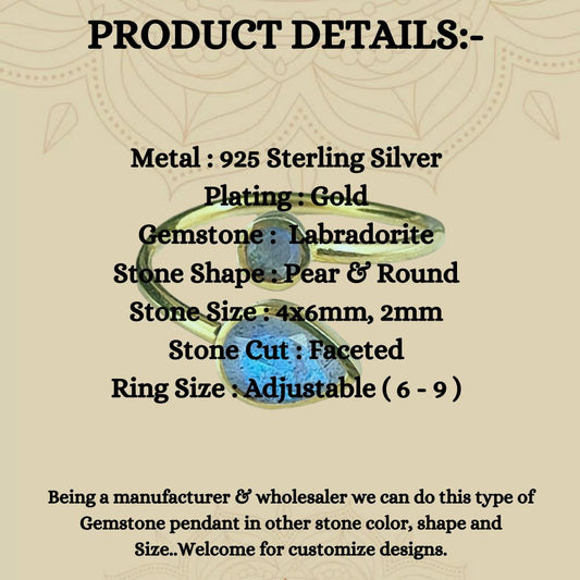 Handcrafted Labradorite Adjustable Ring 925 Sterling Silver Double Gemstone Dainty Jewelry Gift for Her