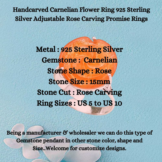 Handcarved Carnelian Flower Ring 925 Sterling Silver Adjustable Rose Carving Promise Rings