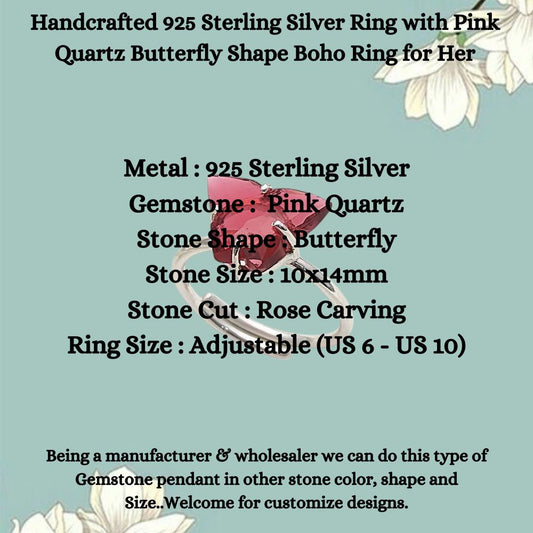 Handcrafted 925 Sterling Silver Ring with Pink Quartz Butterfly Shape Boho Ring for Her