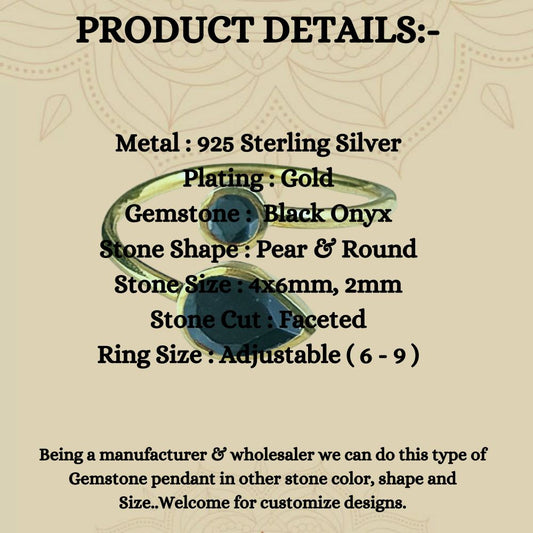 Handmade Black Onyx Ring in Gold Plated Sterling Silver Adjustable Minimalist Double Stone Open Band Ring