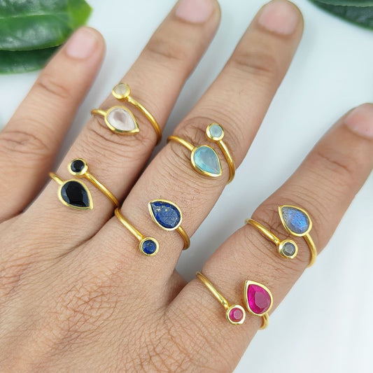 Handmade Gold Plated Sterling Silver Open Band Ring with Gemstone Adjustable Minimalist Jewelry for Women- Selling Per Piece