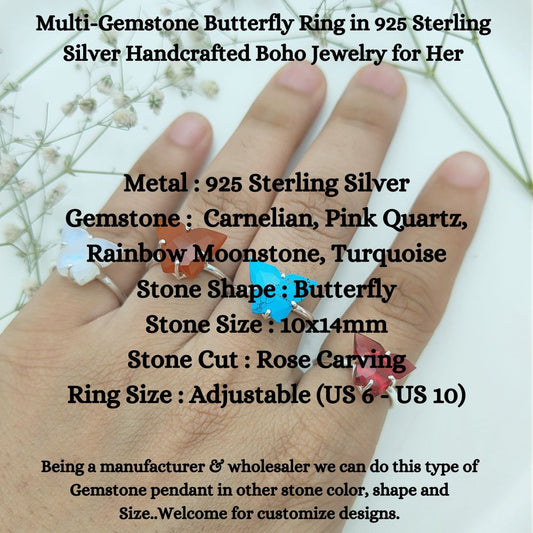 Multi-Gemstone Butterfly Ring in 925 Sterling Silver Handcrafted Boho Jewelry for Her