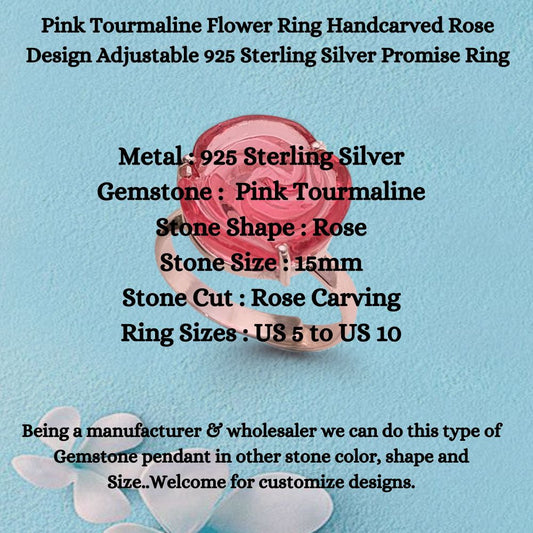 Pink Tourmaline Flower Ring Handcarved Rose Design Adjustable 925 Sterling Silver Promise Ring