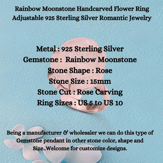 Rainbow Moonstone Handcarved Flower Ring Adjustable 925 Sterling Silver Romantic Jewelry