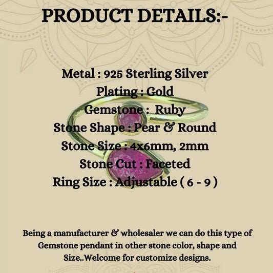 Ruby Gemstone Adjustable Ring in Gold Plated Sterling Silver Double Gemstone Handmade Minimalist Jewelry