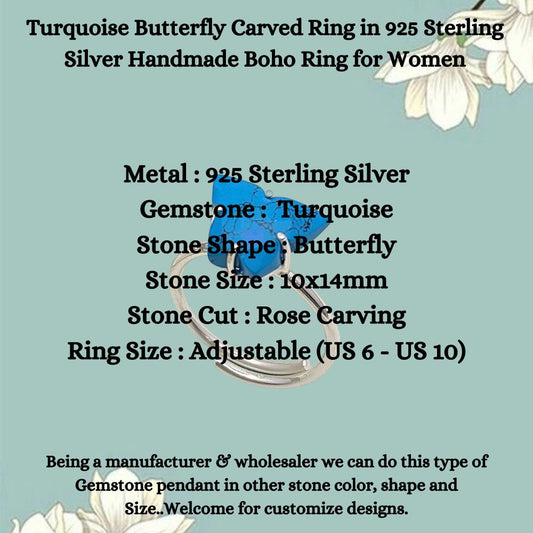 Turquoise Butterfly Carved Ring in 925 Sterling Silver Handmade Boho Ring for Women