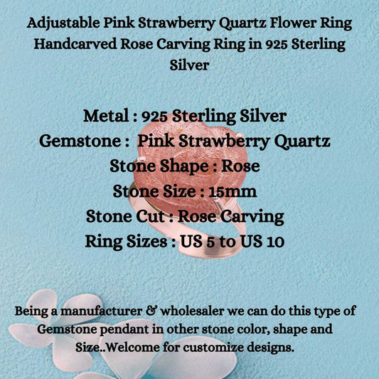 Adjustable Pink Strawberry Quartz Flower Ring Handcarved Rose Carving Ring in 925 Sterling Silver