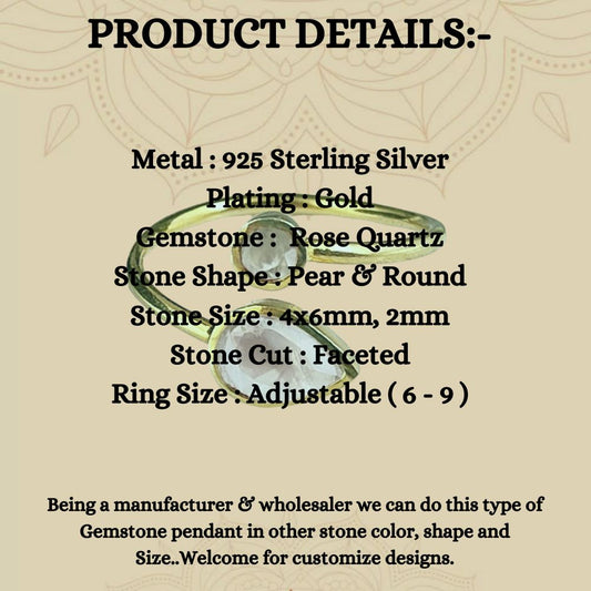 Double Gemstone Rose Quartz Ring Adjustable Gold Plated Sterling Silver Handmade Open Band Design