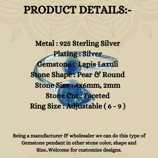 Handmade Lapis Lazuli Ring Adjustable 925 Sterling Silver Double Stone Open Band Dainty Jewelry Gift