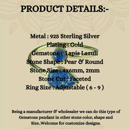 Minimalist Lapis Lazuli Adjustable Ring Gold Plated 925 Sterling Silver Handmade Statement Jewelry