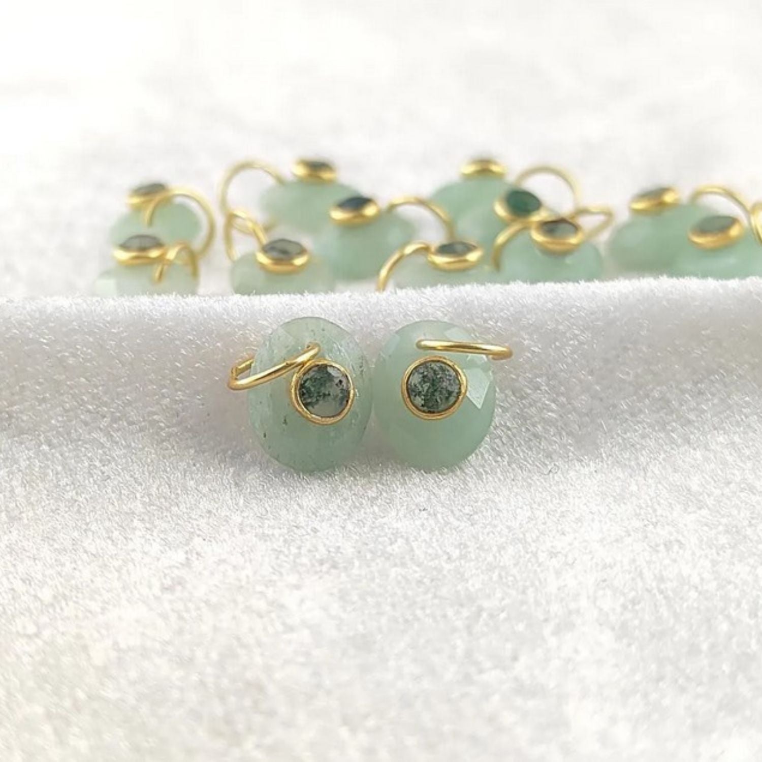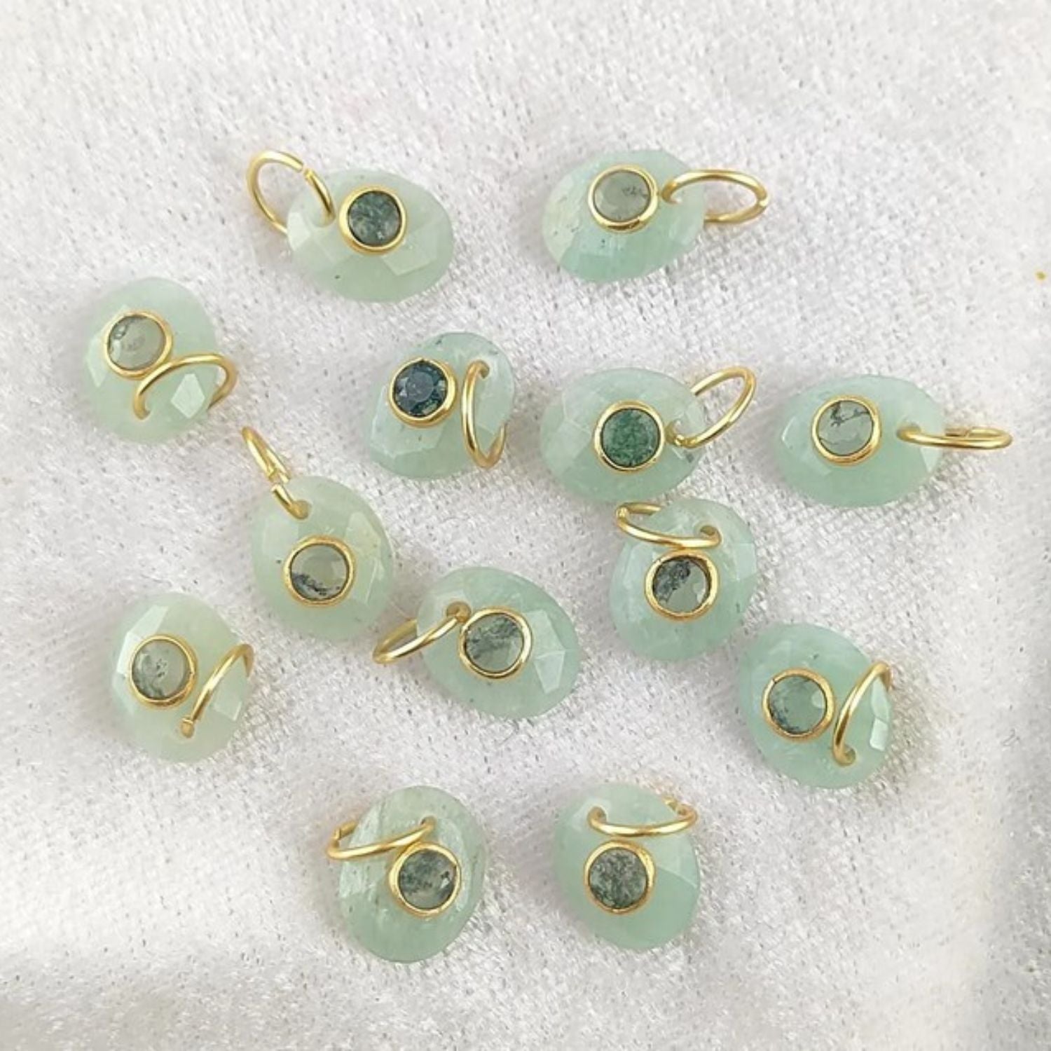 Add soothing color and spiritual meaning to your jewelry designs with this beautifully handcrafted 10x8mm Oval Amazonite Pendant, accented with a delicate Moss Agate gemstone. Set in a gold plated 925 sterling silver bezel, this charm combines the calming energy of Amazonite with the grounding essence of Moss Agate—making it perfect for healing, spiritual, or nature-inspired jewelry.