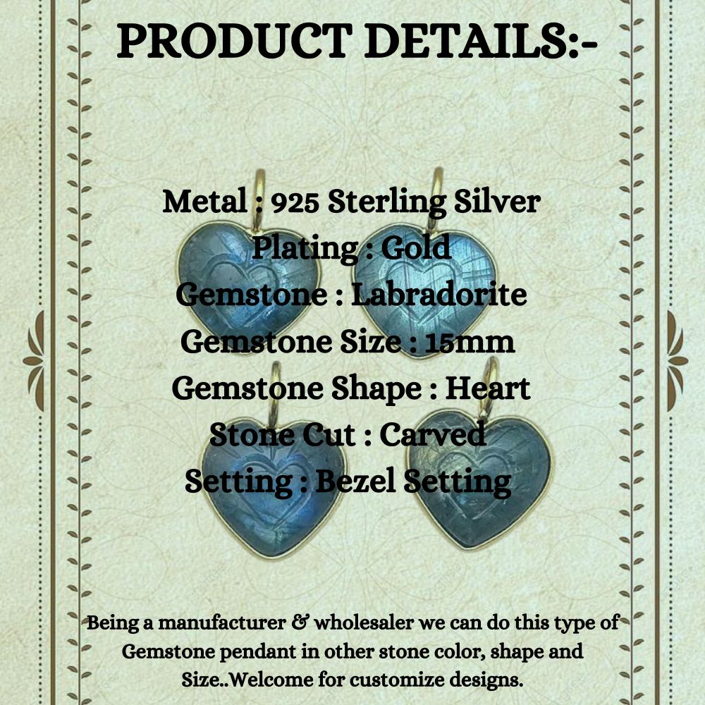 Discover the mystical beauty of this Handmade 15mm Labradorite Heart Pendant, crafted in gold plated 925 sterling silver with a secure bezel setting. Labradorite is known as the stone of transformation and protection, admired for its stunning iridescence that shimmers with flashes of blue, green, and gold.