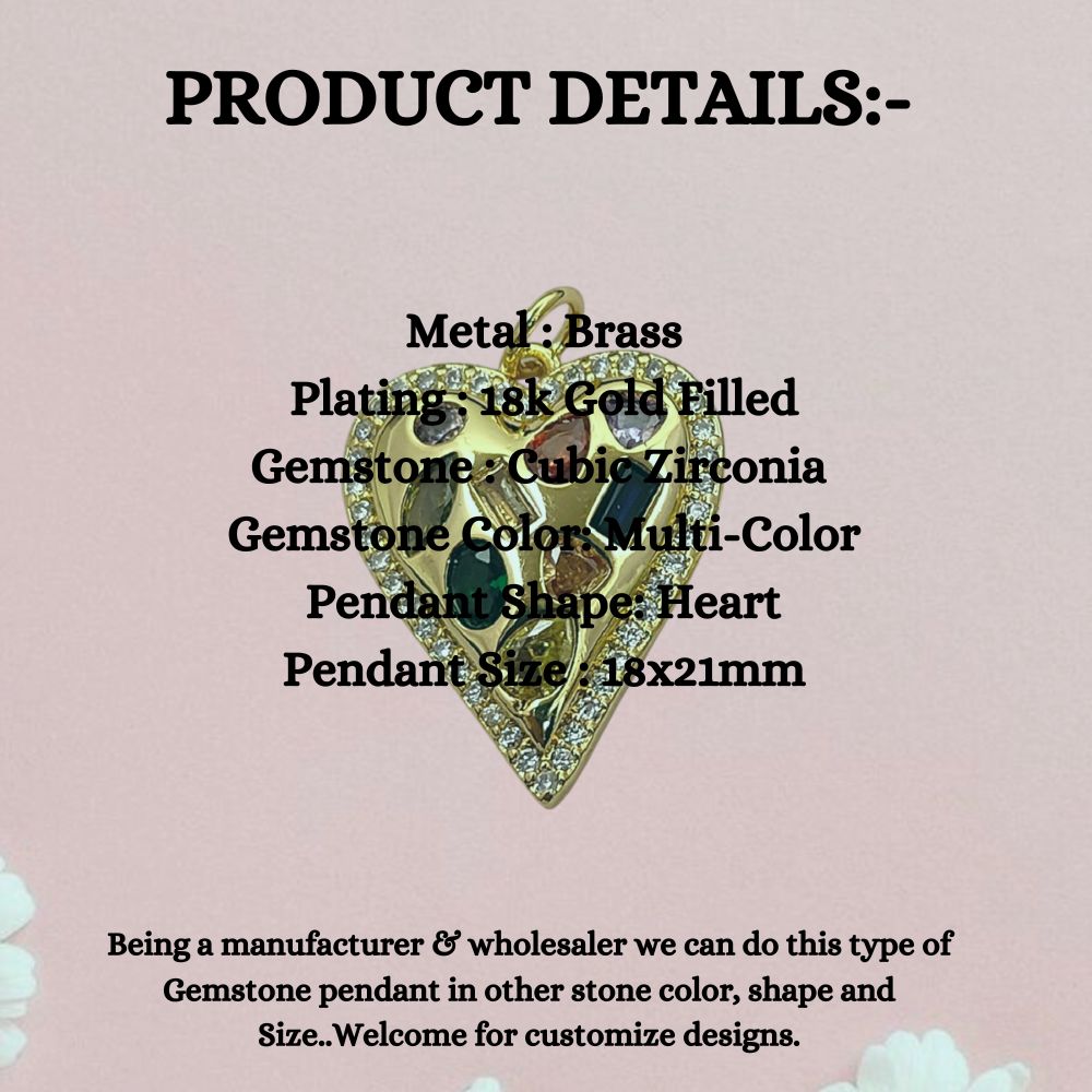 Add vibrant sparkle and timeless elegance to your jewelry designs with this 18K Gold Filled Micropave Cubic Zirconia Heart Pendant. Designed to symbolize love and beauty, this exquisite heart charm is encrusted with brilliant multicolor CZ stones, precisely set in a refined micropave setting that delivers exceptional shine and depth from every angle.