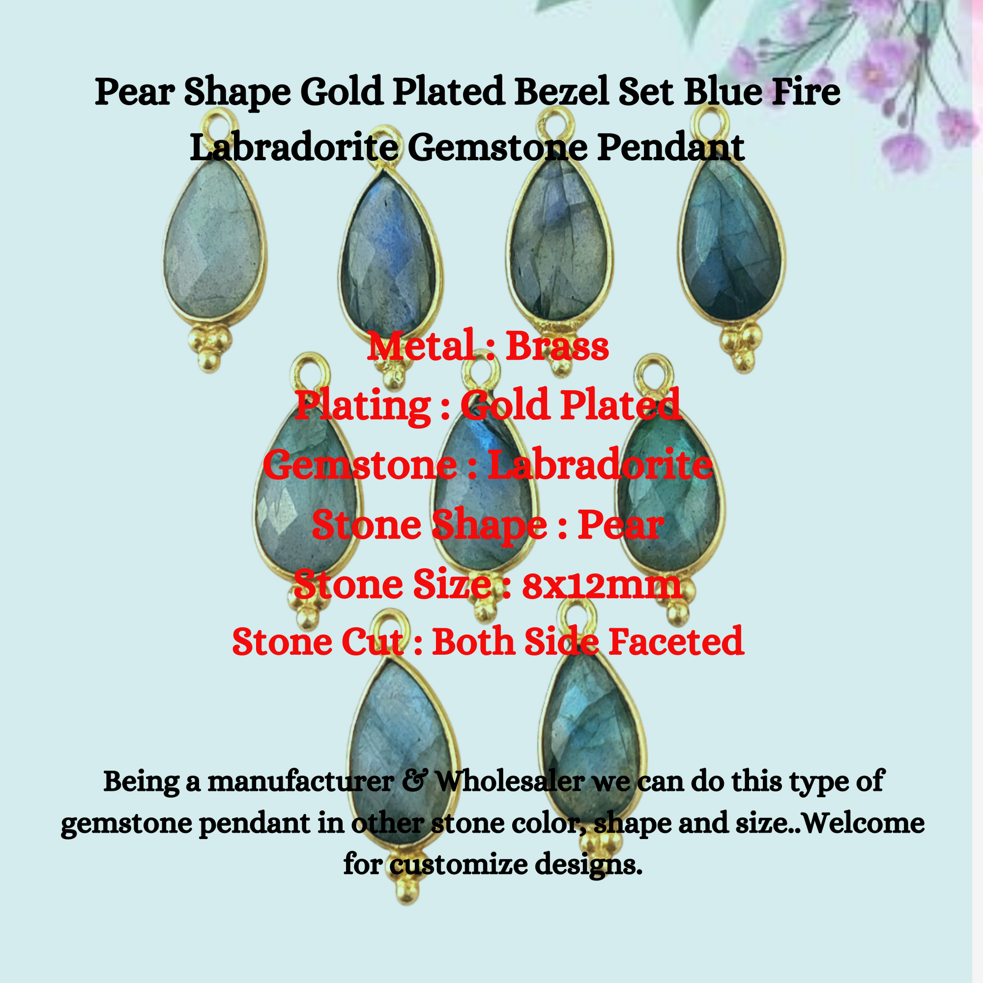 8x12mm Pear Shape Gold Plated Bezel Set Blue Fire Labradorite Gemstone Pendant For Making Jewelry- Selling Per Piece