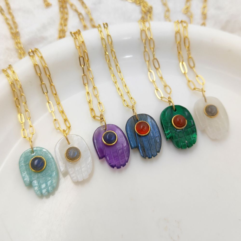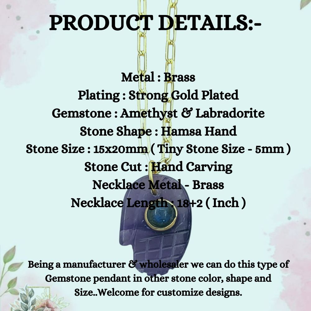 Amethyst Hamsa Hand Necklace Gold Plated Paperclip Chain Unique Boho Spiritual Jewelry Gift- Selling Per Piece