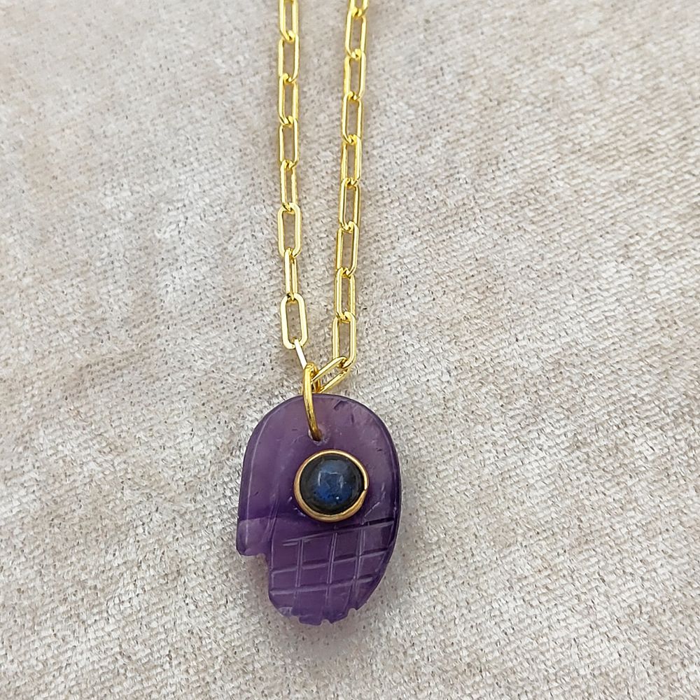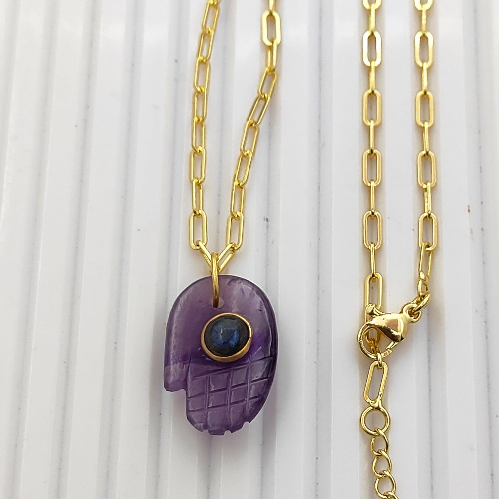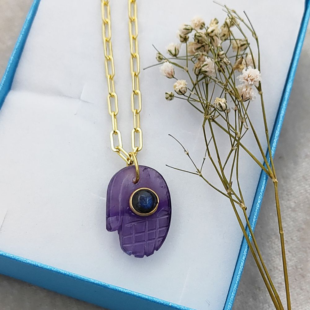 Elevate your style with this handmade Hamsa Hand necklace featuring a genuine Amethyst gemstone pendant. Set on a gold plated paperclip chain, this Bohemian spiritual jewelry piece symbolizes protection, positivity, and inner balance. It’s a meaningful and unique gift for women on birthdays, anniversaries, or any special occasion.