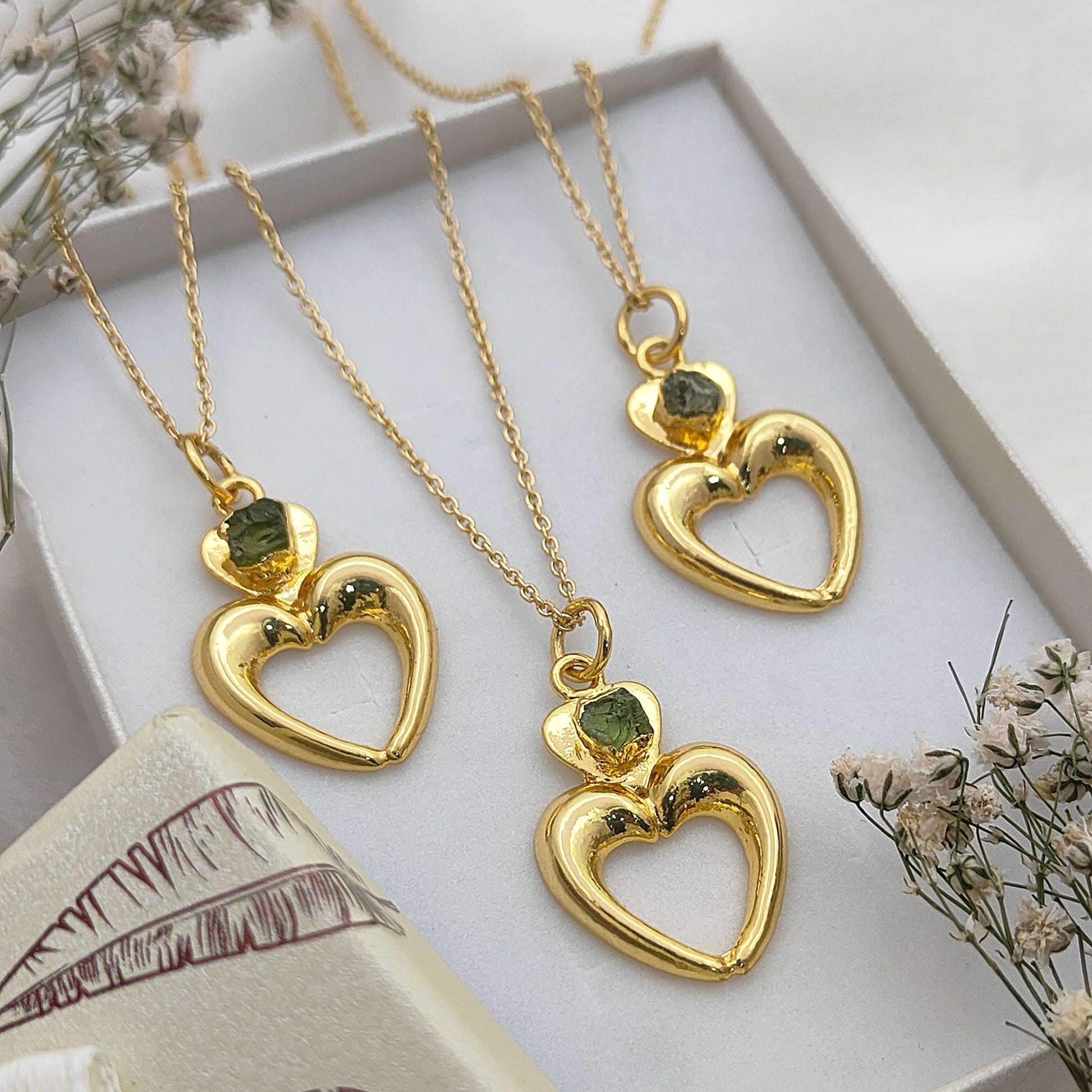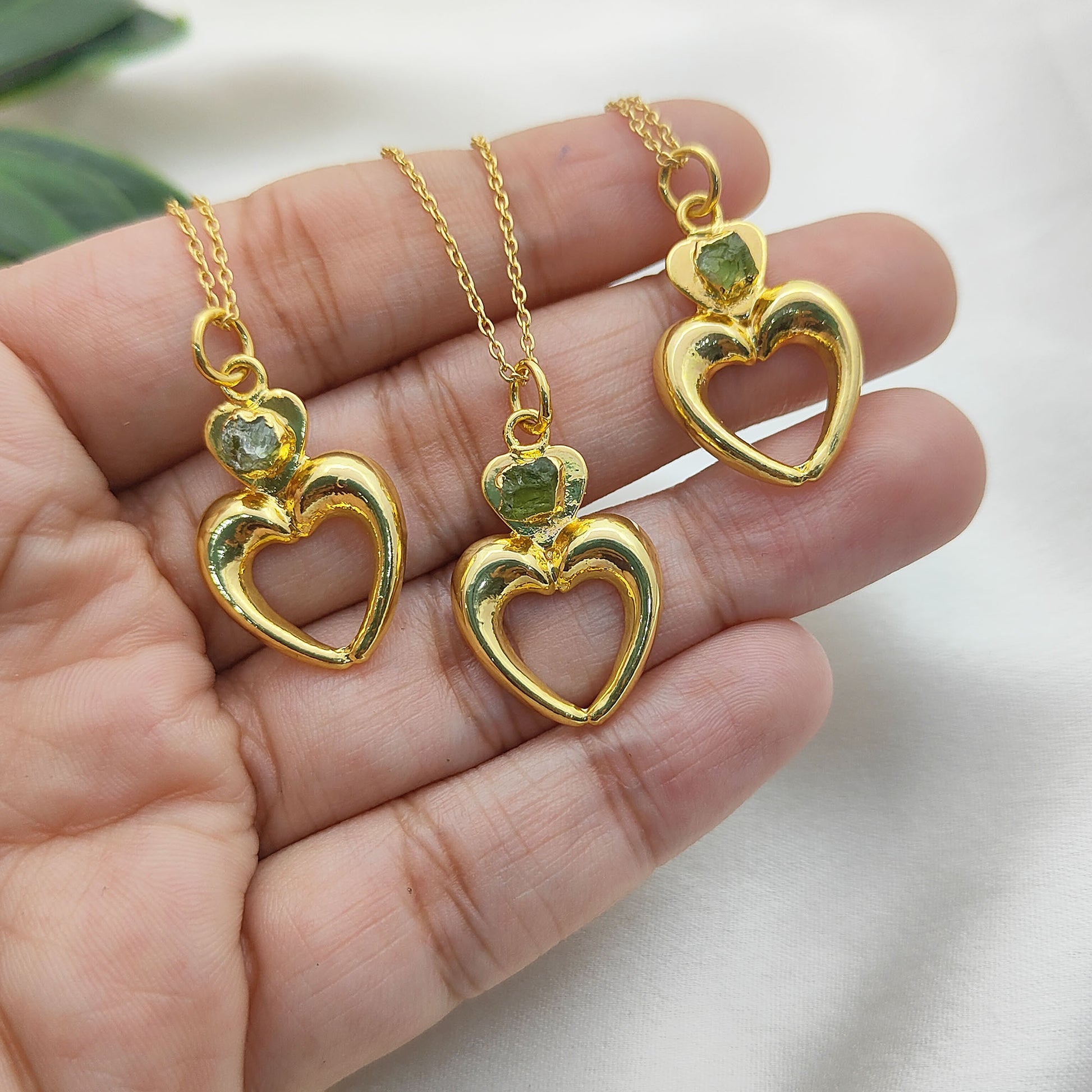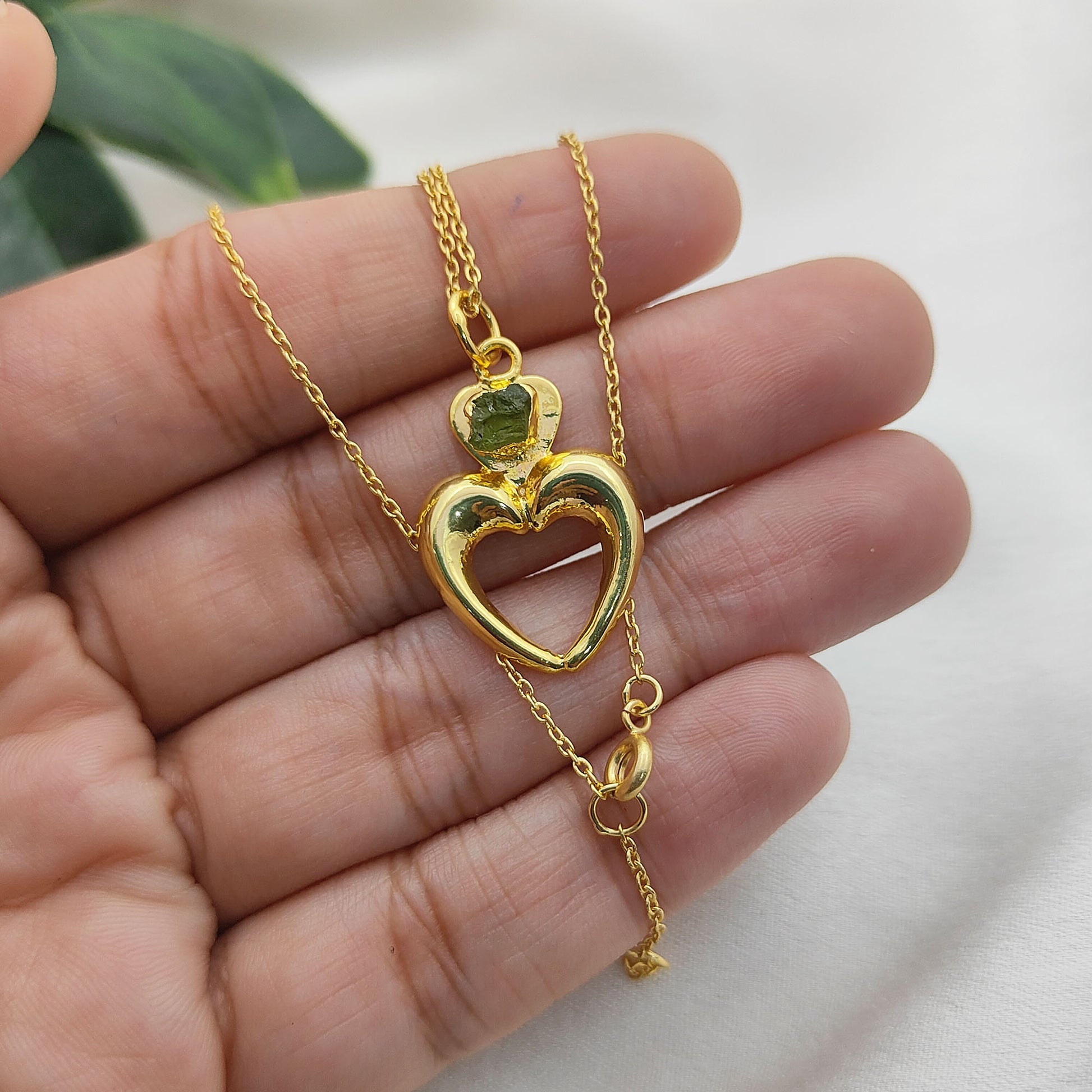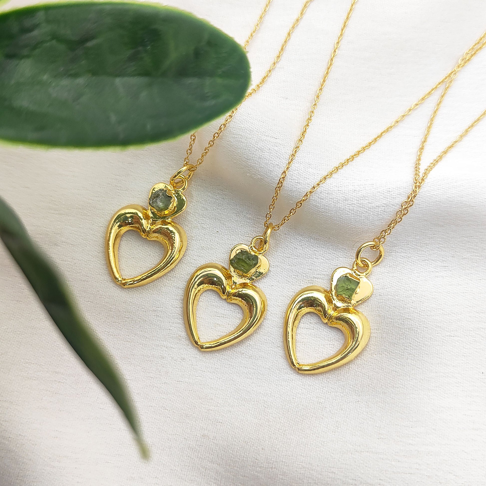 August Birthstone Raw Peridot Necklace with Heart-Shaped Pendant 14K Gold Electroplated Handmade Boho Jewelry