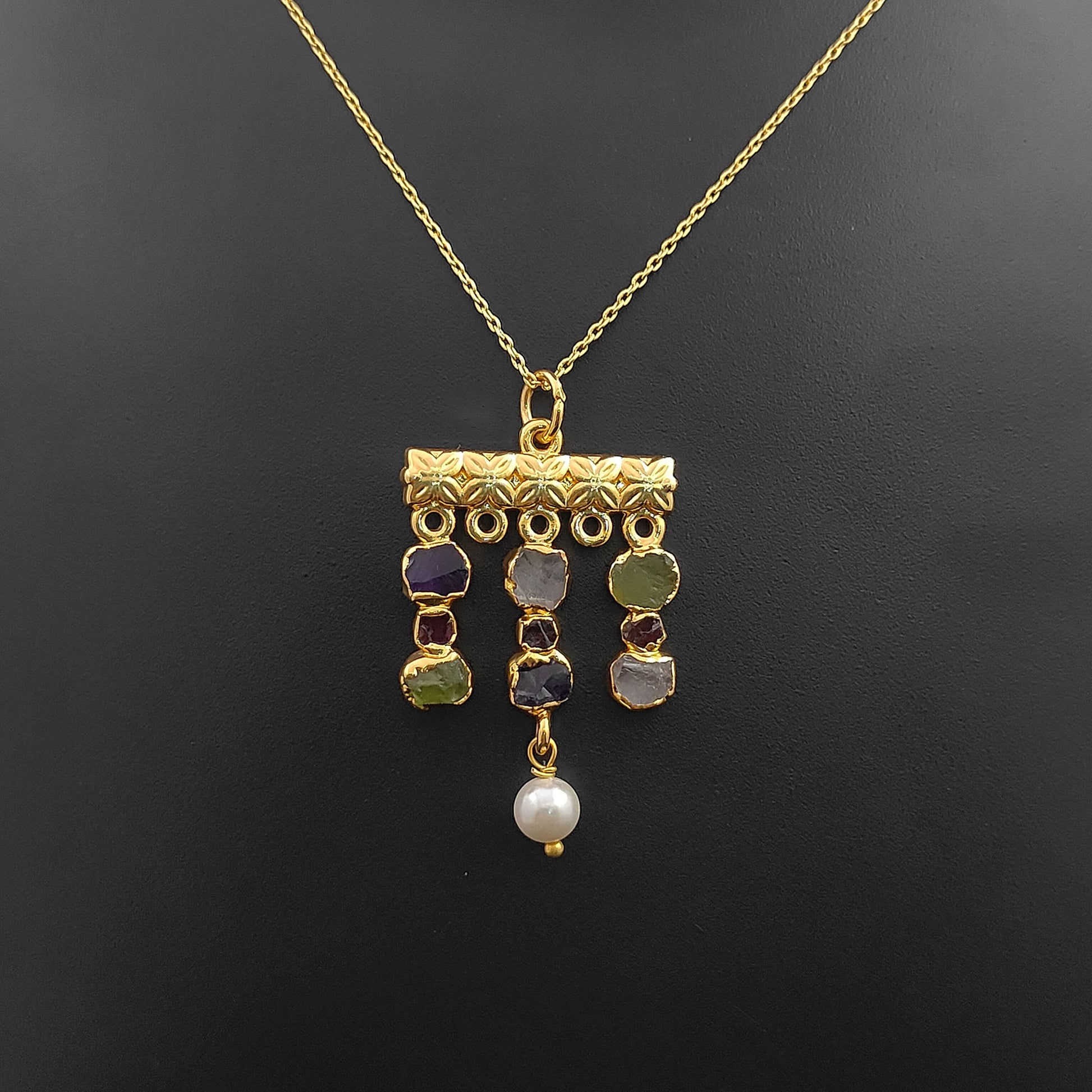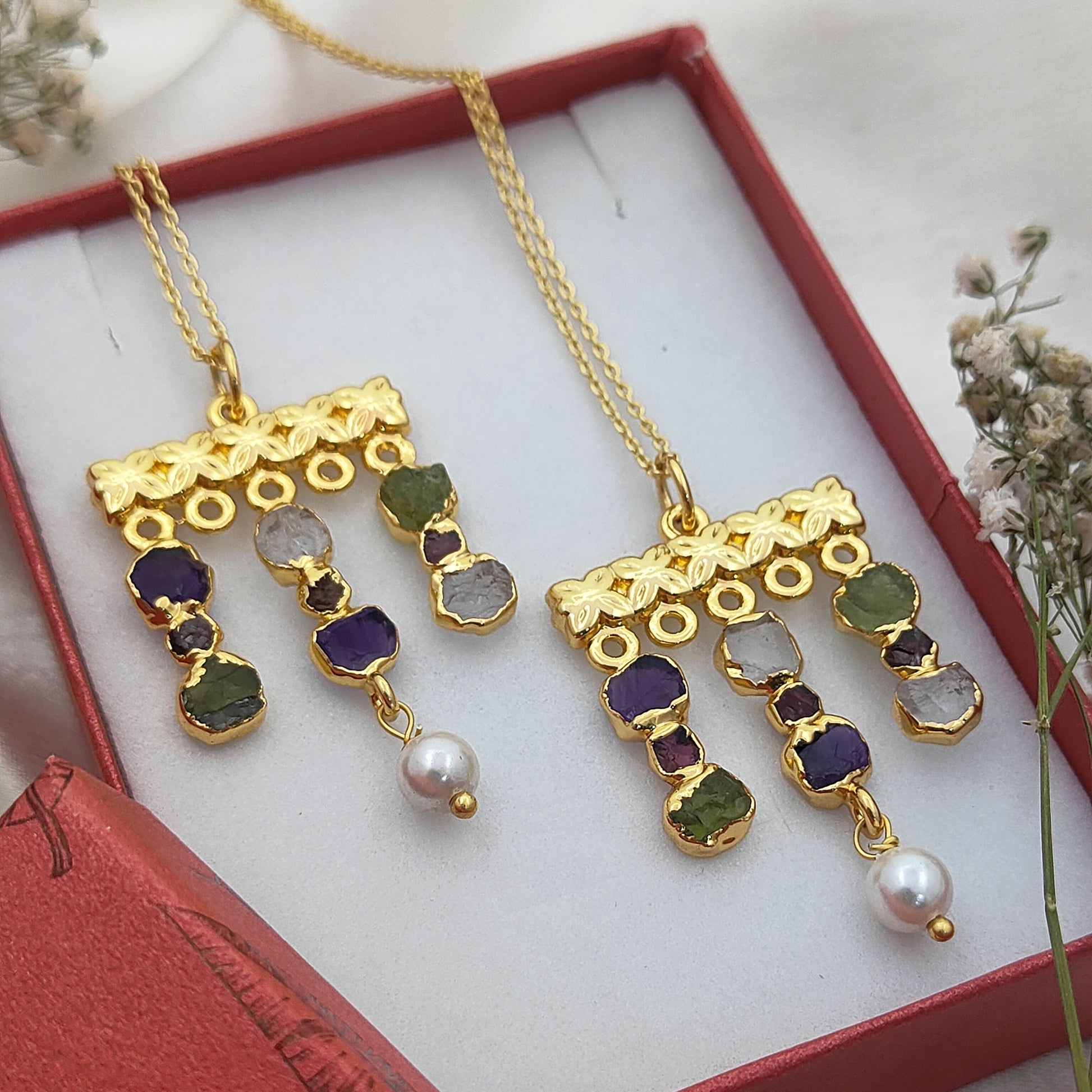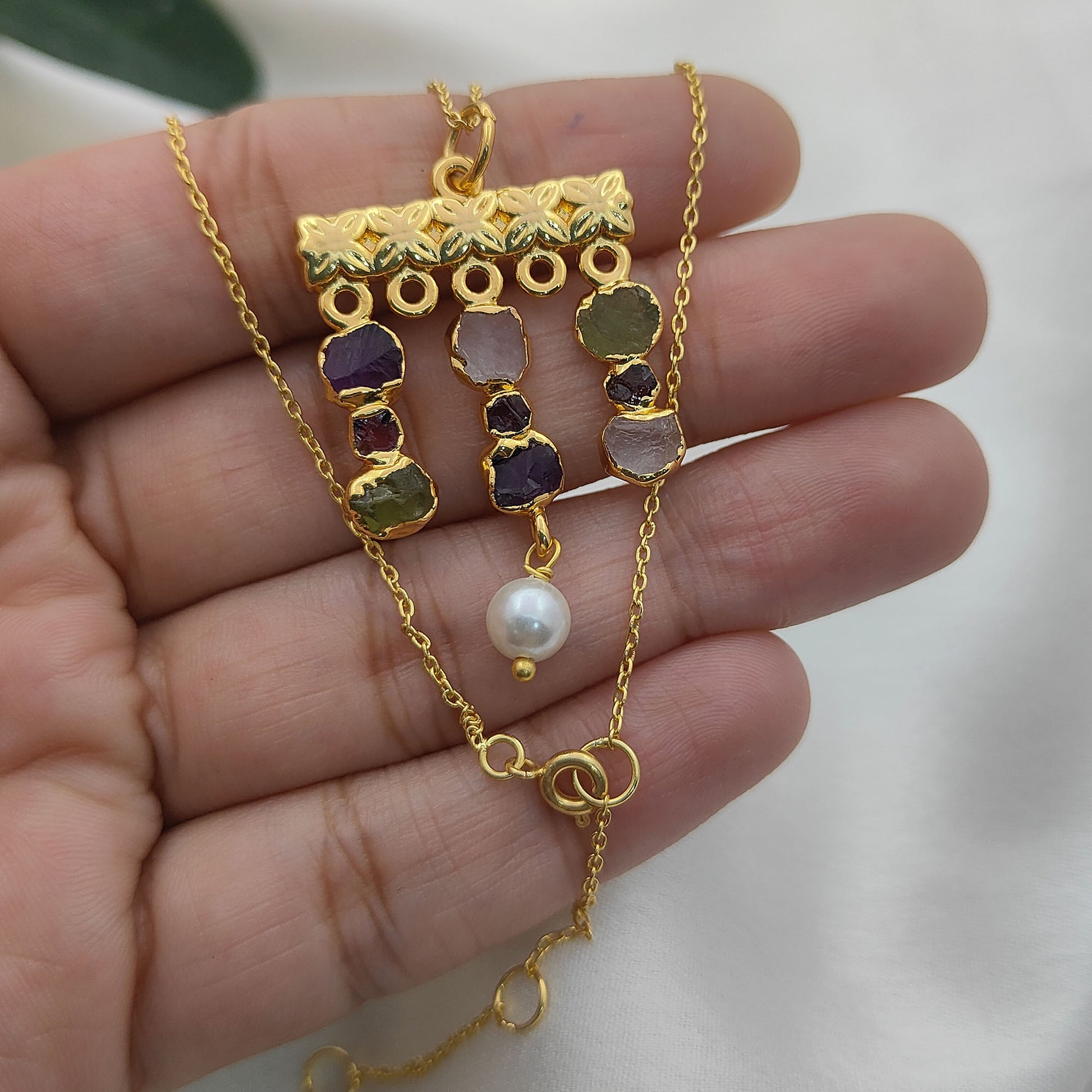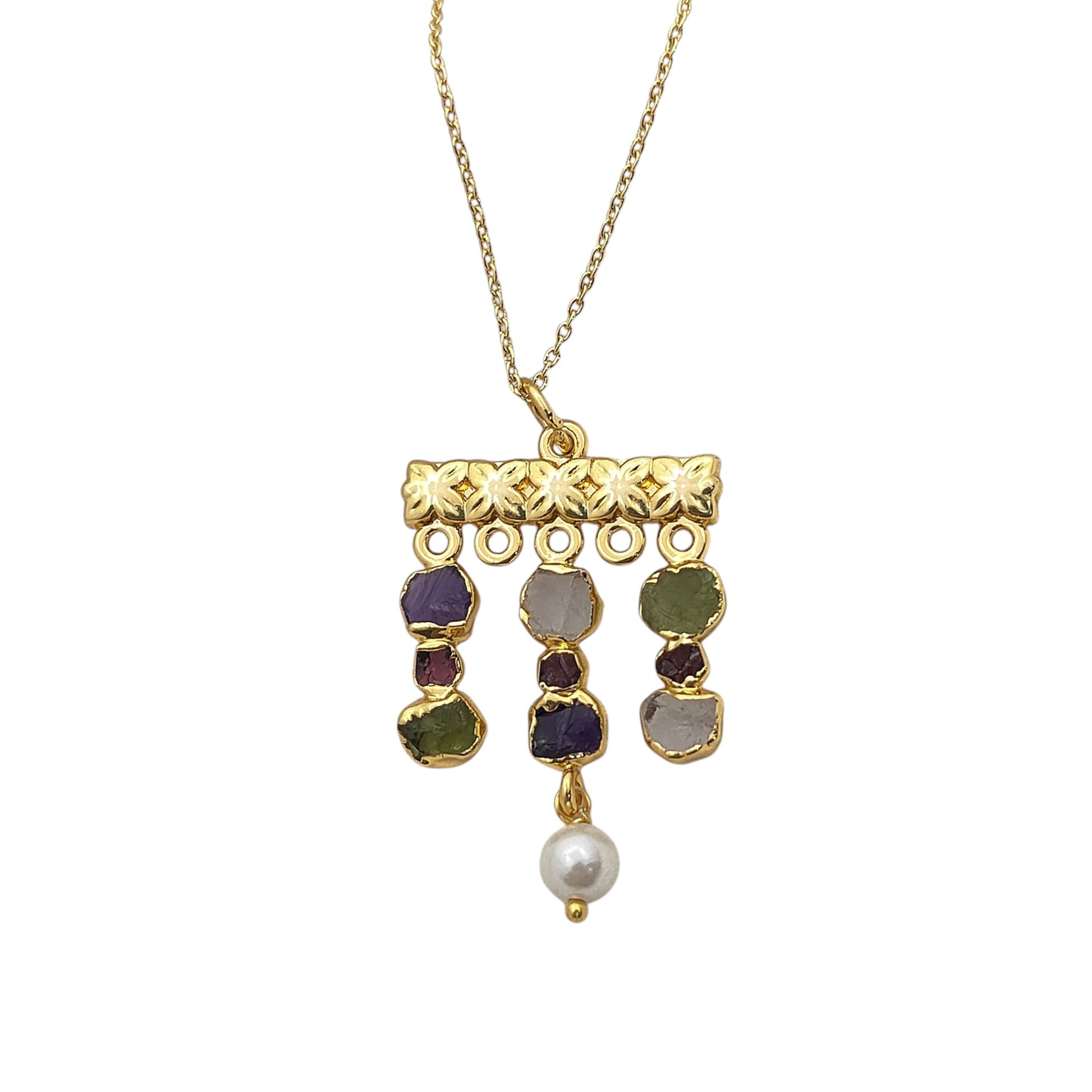 Embrace free-spirited elegance with this handmade bohemian gemstone necklace, featuring a vibrant mix of raw Peridot and Garnet birthstones paired with lustrous freshwater pearls. Each stone is carefully chosen for its natural beauty and healing energy, making this piece both meaningful and stylish. The delicate gold-plated finish adds a touch of luxury, while the mix of textures creates a unique, earthy yet refined design. Perfect for layering or wearing solo, this necklace is a versatile accessory for everyday wear or special occasions.