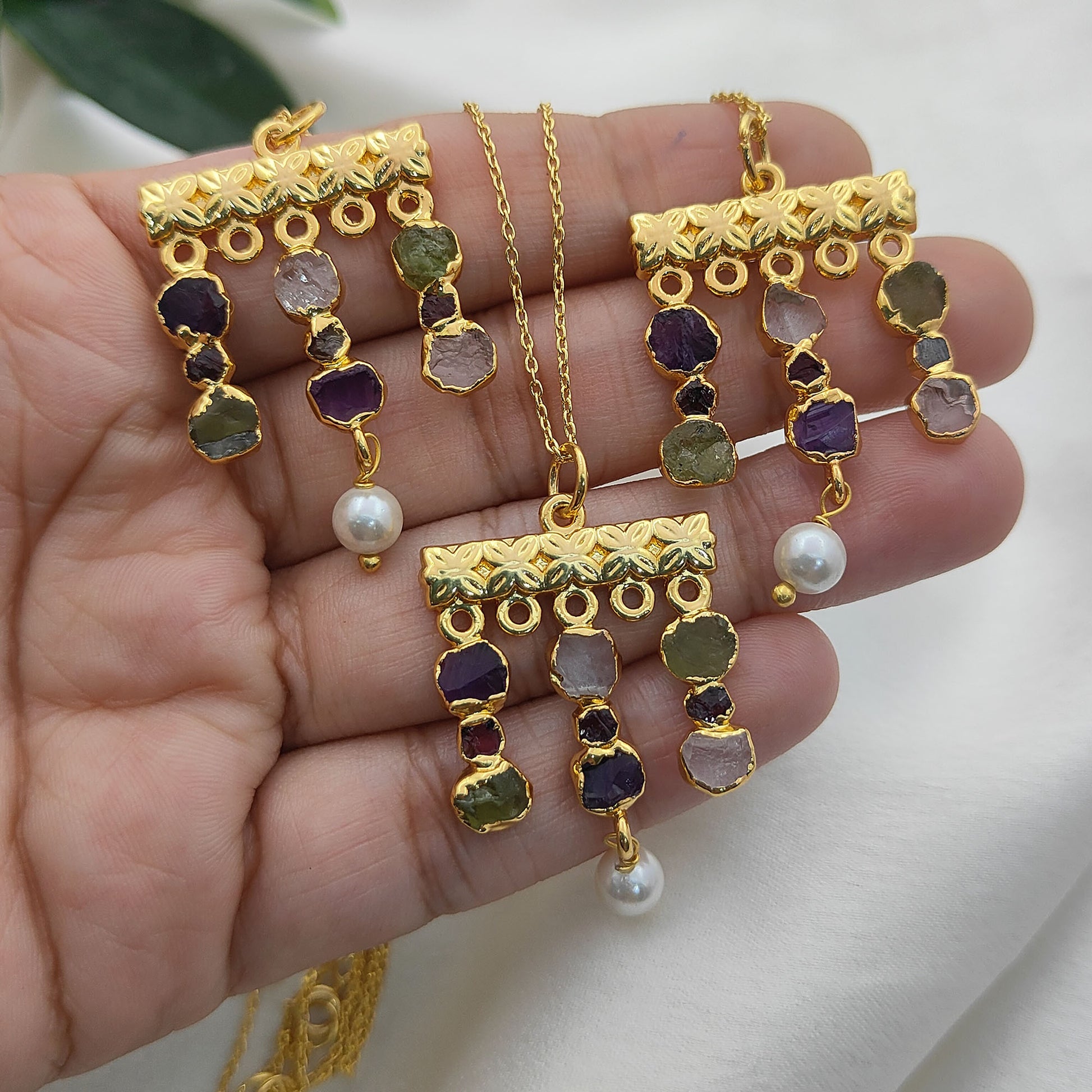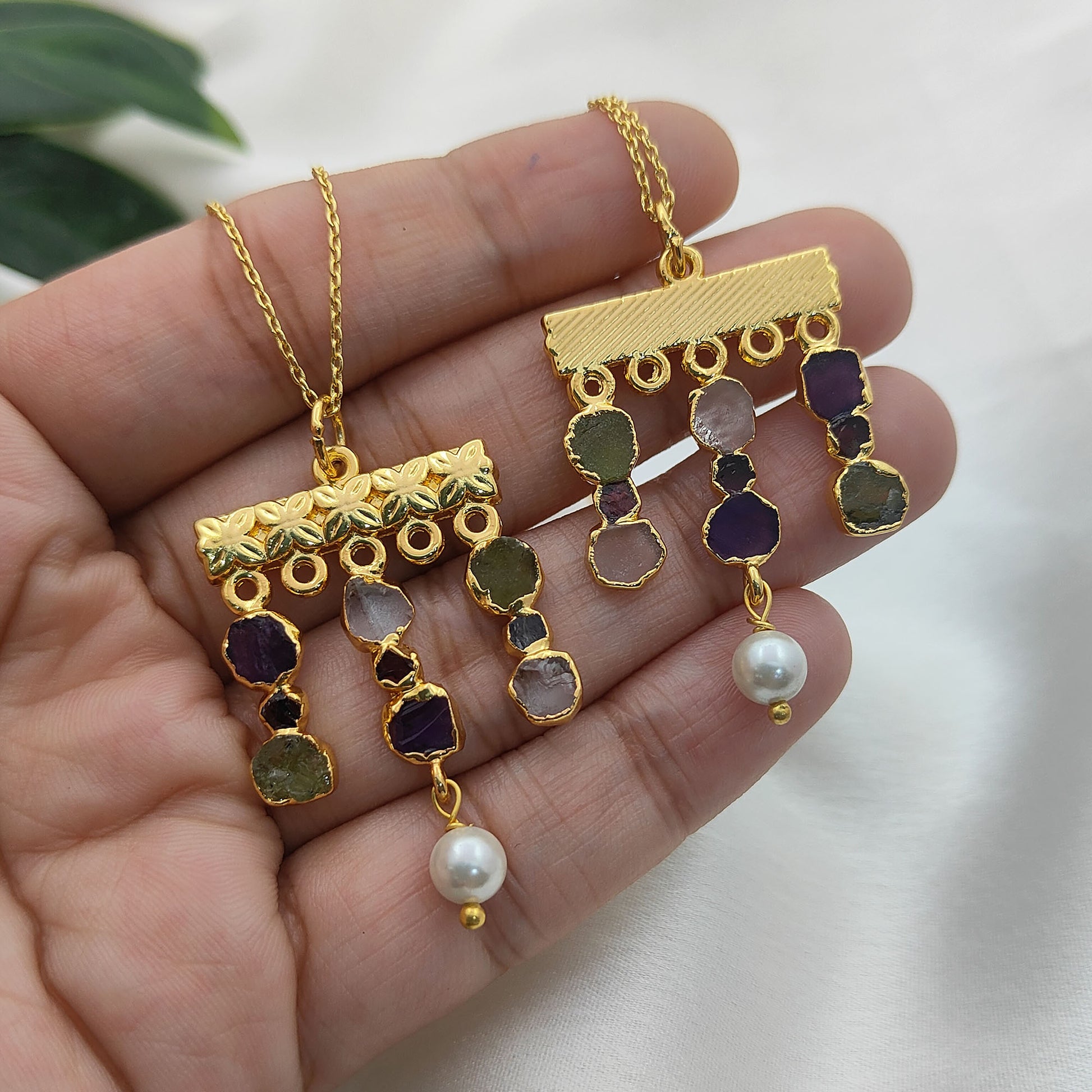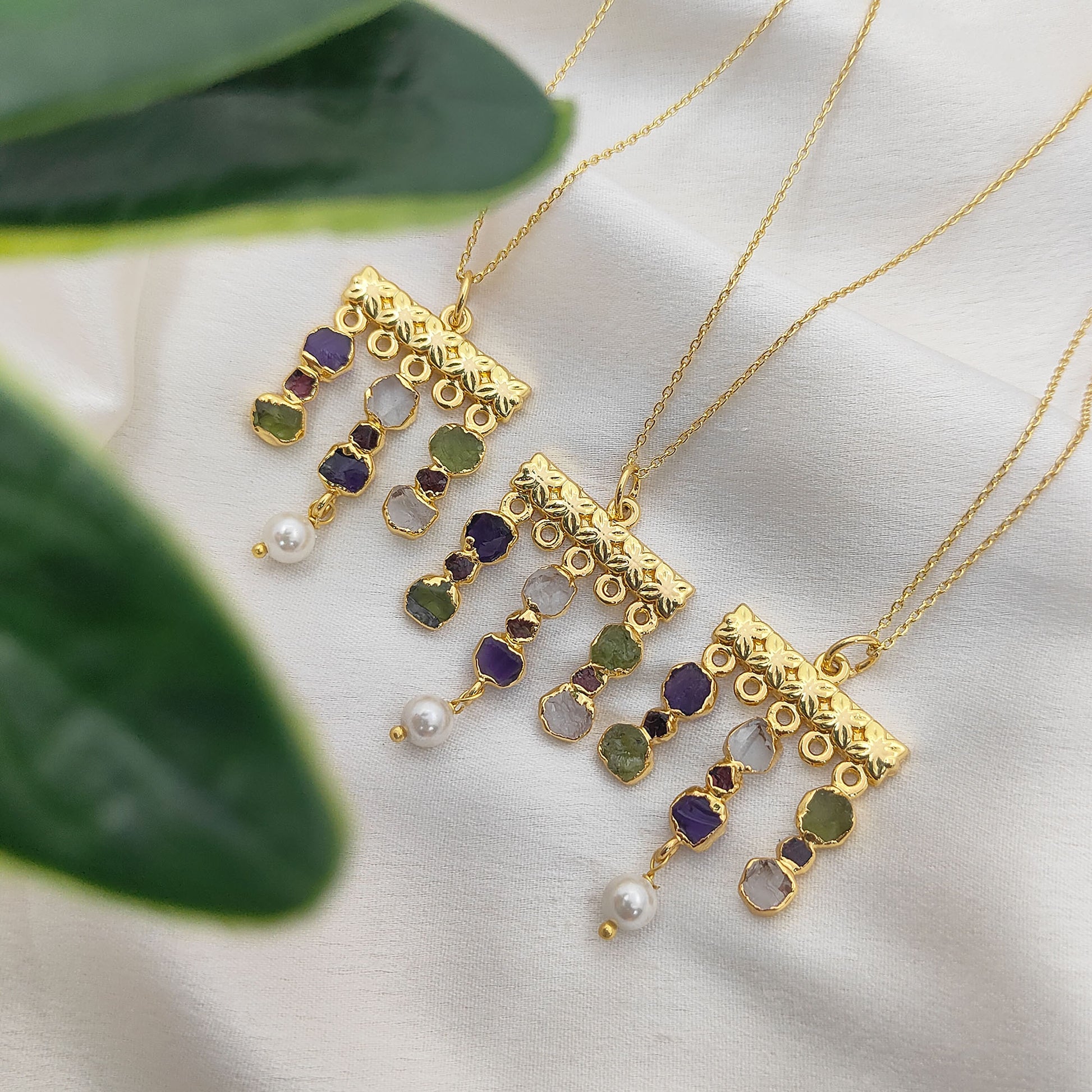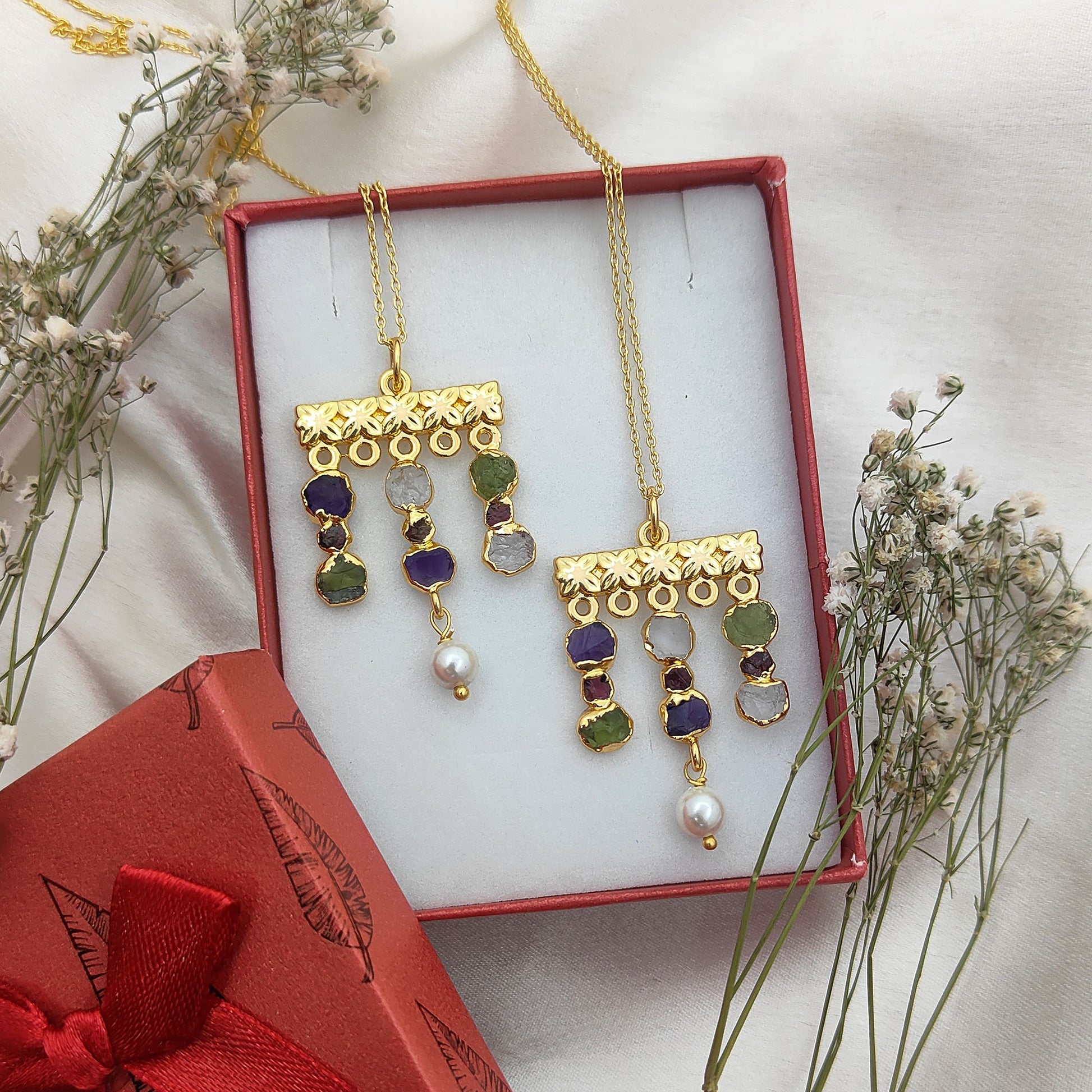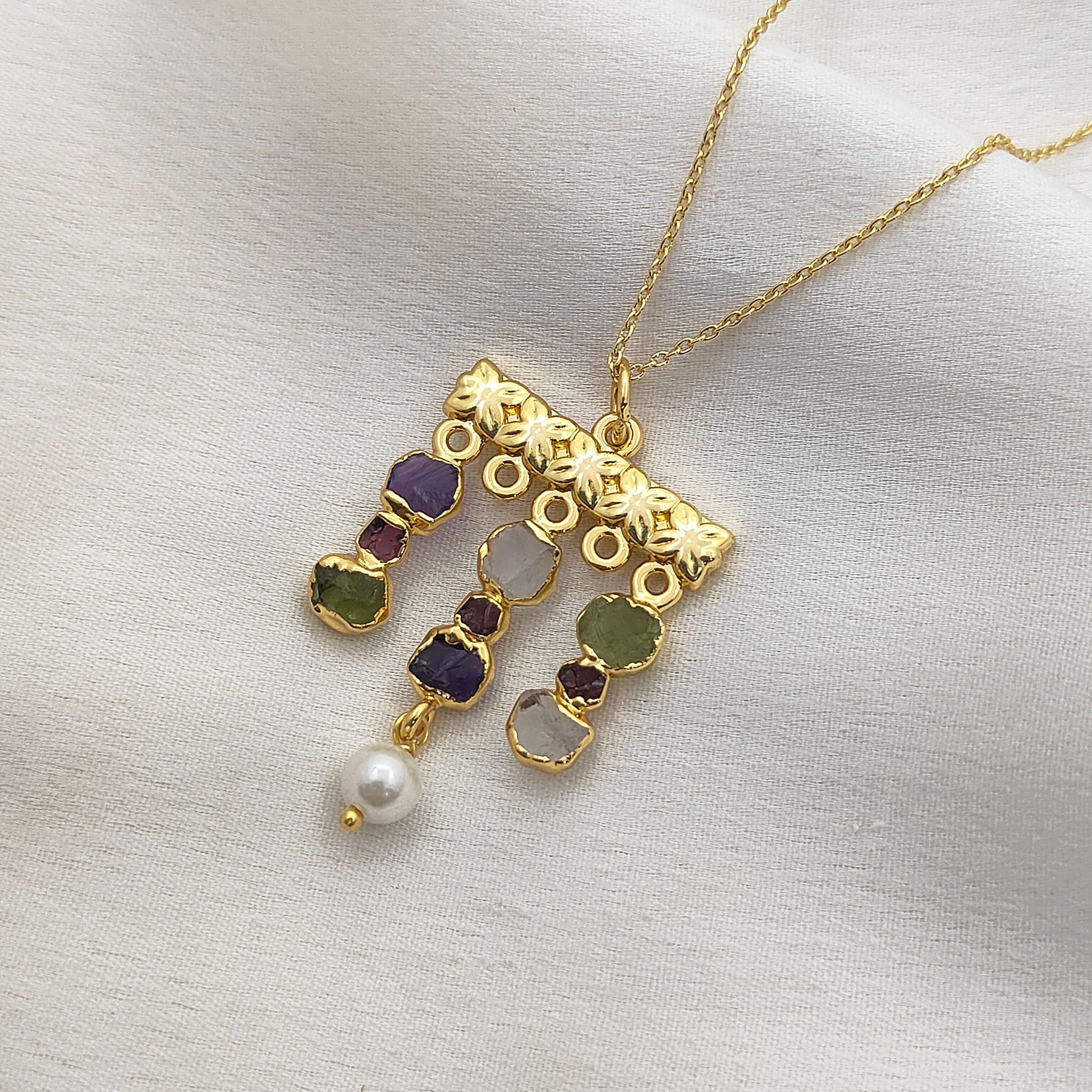Embrace free-spirited elegance with this handmade bohemian gemstone necklace, featuring a vibrant mix of raw Peridot and Garnet birthstones paired with lustrous freshwater pearls. Each stone is carefully chosen for its natural beauty and healing energy, making this piece both meaningful and stylish. The delicate gold-plated finish adds a touch of luxury, while the mix of textures creates a unique, earthy yet refined design. Perfect for layering or wearing solo, this necklace is a versatile accessory for everyday wear or special occasions.