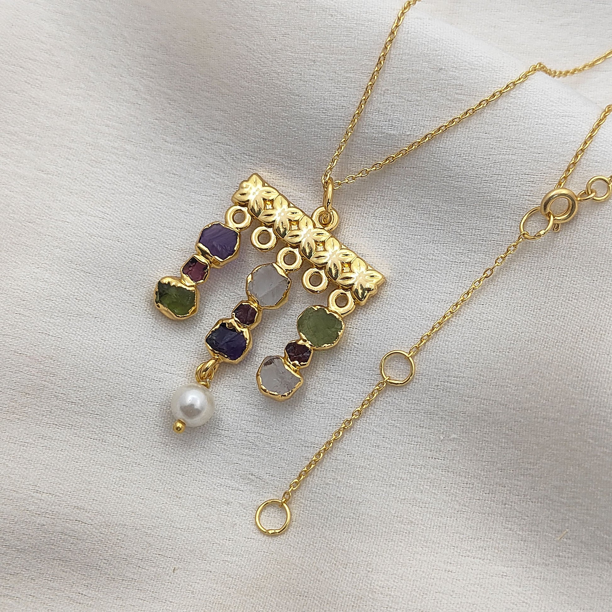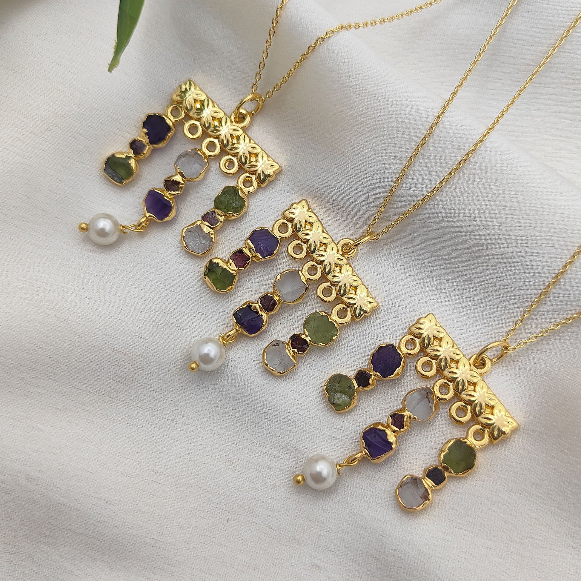 Garnet, Amethyst, Clear Quartz, Peridot, White Pearl |