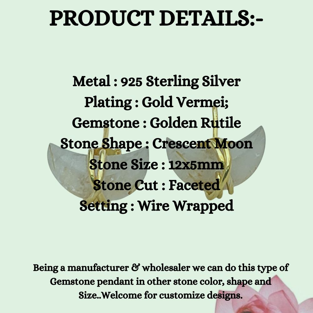 Dainty Golden Rutile Crescent Stud Earrings Gold Plated Half Moon Gemstone Jewelry for Women- Selling Per Piece