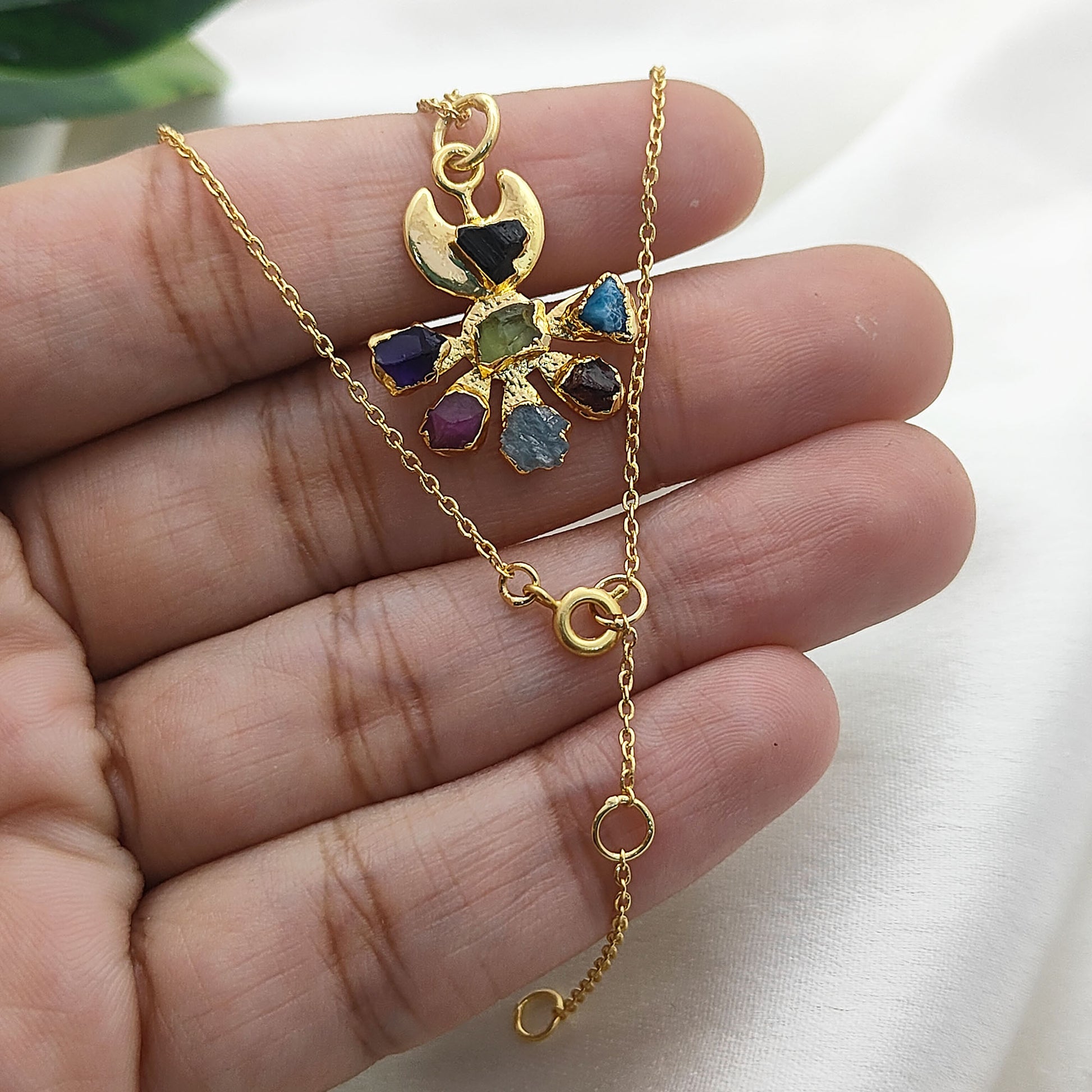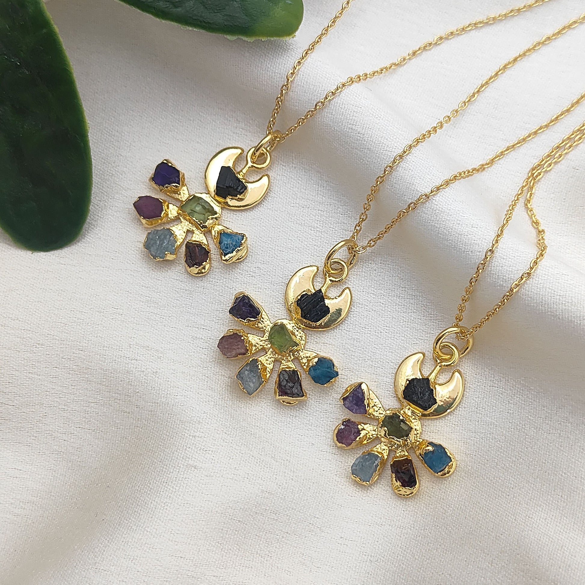 Add a touch of celestial charm and natural beauty to your style with this Floral Crescent Moon Necklace, delicately handcrafted with raw multicolor gemstones. Each stone is carefully chosen for its vibrant energy and birthstone significance, making this necklace not only a stunning accessory but also a meaningful keepsake.