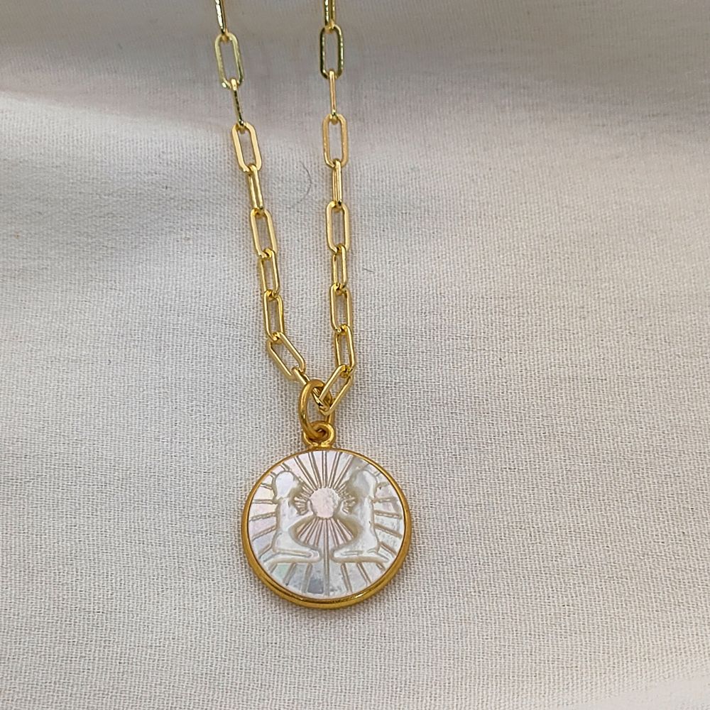 This beautifully crafted necklace showcases the Gemini zodiac symbol delicately inlaid with shimmering mother of pearl, set in a high-quality gold plated frame. The pendant hangs gracefully from a trendy gold plated paperclip chain, blending celestial charm with modern design for everyday wear.