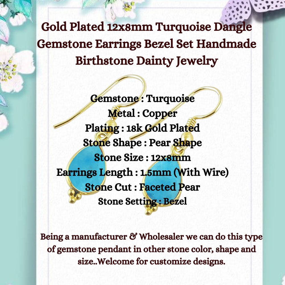 Gold Plated 12x8mm Turquoise Dangle Gemstone Earrings Bezel Set Handmade Birthstone Dainty Jewelry- Selling Per Pair