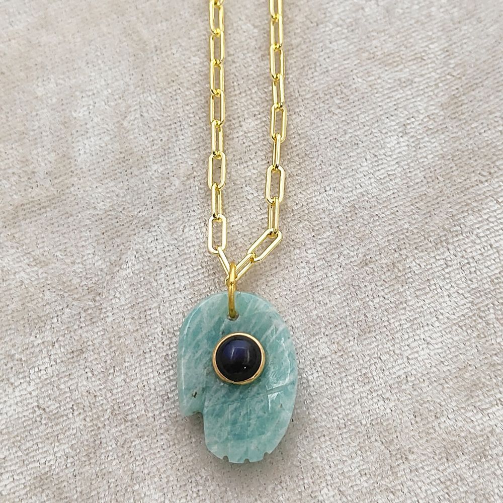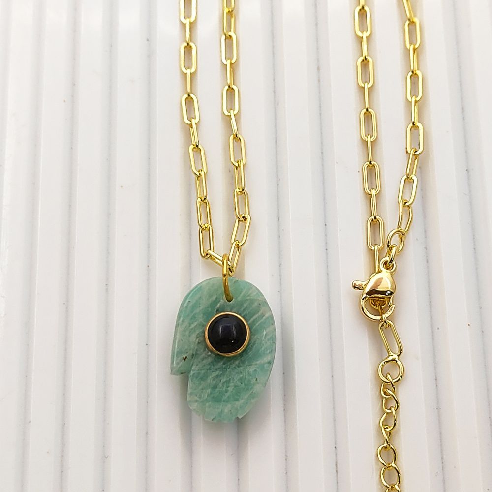 Add a touch of Bohemian elegance to your jewelry collection with this handmade Hamsa Hand necklace featuring a genuine Amazonite gemstone pendant. Crafted with a gold plated paperclip chain, this spiritual jewelry piece symbolizes protection, positivity, and good energy. Perfect as a meaningful gift for women on birthdays, anniversaries, or any special occasion.