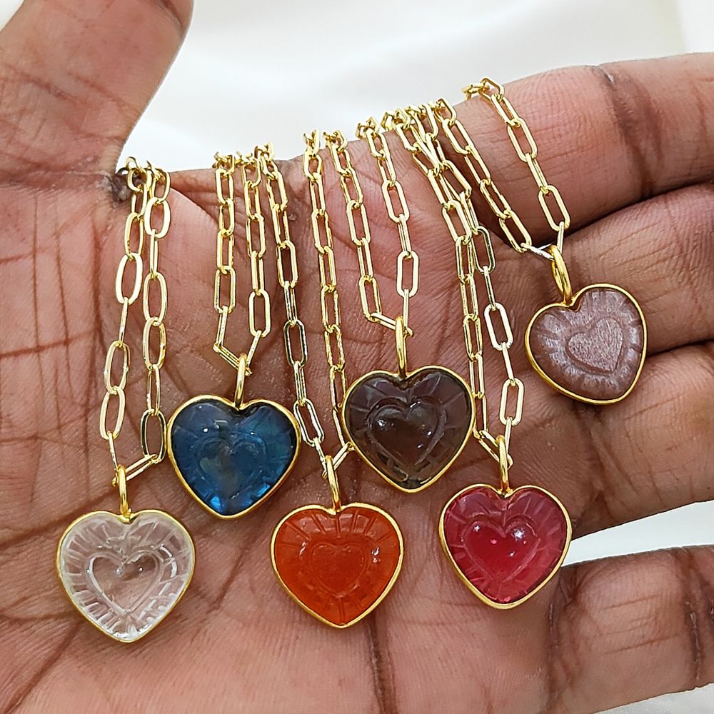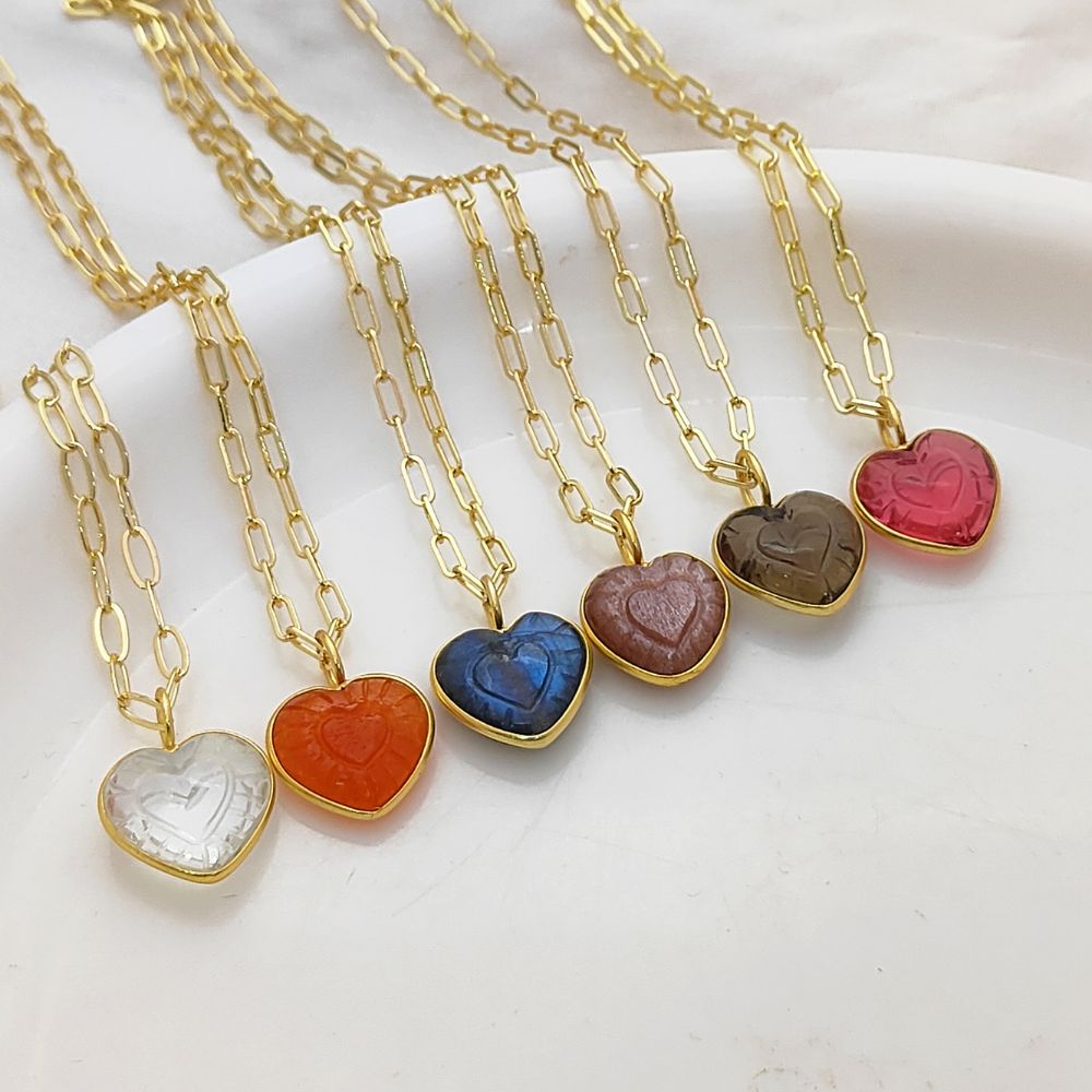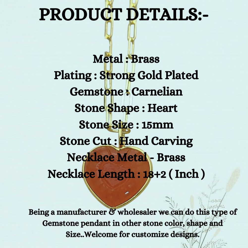 Gold Plated Paperclip Chain Necklace with Hand-Carved Carnelian Heart Gemstone Jewelry Gift- Selling Per Piece