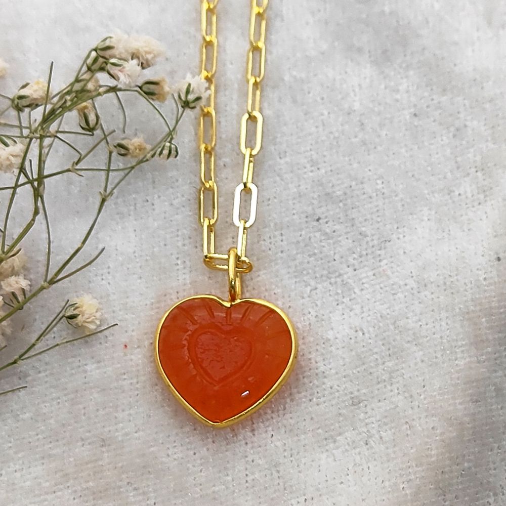Radiate confidence and warmth with this hand-carved Carnelian heart necklace, set on a stylish gold plated paperclip chain. Carnelian, with its vibrant orange-red hues, is known as the stone of courage, vitality, and creativity, making it a meaningful piece to wear every day.