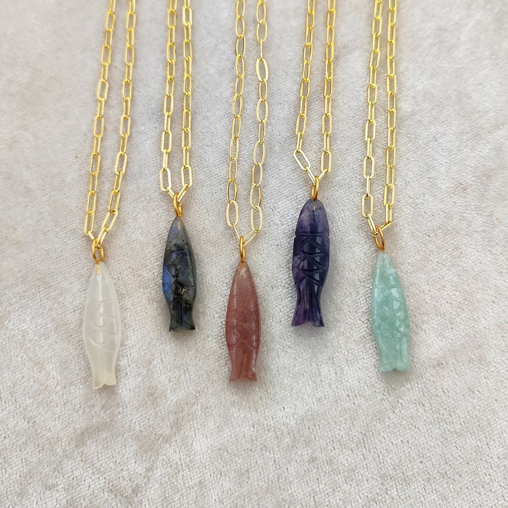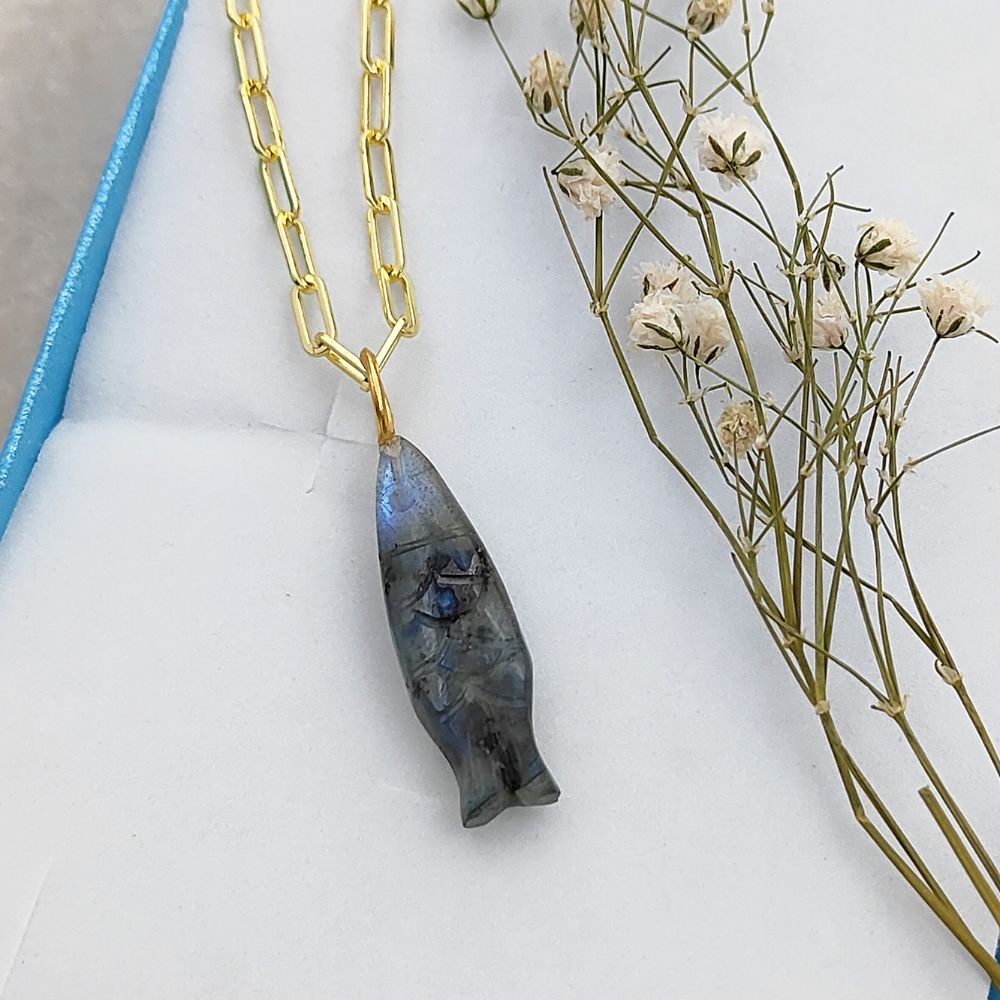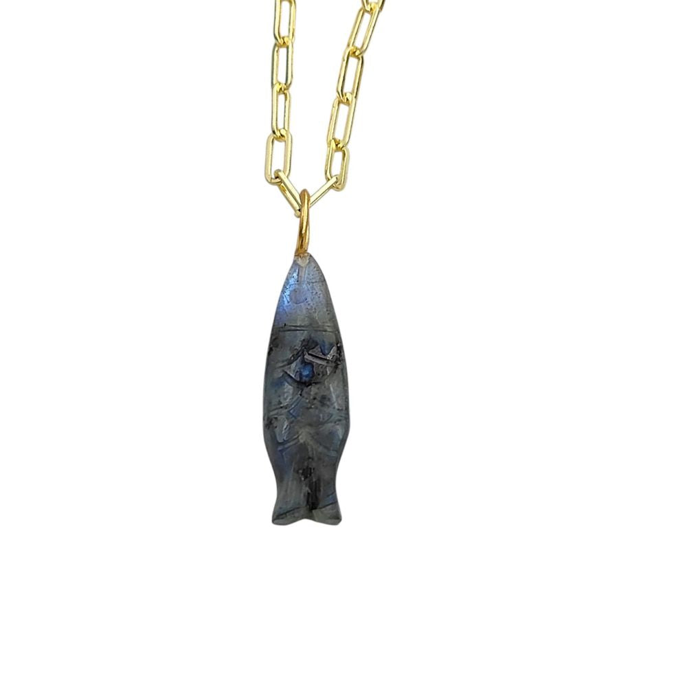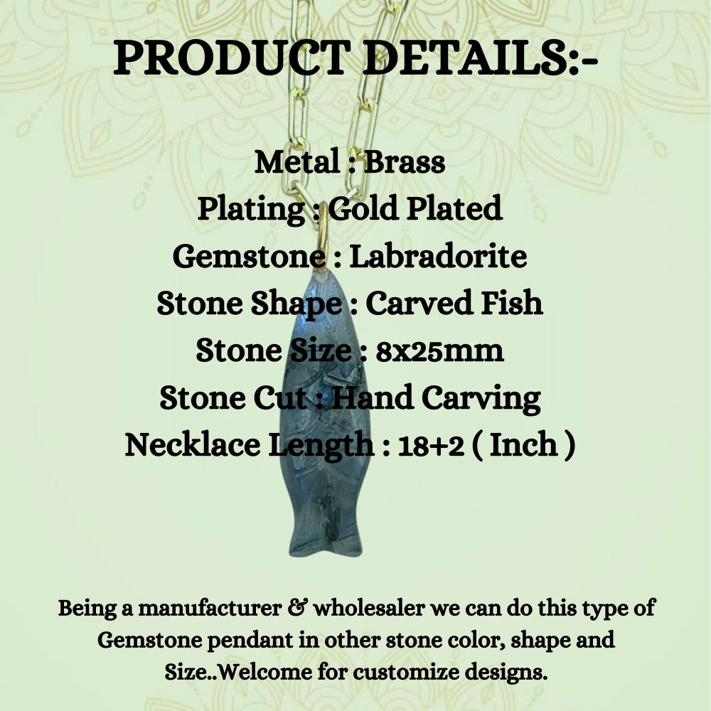 Hand-Carved Labradorite Fish Pendant for Necklace Gold Plated Paperclip Chain Spiritual Jewelry Gift- Selling Per Piece