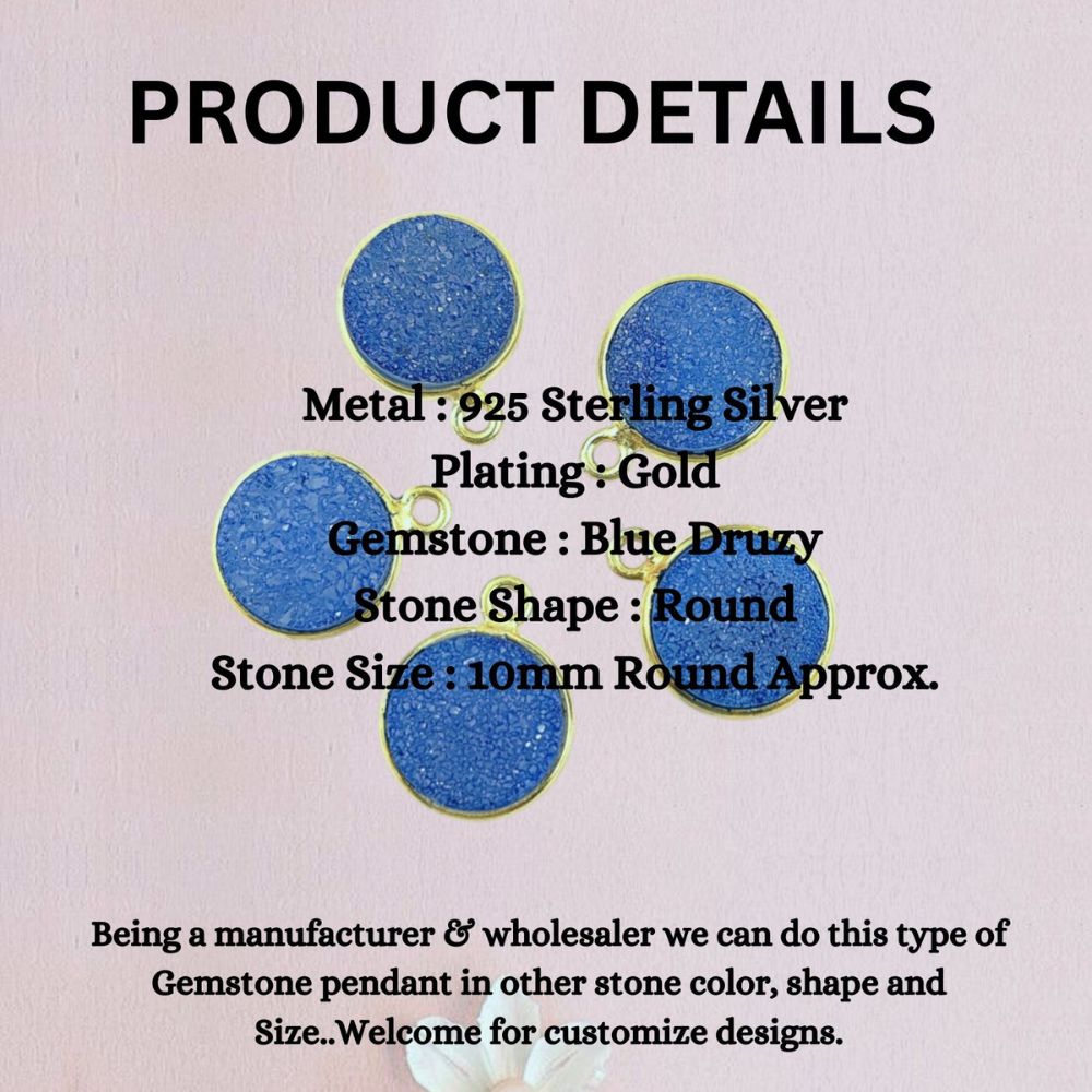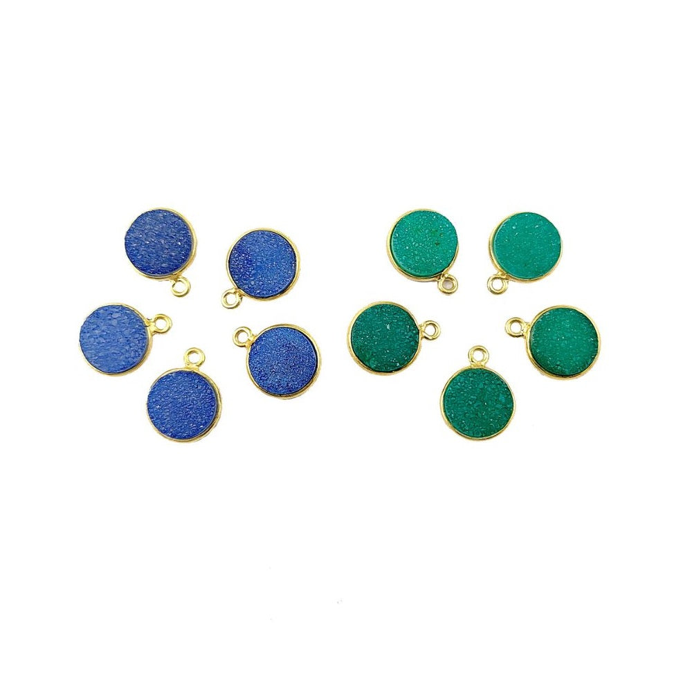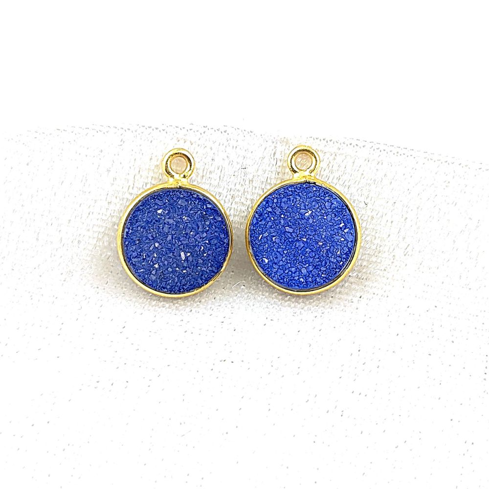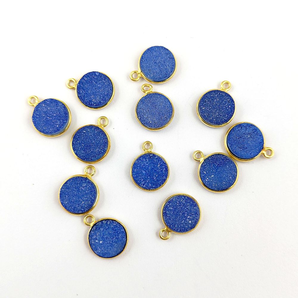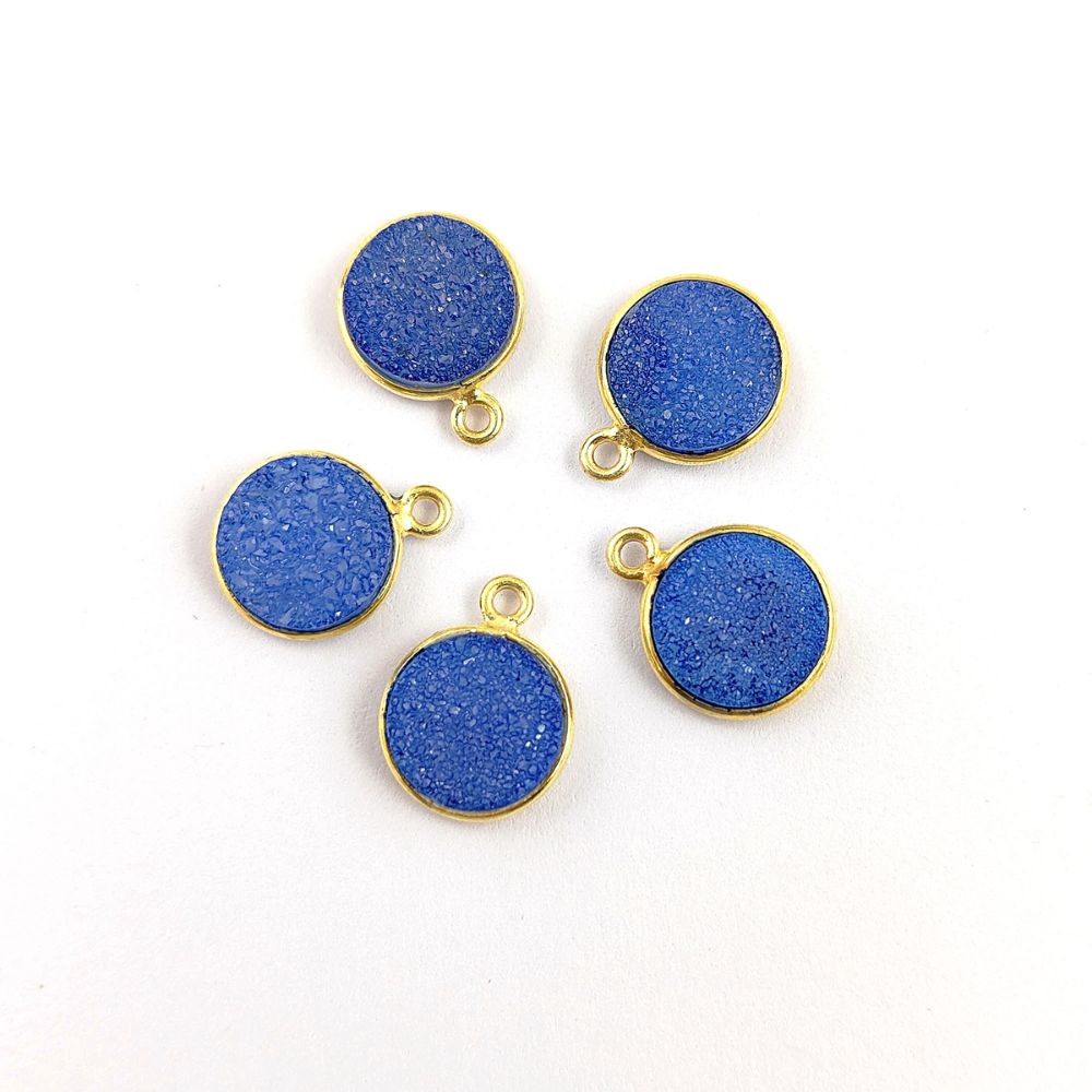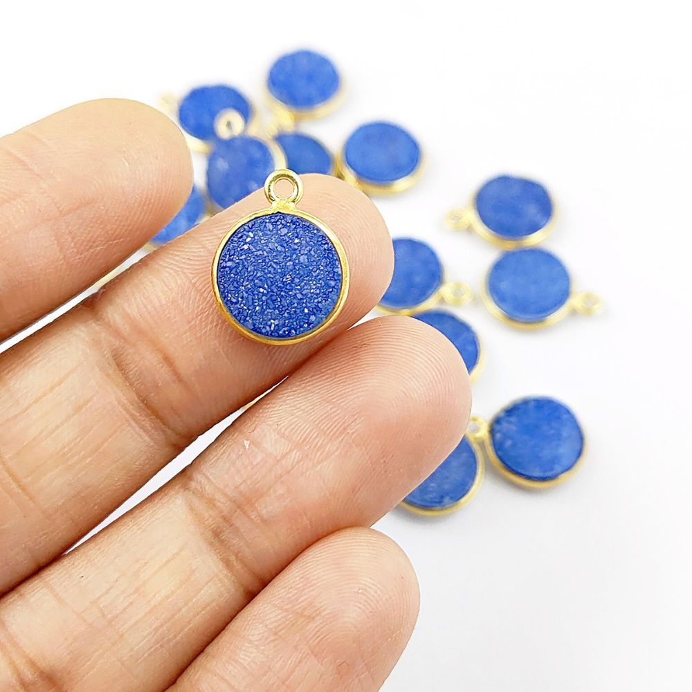 Handcrafted Blue Druzy Round Pendant Gold Plated Gemstone Charm for Boho & Healing Jewelry- Selling Per Piece