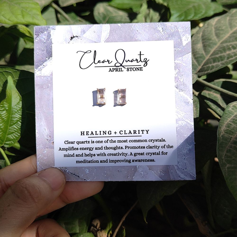 Elevate your accessory game with these handcrafted clear quartz stud earrings. Set in gold-plated 925 sterling silver, these dainty earrings showcase the stunning clarity and brilliance of natural clear quartz, making them a versatile addition to any jewelry collection. An ideal gift for birthdays, anniversaries, or just because! Beautifully packaged and ready for gifting.