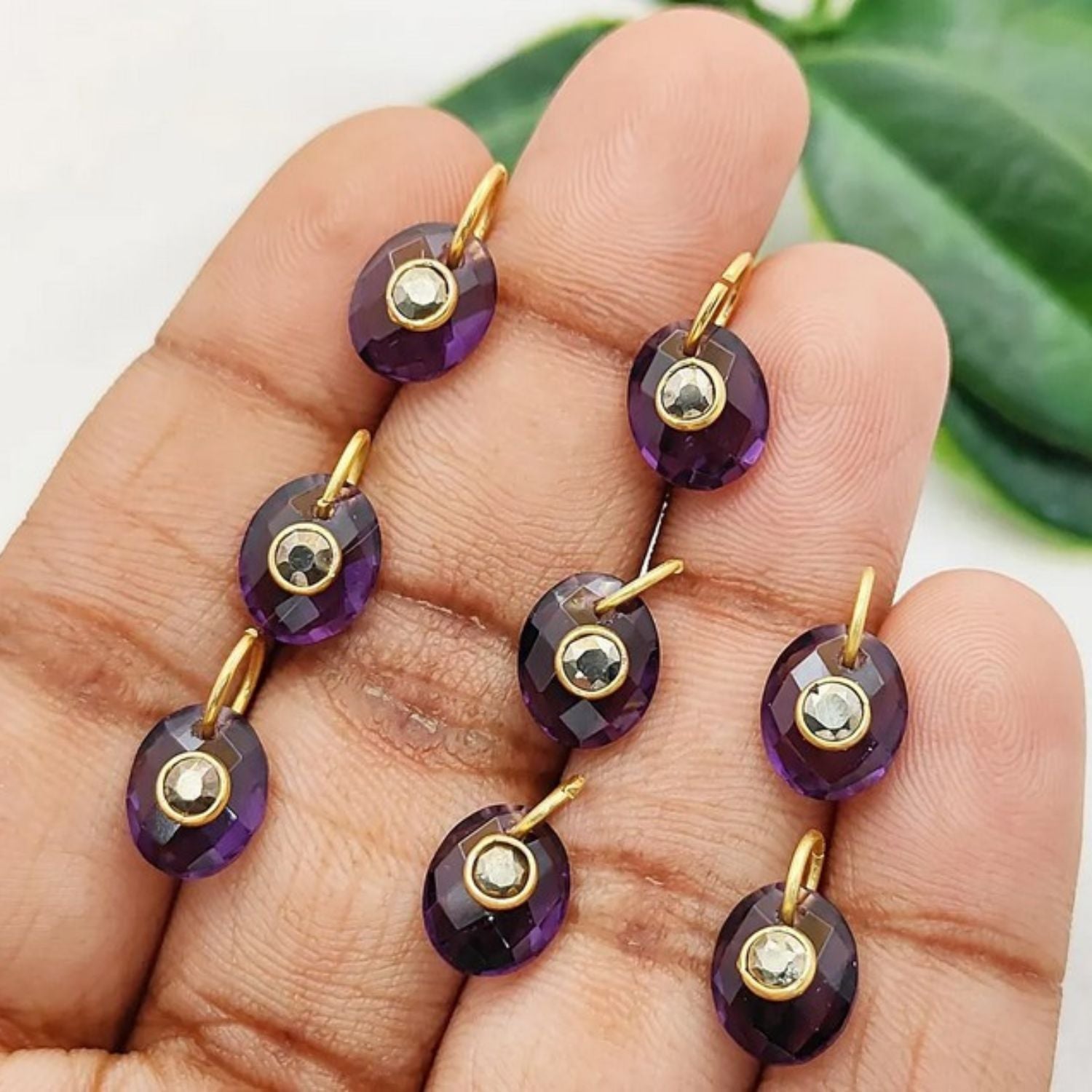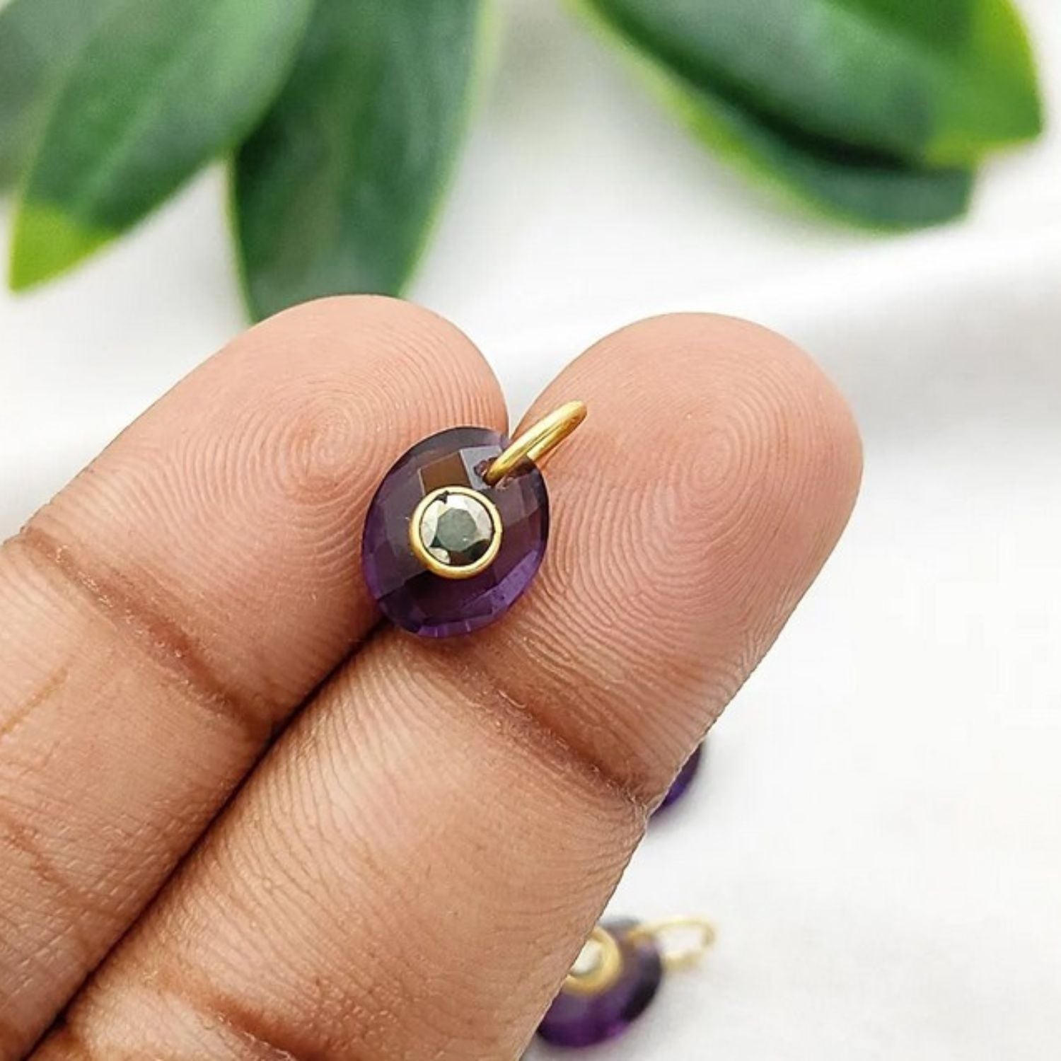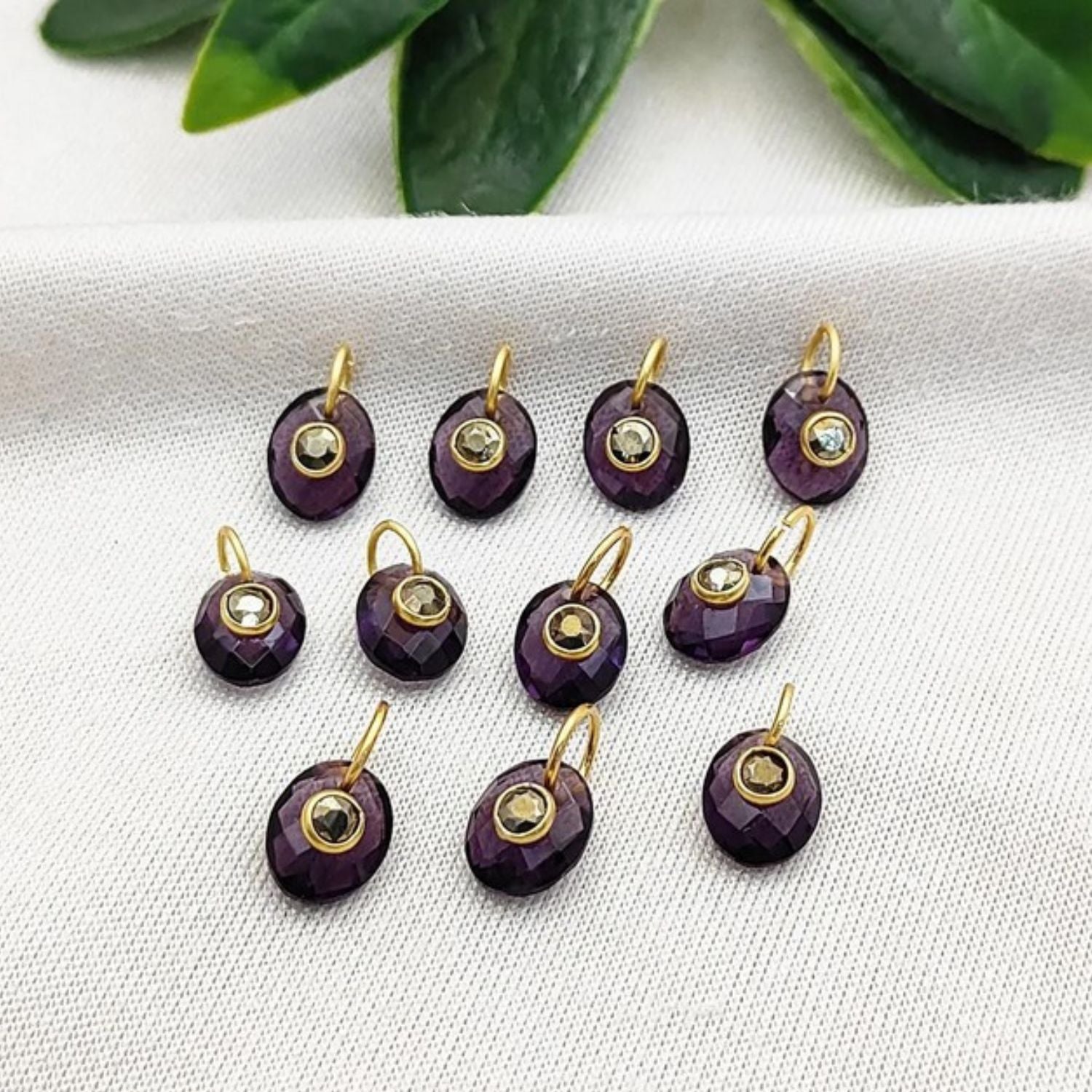 Add a unique touch to your creations with this handcrafted double gemstone pendant featuring Amethyst and Moss Agate. Set in a gold plated bezel, this dual-stone charm beautifully combines the soothing purple hues of amethyst with the earthy green patterns of moss agate. Perfect for DIY necklaces, bracelets, earrings, or custom jewelry projects, this pendant brings together elegance and natural charm in one design.