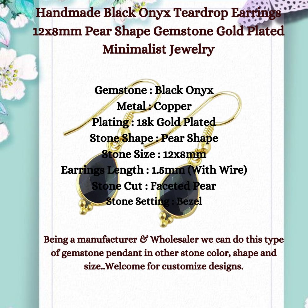 Handmade Black Onyx Teardrop Earrings 12x8mm Pear Shape Gemstone Gold Plated Minimalist Jewelry-Selling Per Pair