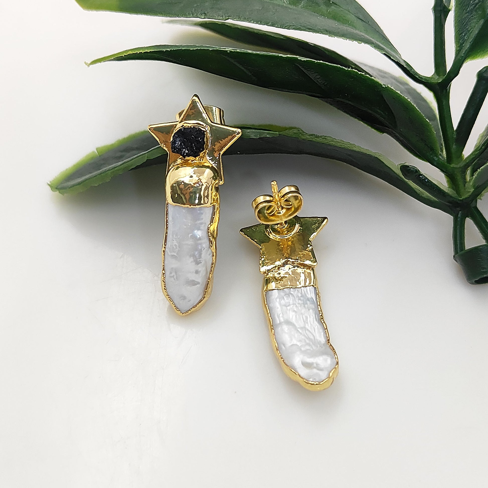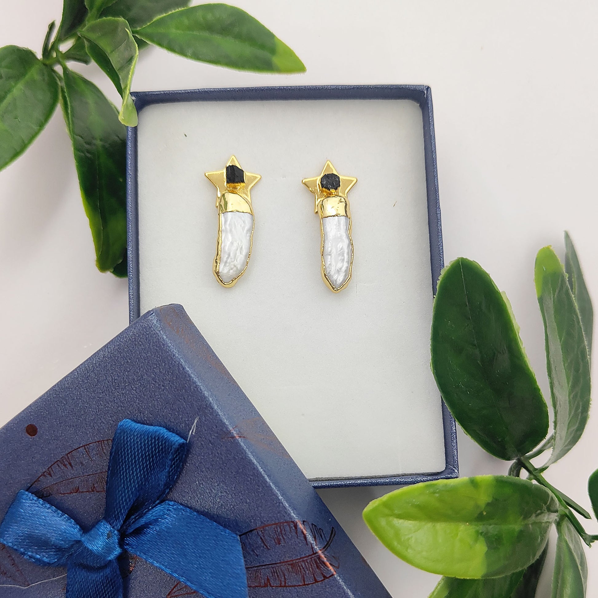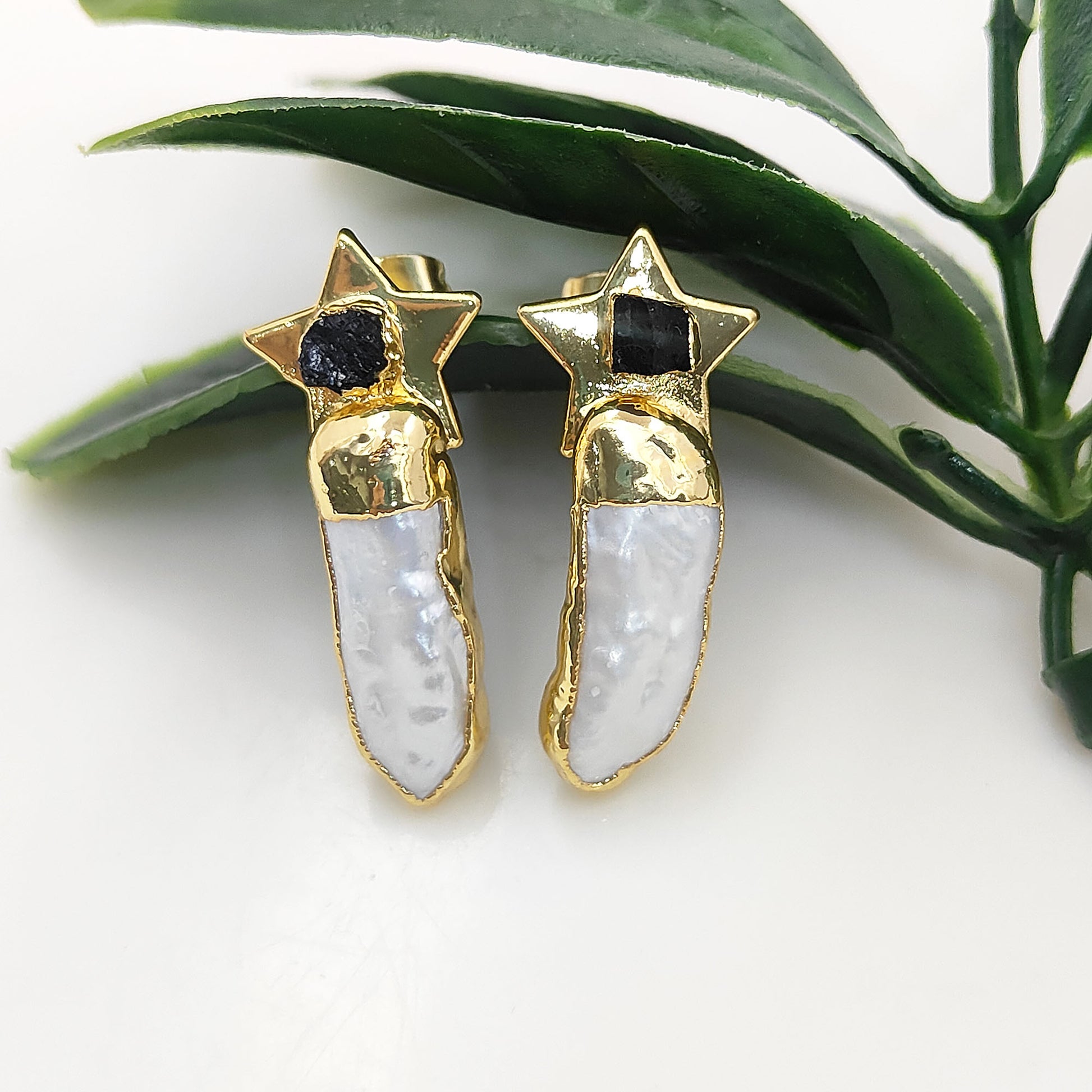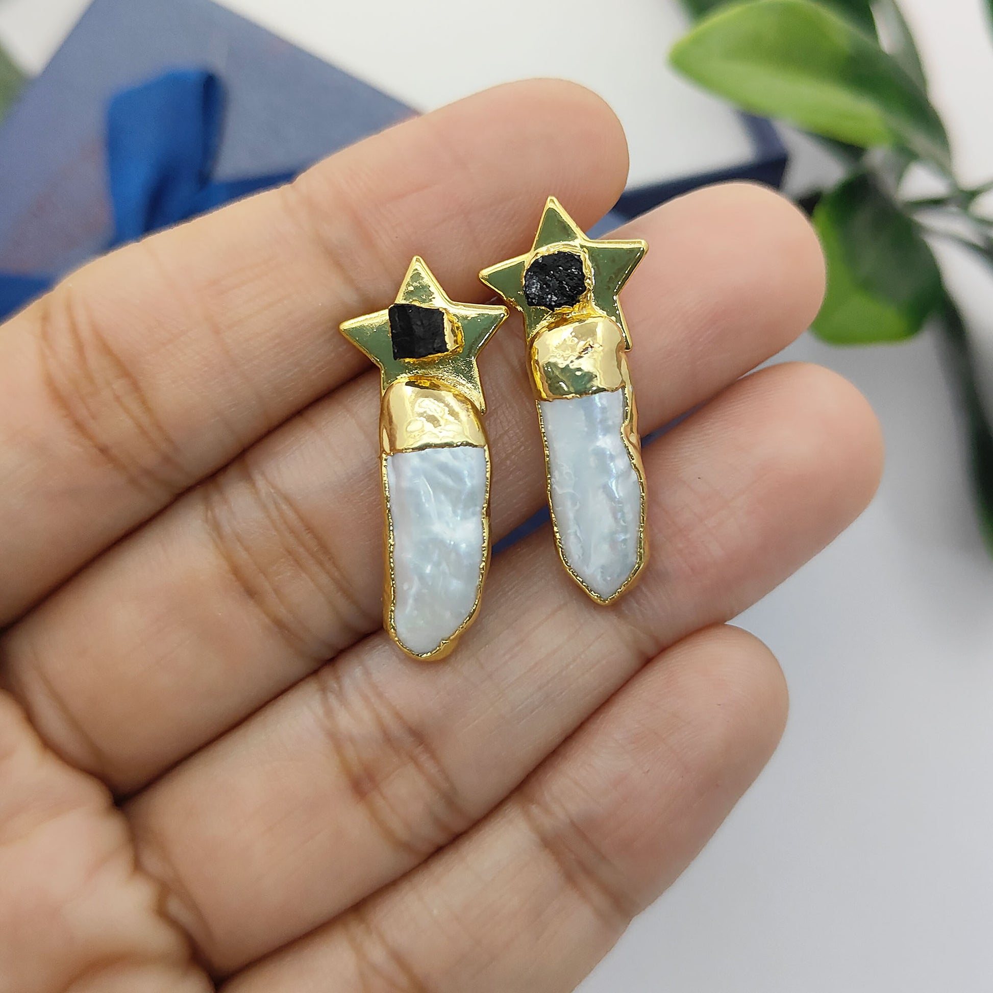 Handmade Black Tourmaline Star Earrings with White Freshwater Pearls Gold Plated Bridal Jewelry- Selling Per Pair