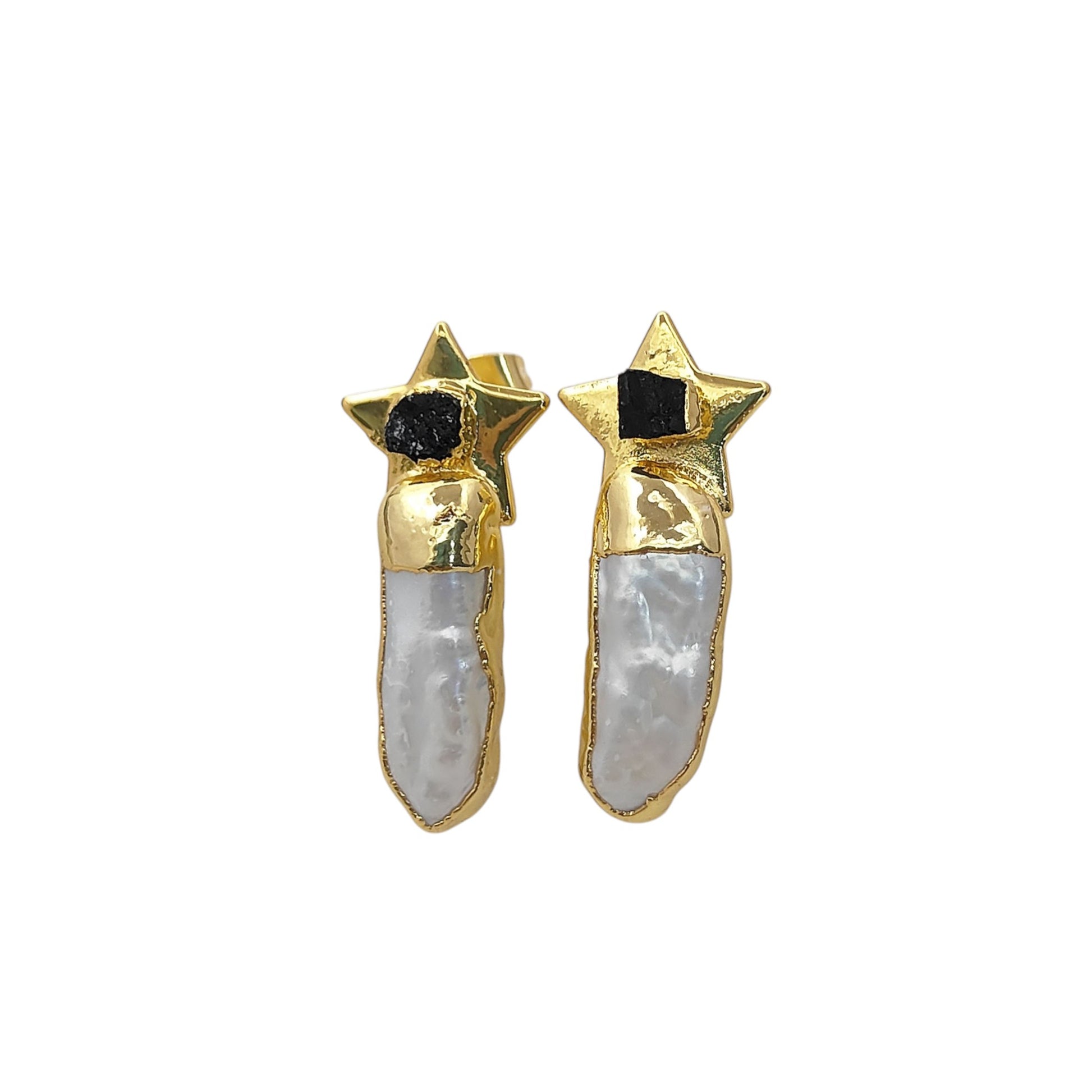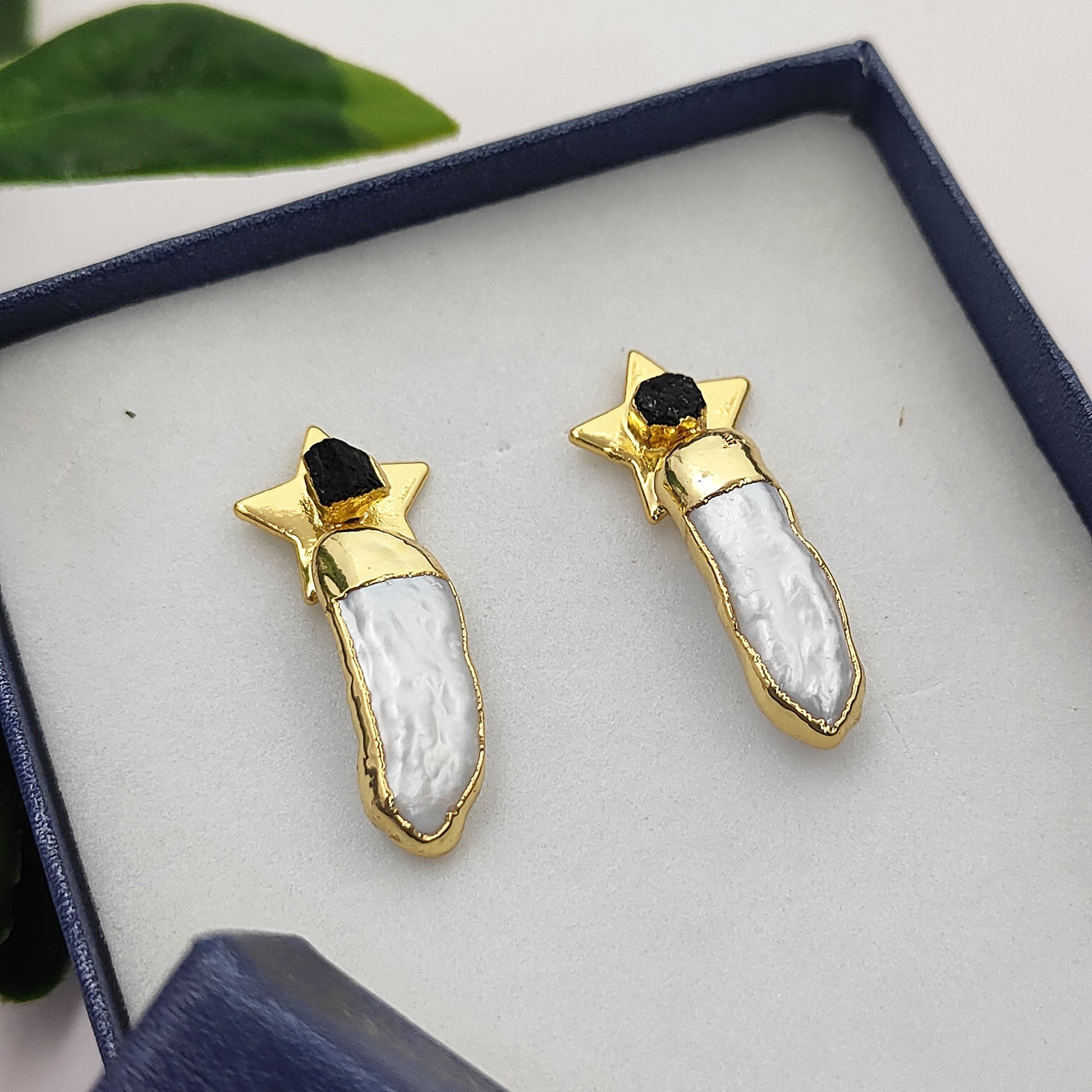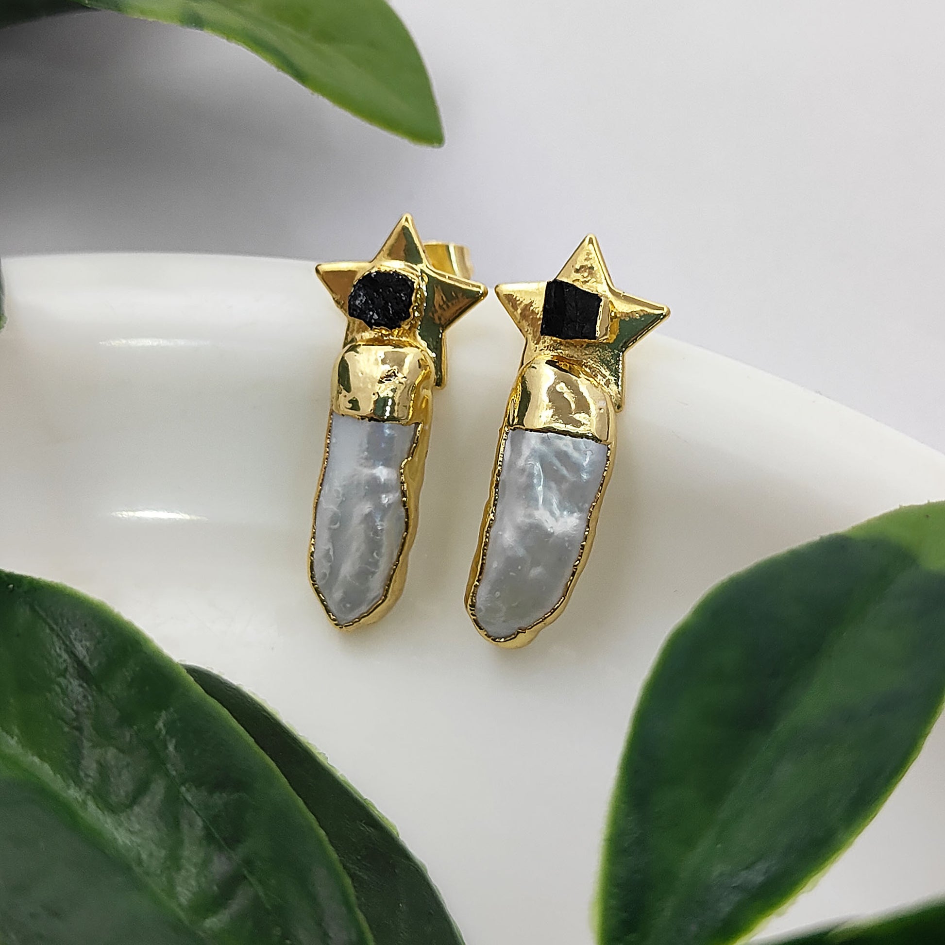 Handmade Black Tourmaline Star Earrings with White Freshwater Pearls Gold Plated Bridal Jewelry- Selling Per Pair
