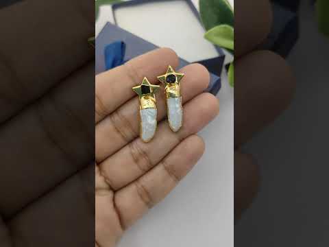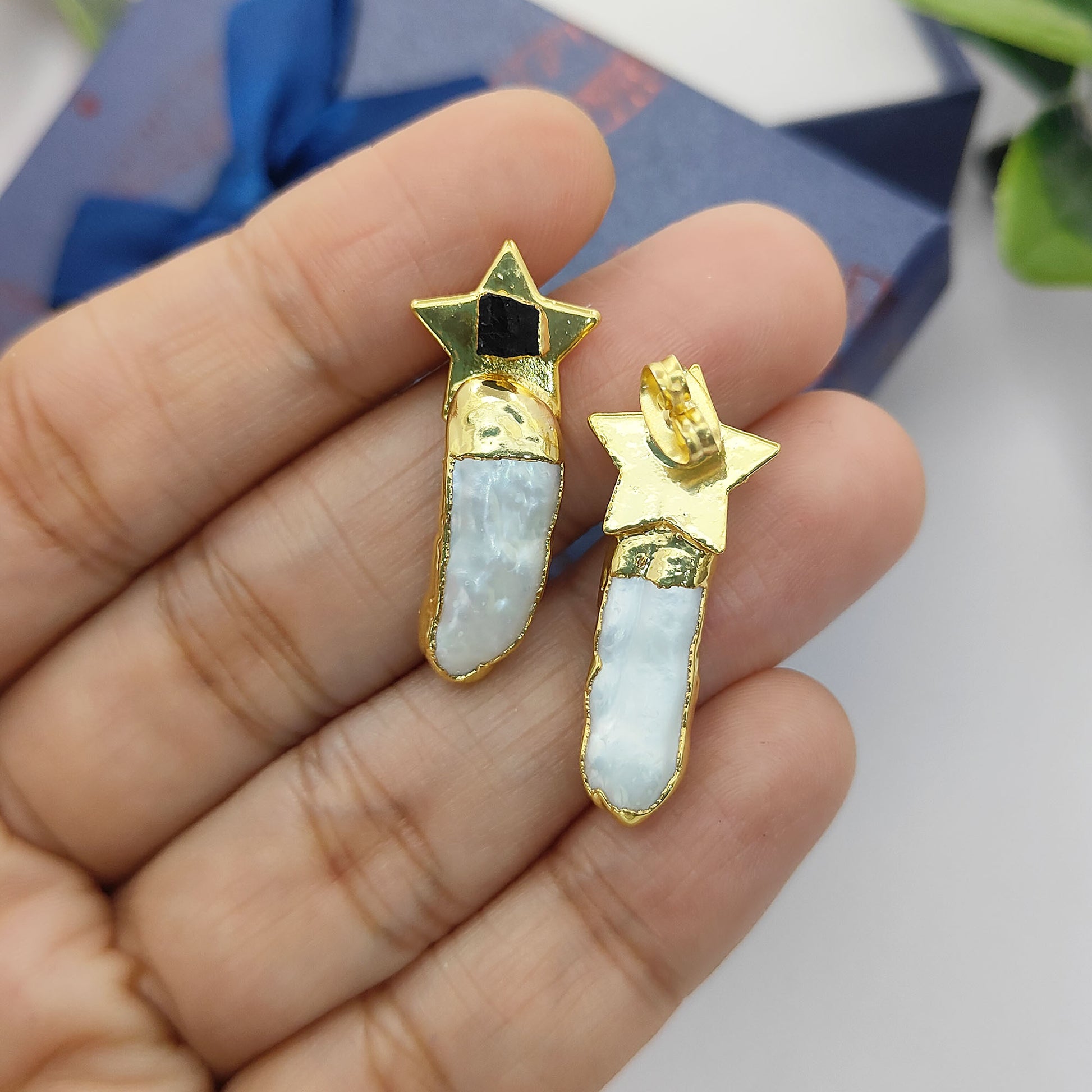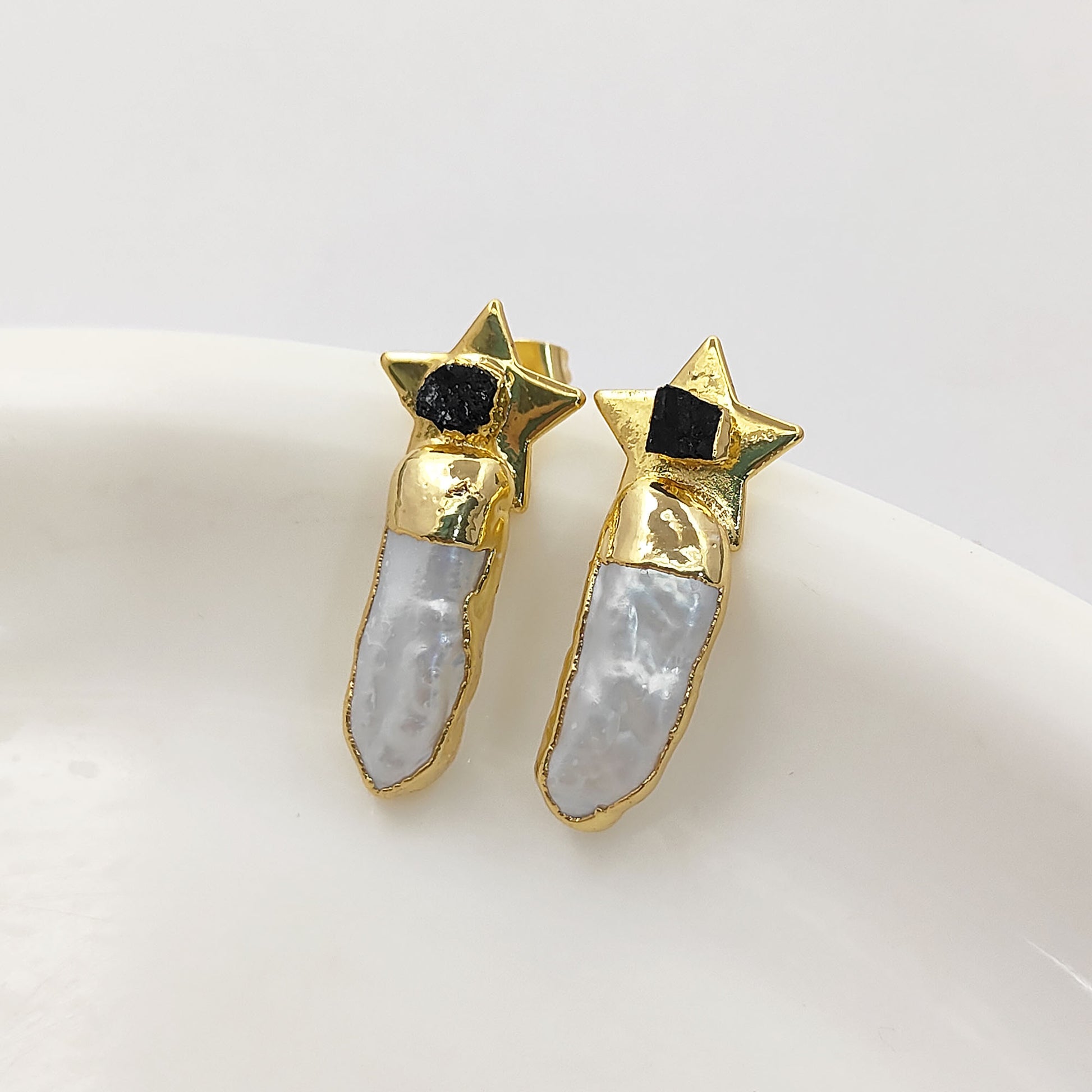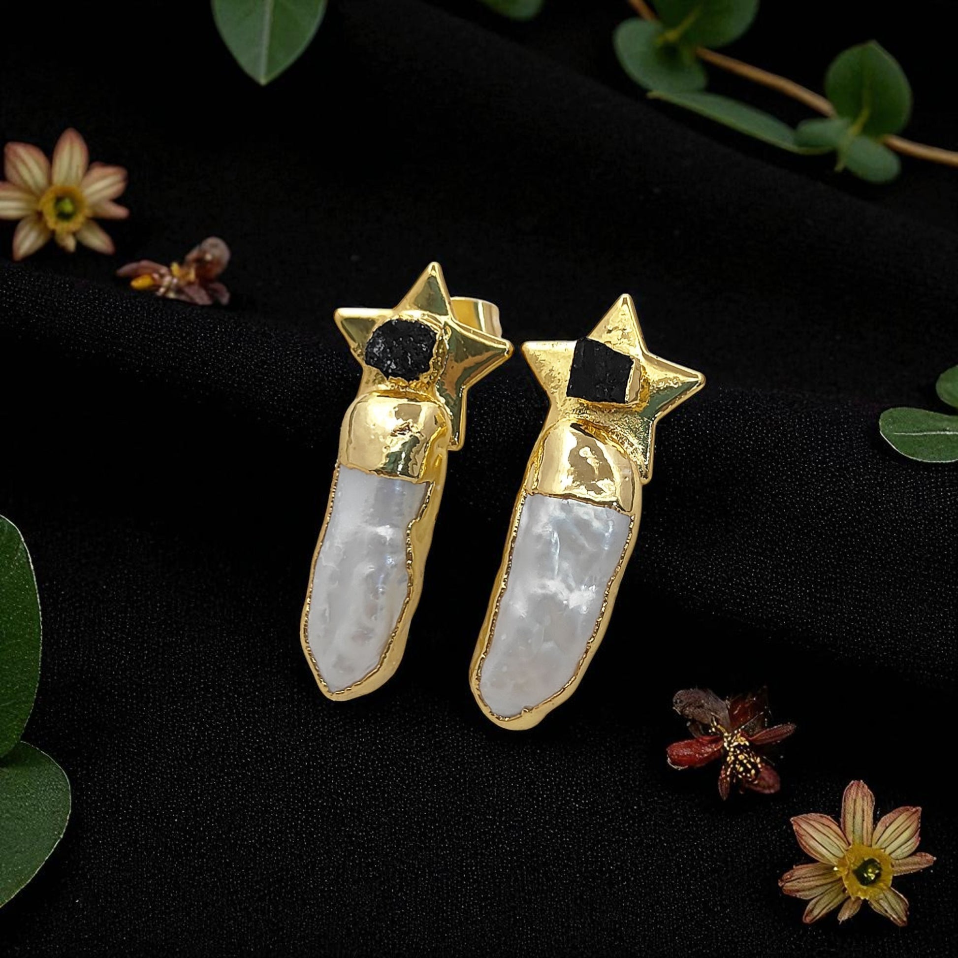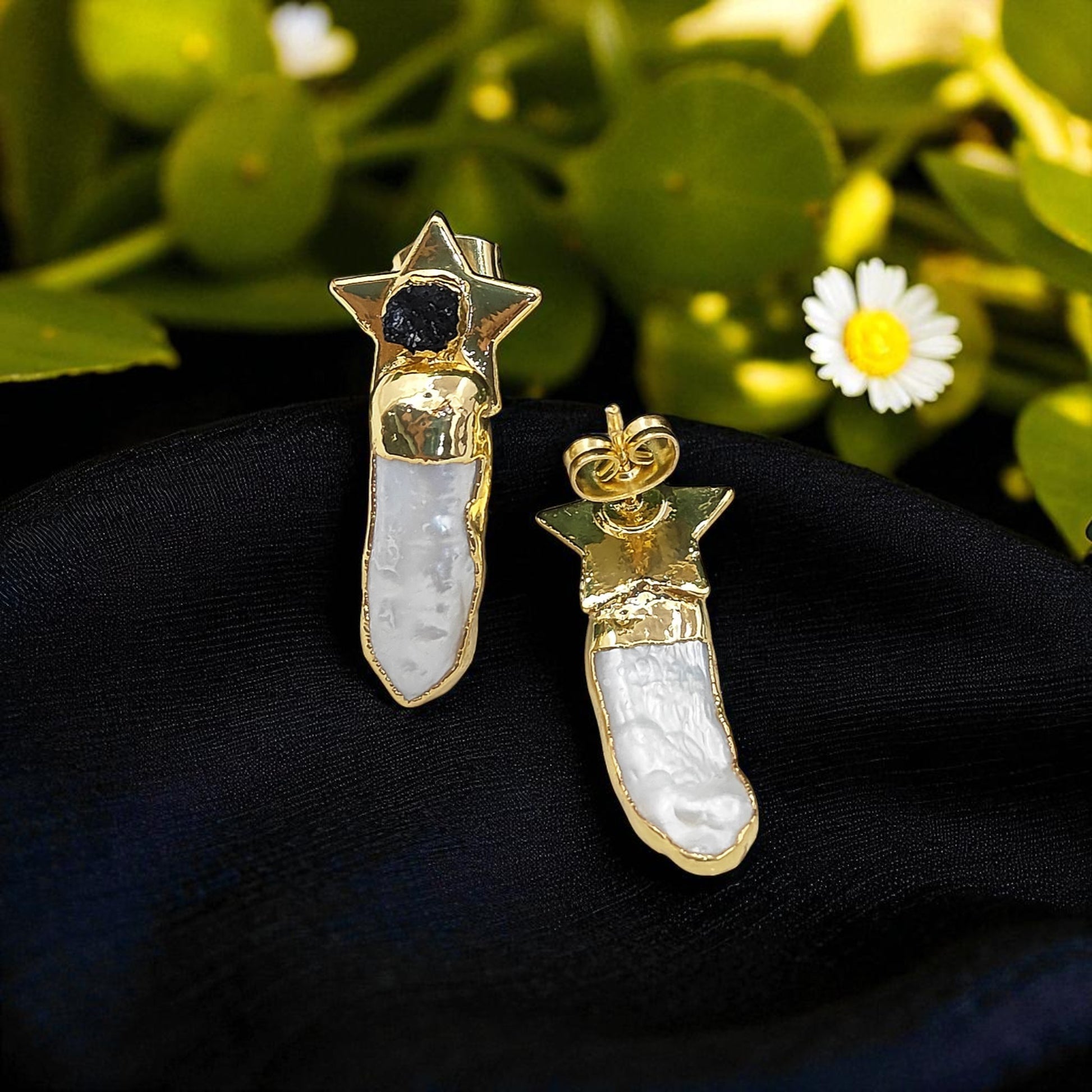Handmade Black Tourmaline Star Earrings with White Freshwater Pearls Gold Plated Bridal Jewelry- Selling Per Pair