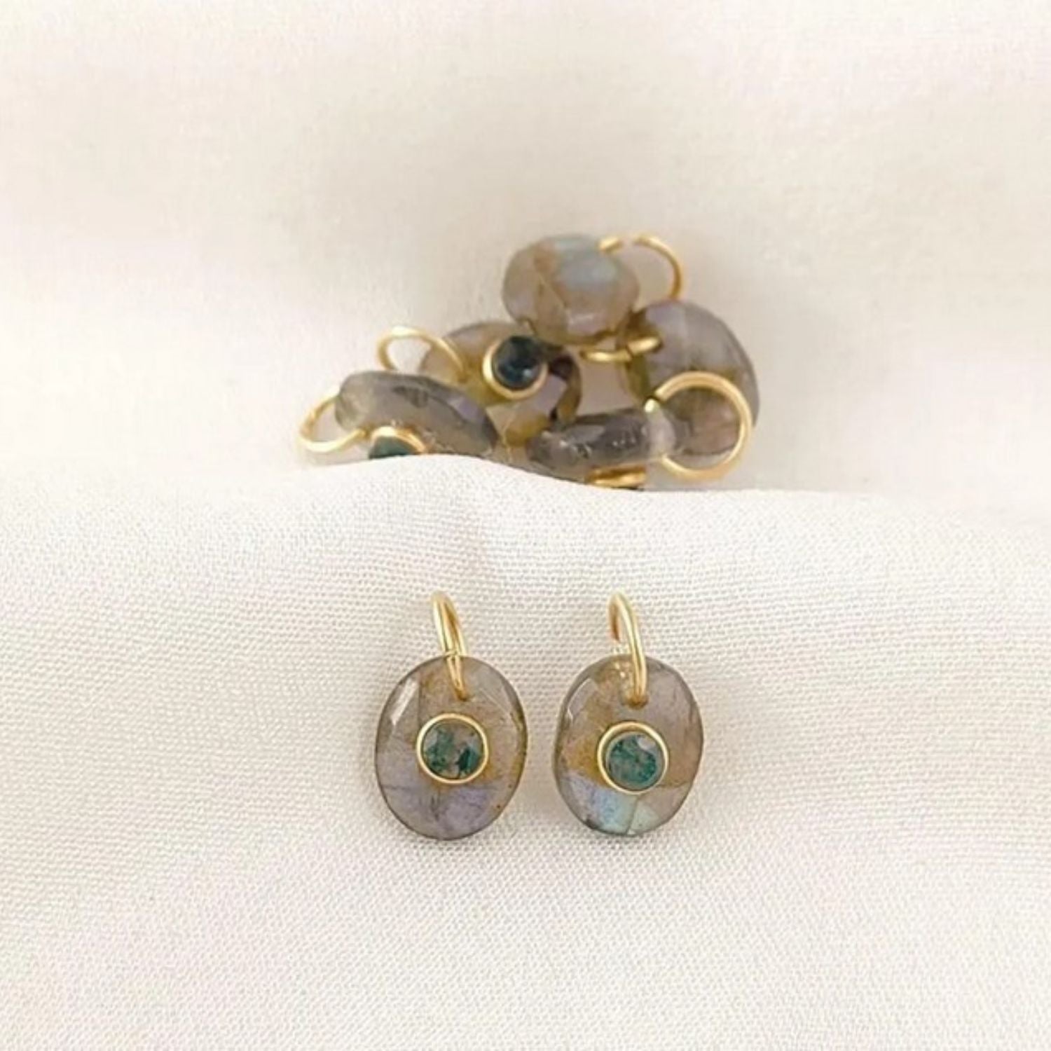 Add a touch of mystery and grounding elegance to your jewelry designs with this Handmade Blue Labradorite & Pyrite Pendant, crafted with care and set in a gold plated 925 sterling silver bezel. The pendant features an enchanting blue labradorite, known for its mesmerizing flashes of iridescent color, beautifully paired with the metallic shimmer of natural pyrite.