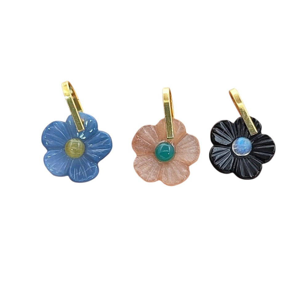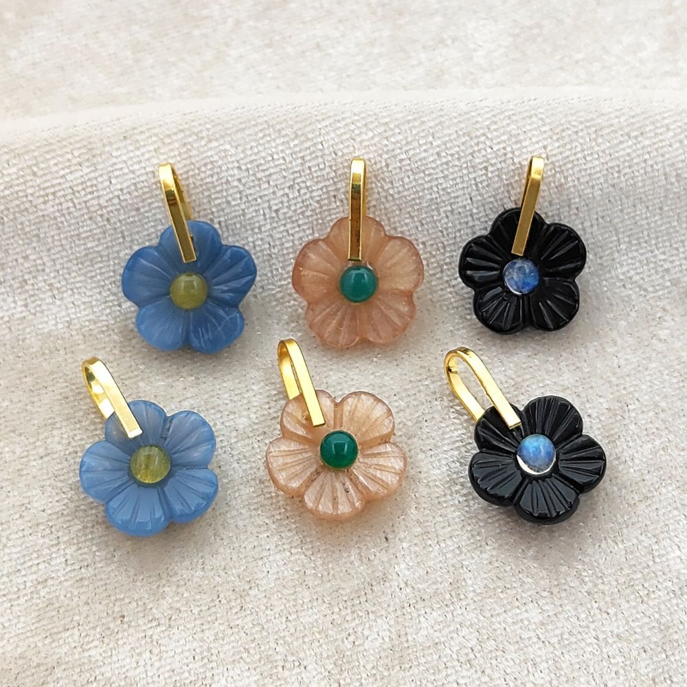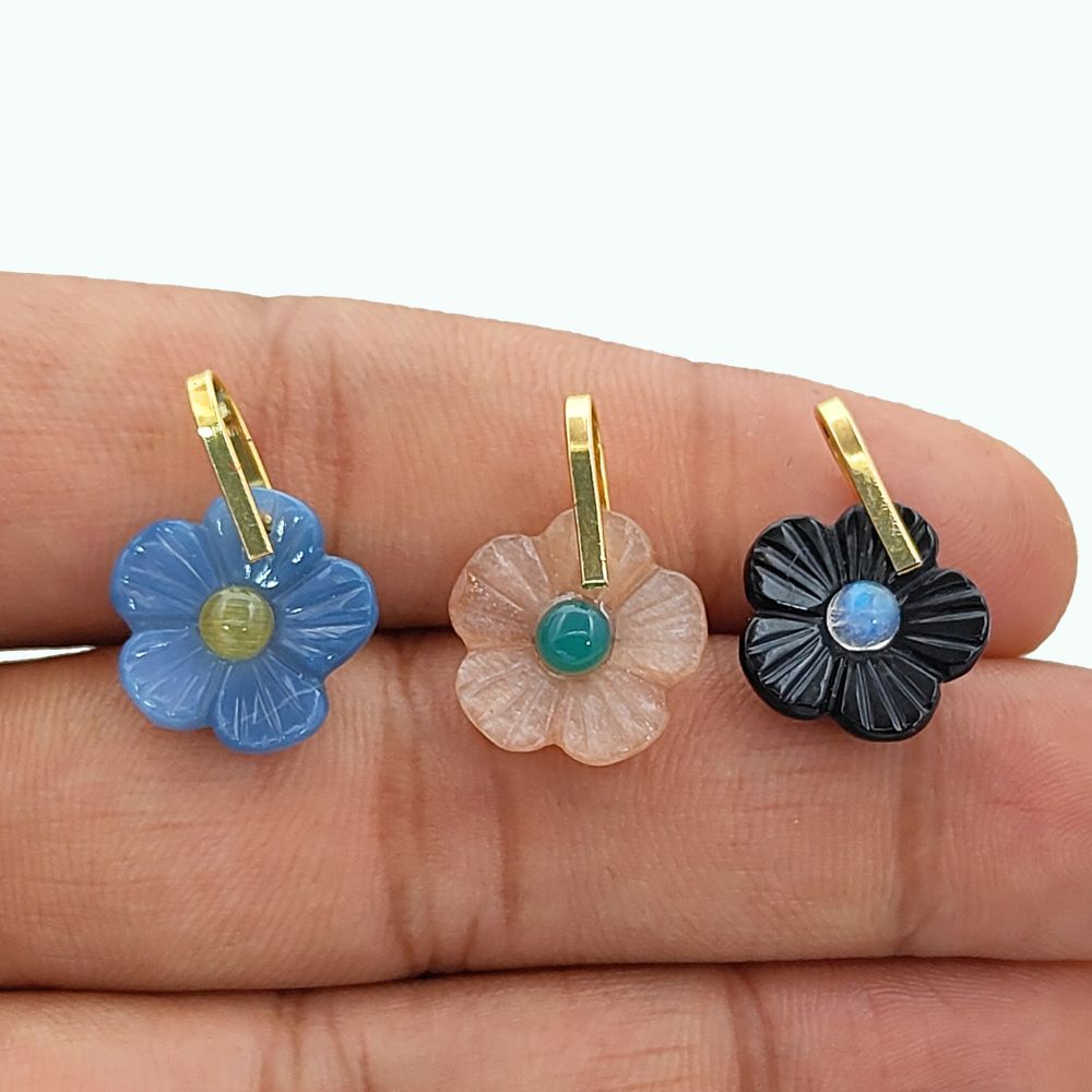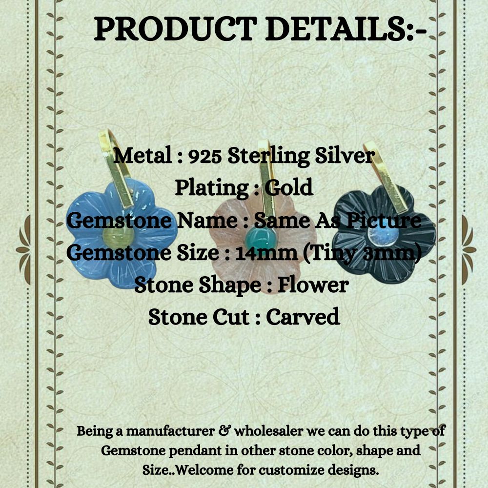 Handmade Carved Flower Gemstone Pendant Gold Plated Sterling Silver Healing Crystal Charm- Selling Per Piece
