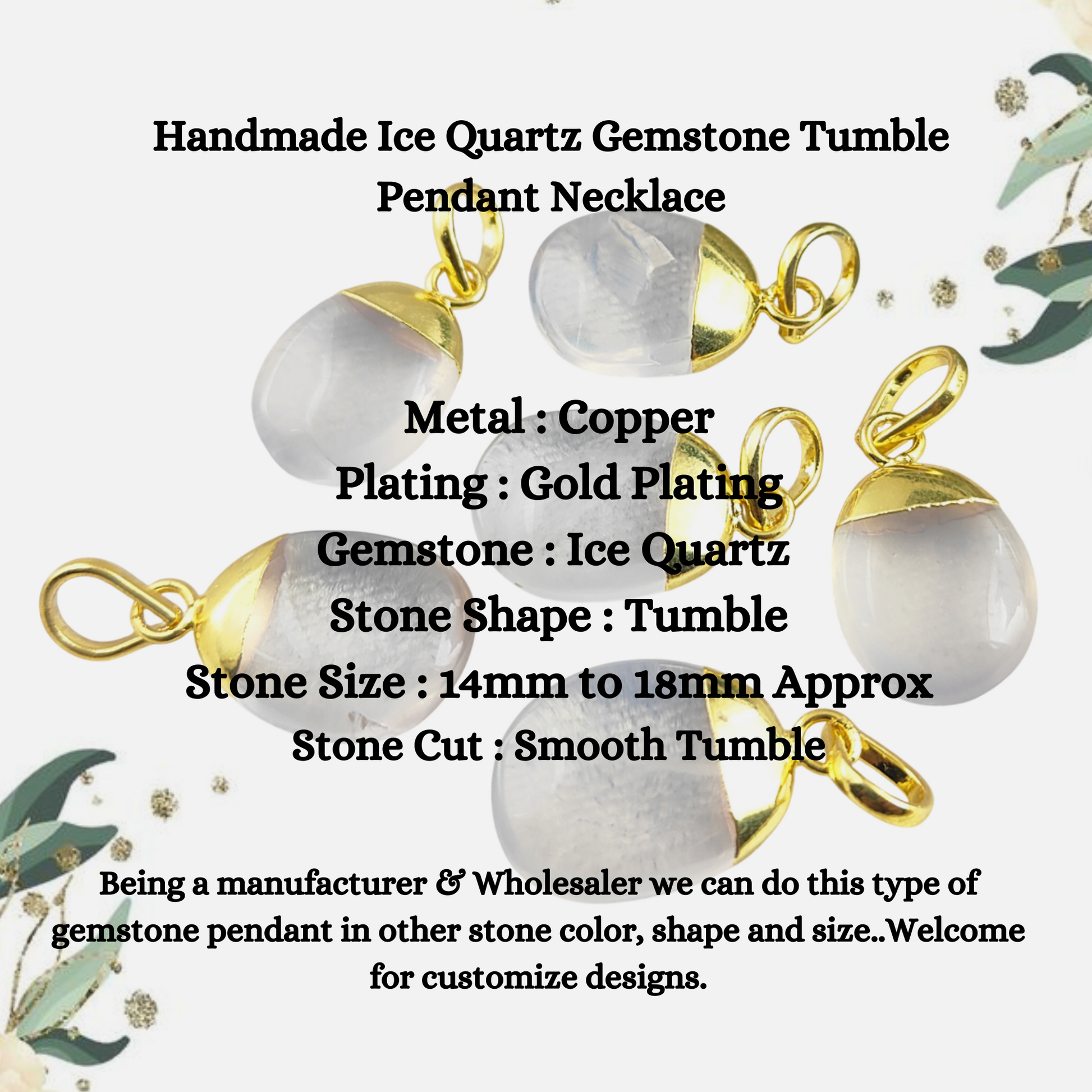 Elevate your jewelry collection with our Handmade Ice Quartz Gemstone Tumble Pendant Necklace. Each pendant features a stunning ice quartz stone, known for its clarity and natural beauty, beautifully gold electroplated to enhance its elegance. This dainty necklace is perfect for everyday wear or special occasions, making it a thoughtful gift for yourself or someone special.