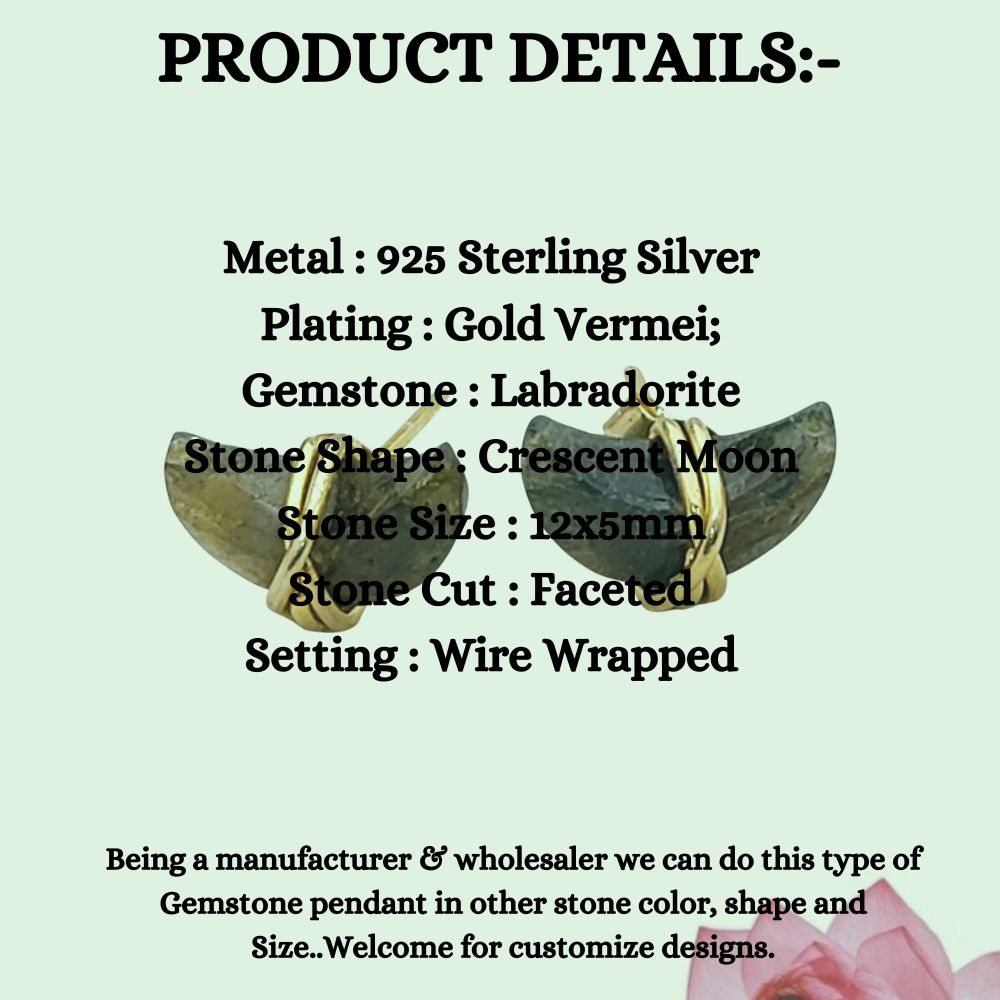 Labradorite Crescent Stud Earrings Dainty Handmade Gold Plated Sterling Silver Half Moon Jewelry Gift- Selling Per Piece