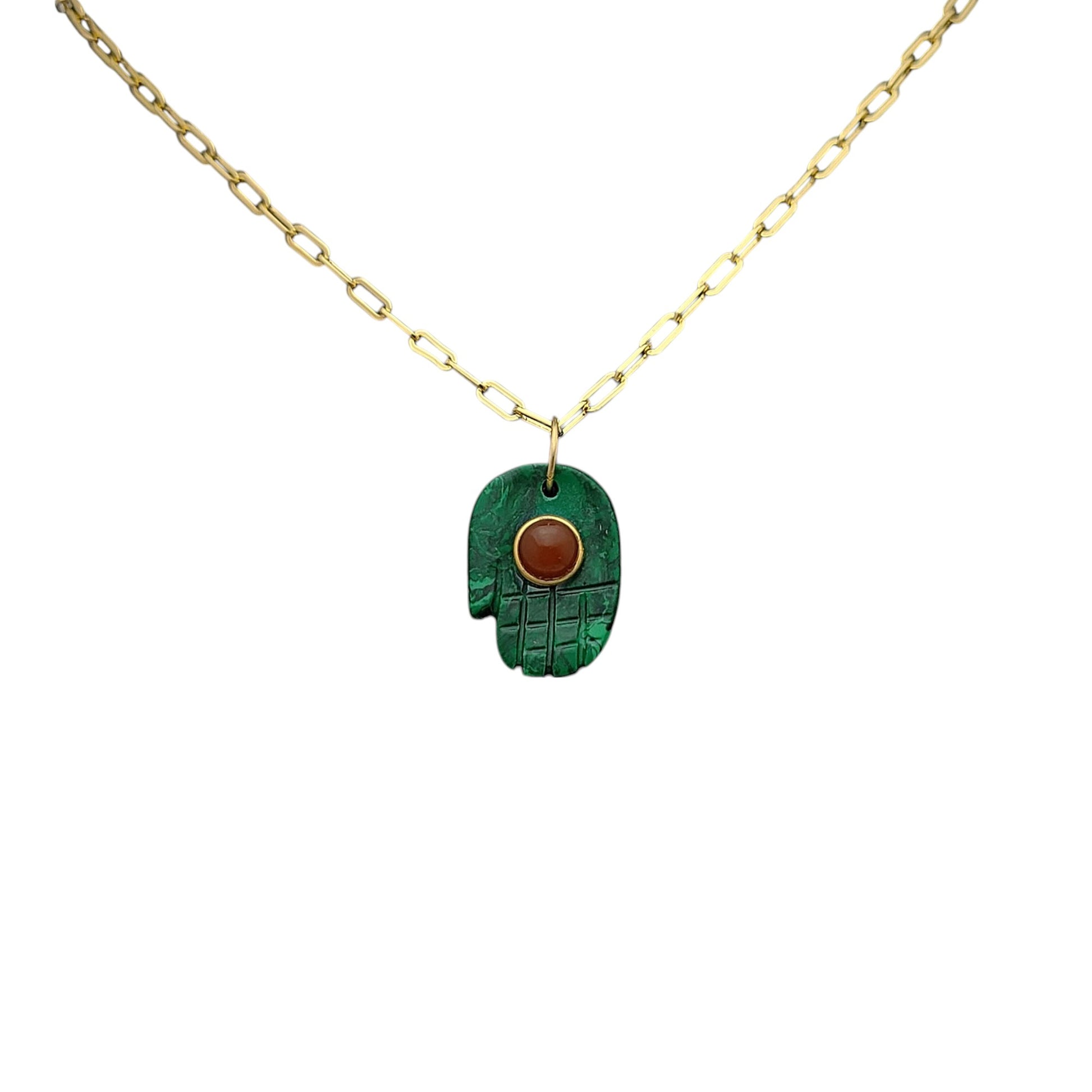Protect your energy in style with this stunning Malachite Hamsa Hand Necklace, handcrafted in 925 sterling silver. Featuring a beautifully polished natural Malachite stone, known for its powerful protective and heart-healing properties, this necklace combines ancient symbolism with modern elegance. The Hamsa Hand, a sacred symbol of protection against the evil eye, is paired with Malachite to shield your aura and encourage emotional balance and transformation. The vibrant green hues of the stone make it a striking and meaningful addition to any jewelry collection.