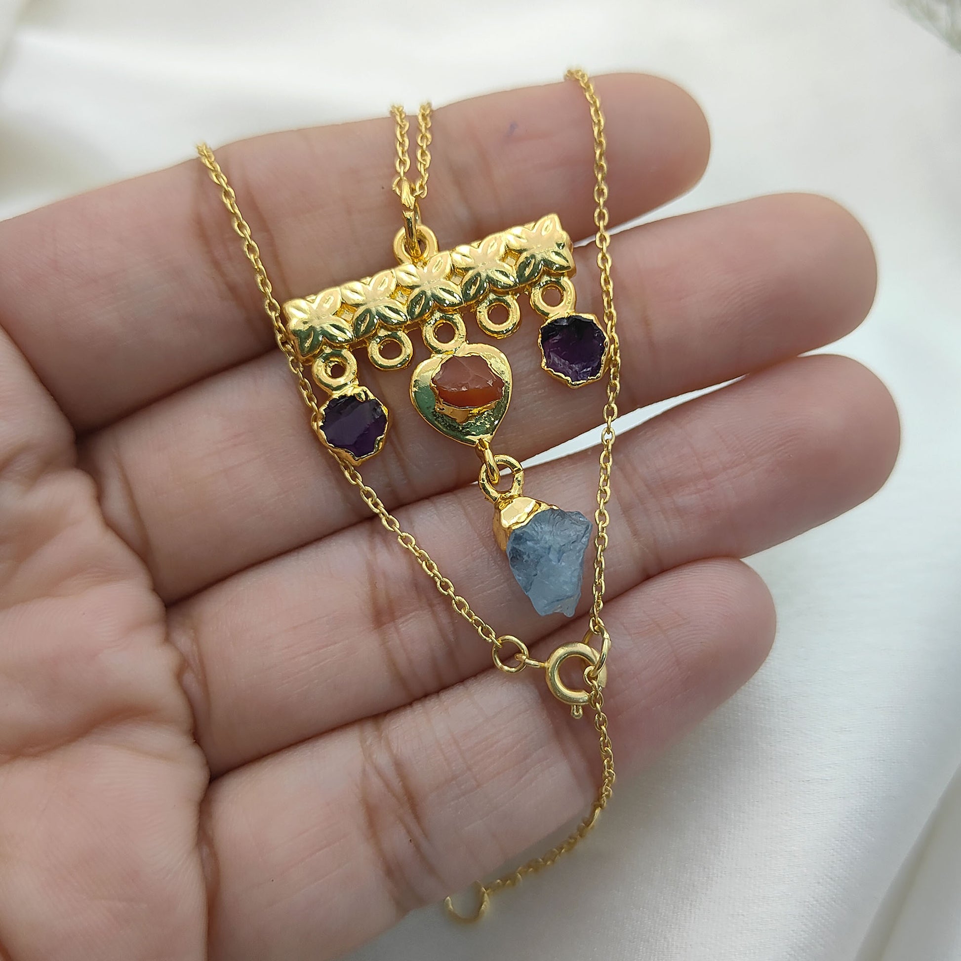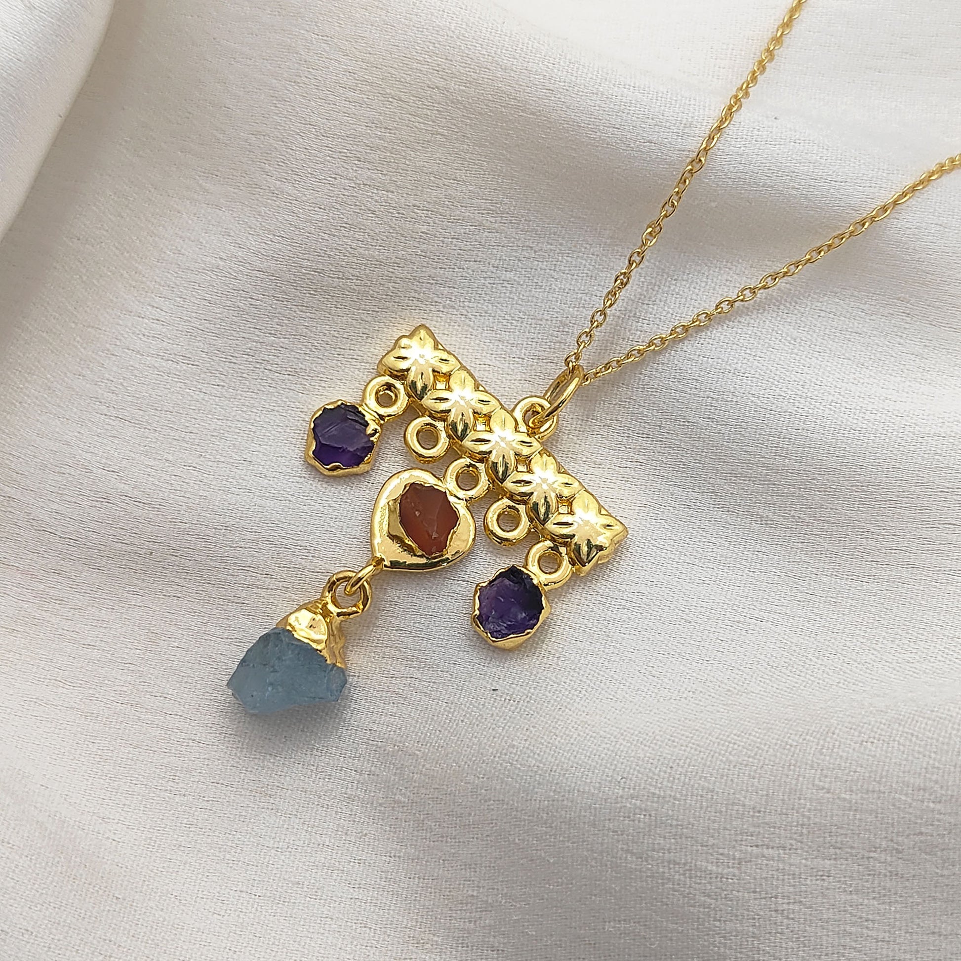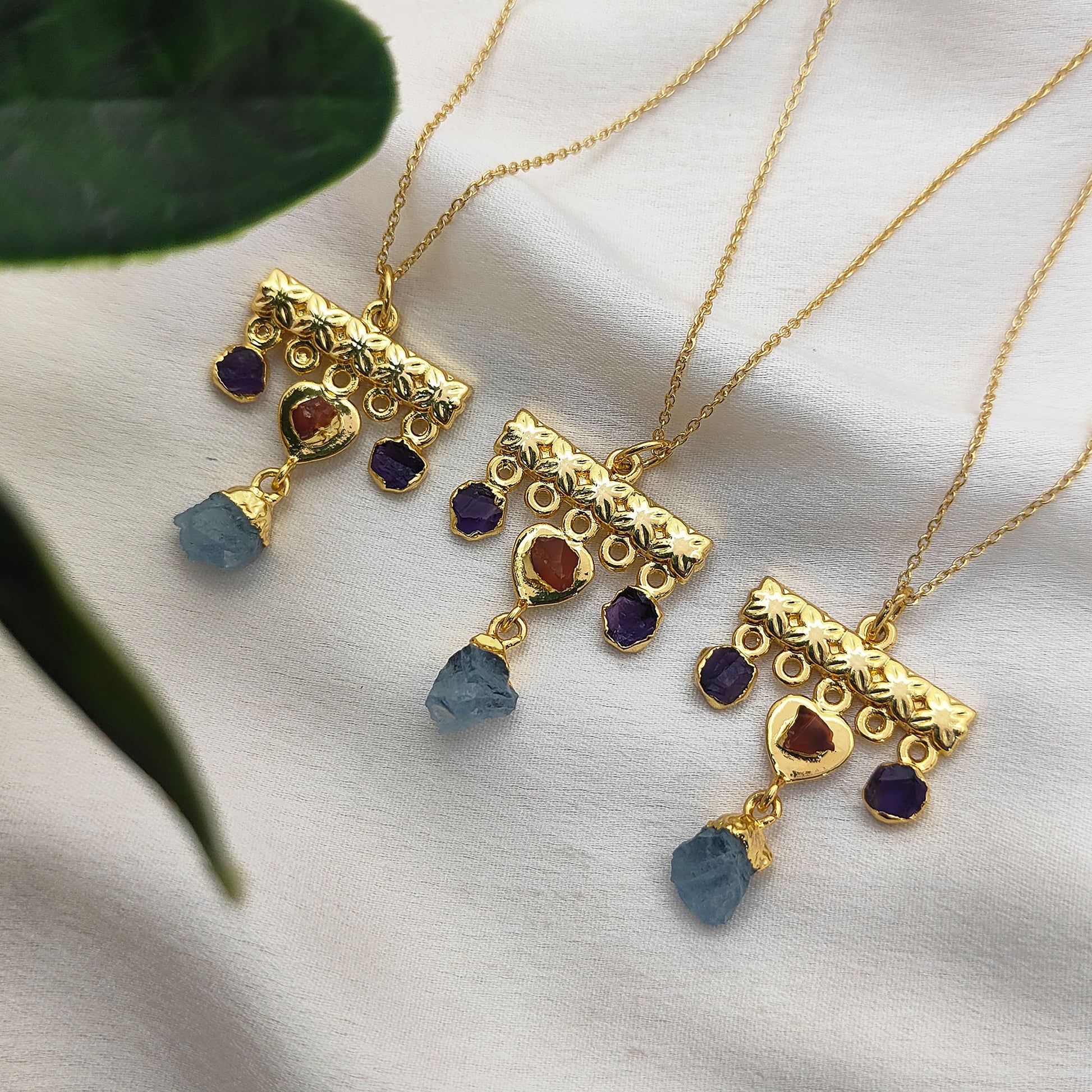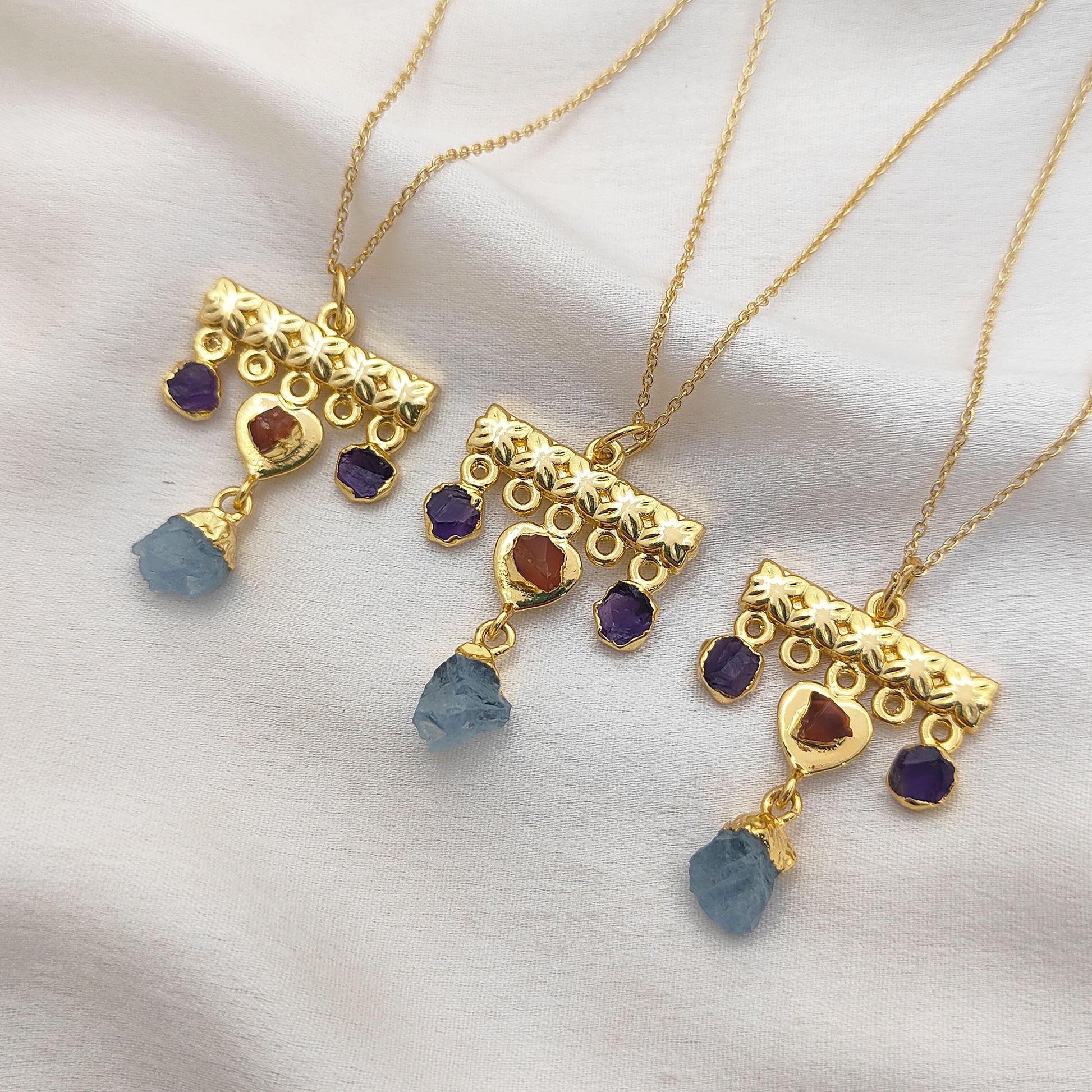 Minimalist Raw Crystal Necklace with Aquamarine, Carnelian & Amethyst Handmade Gold Plated Birthstone Jewelry