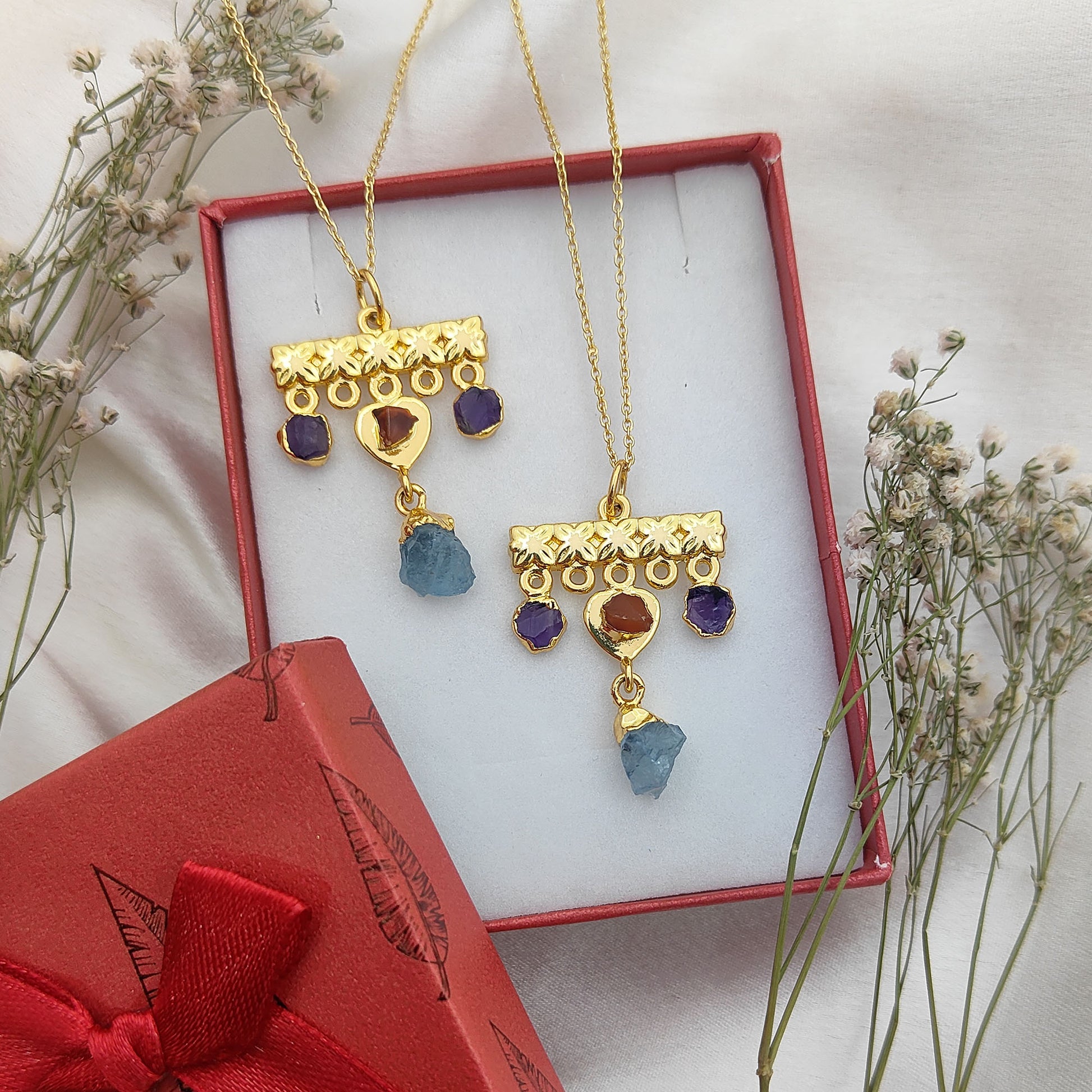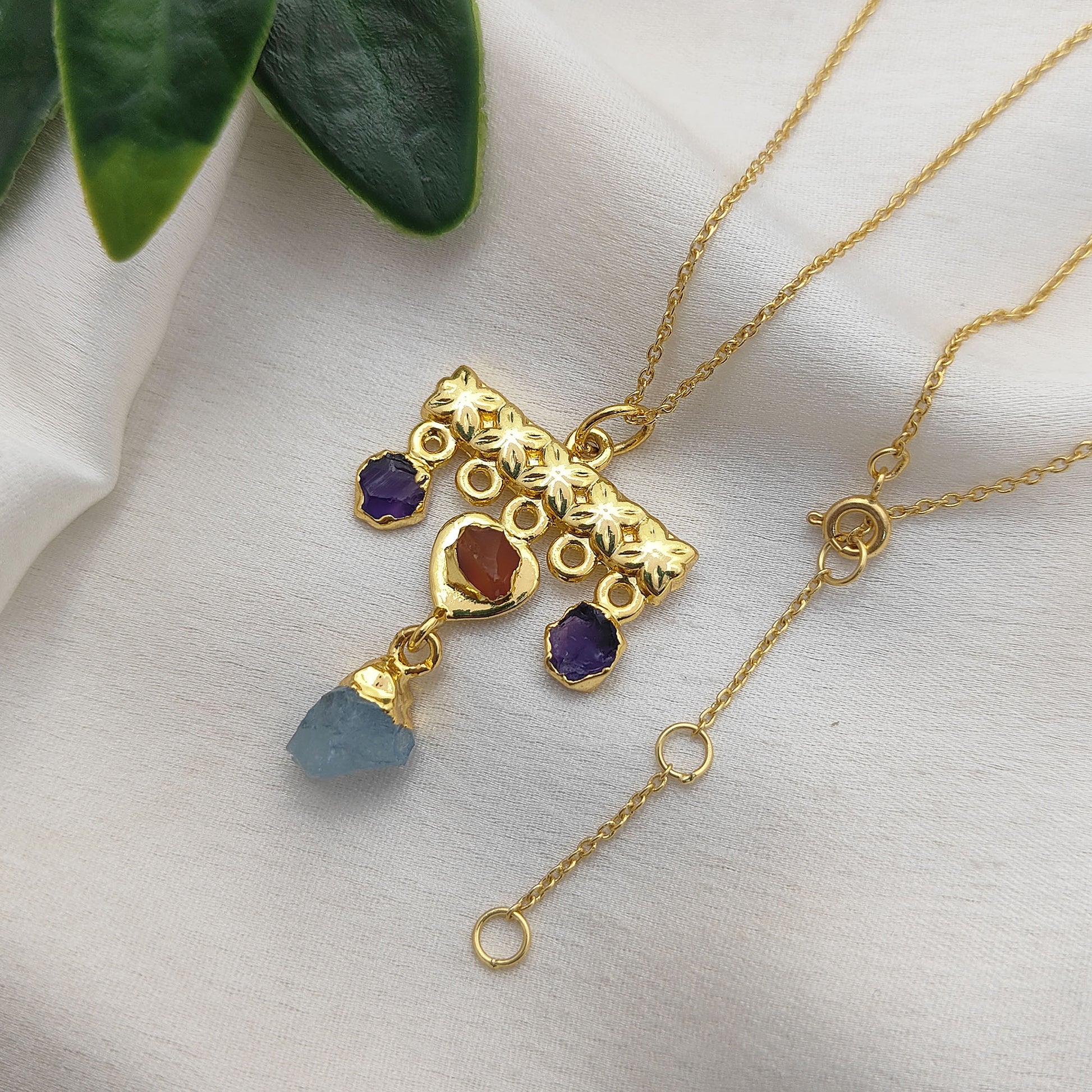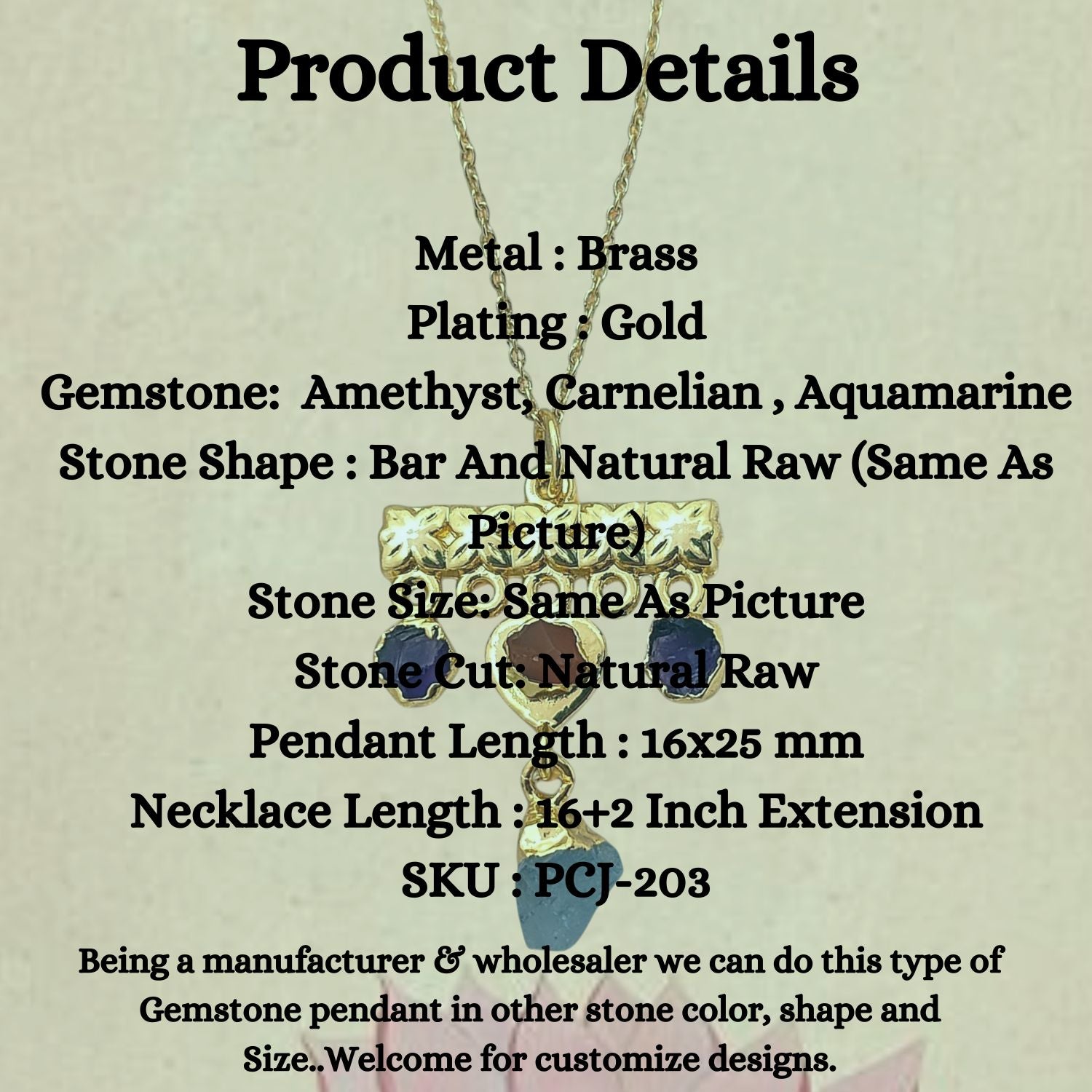 Minimalist Raw Crystal Necklace with Aquamarine, Carnelian & Amethyst Handmade Gold Plated Birthstone Jewelry