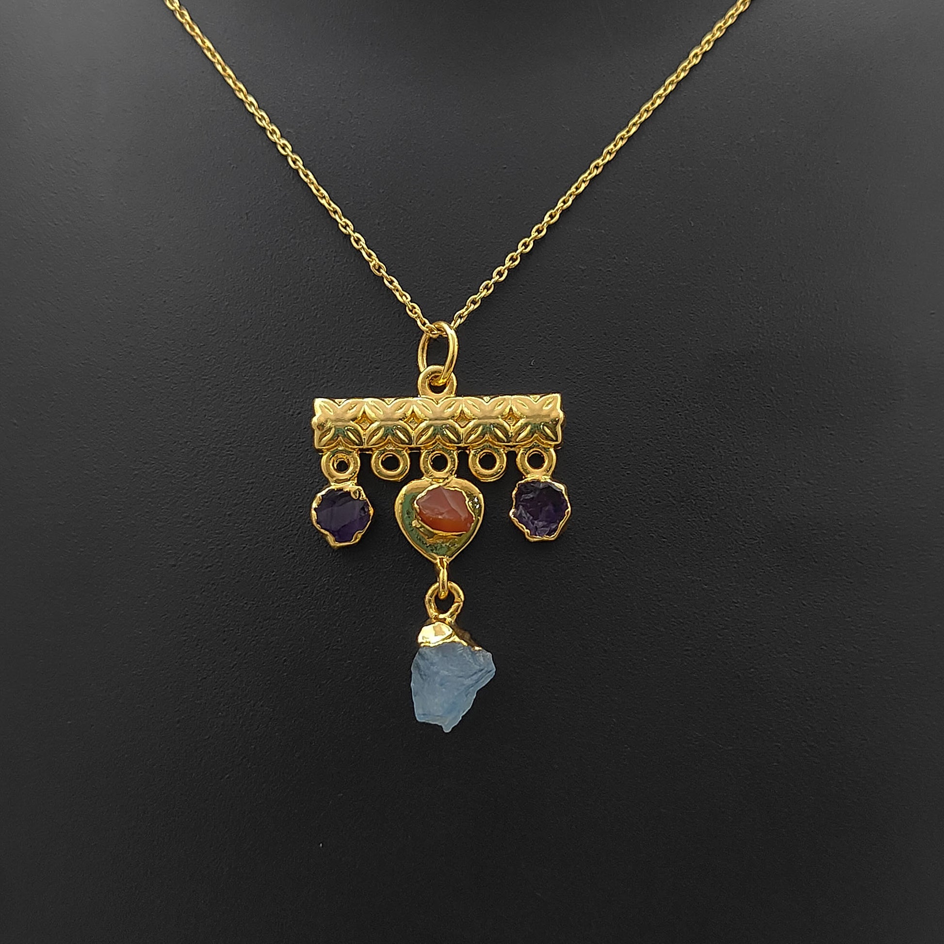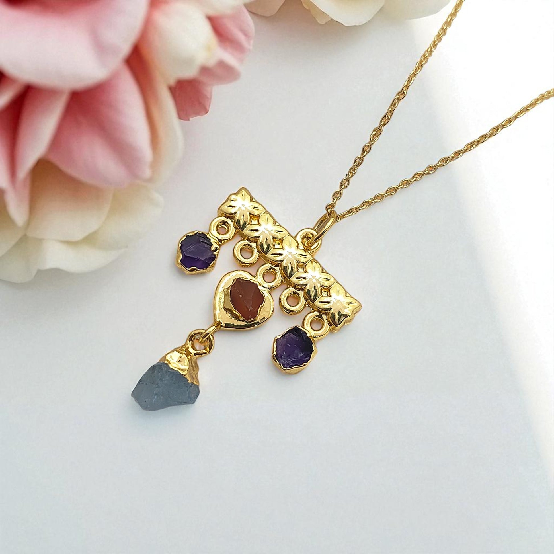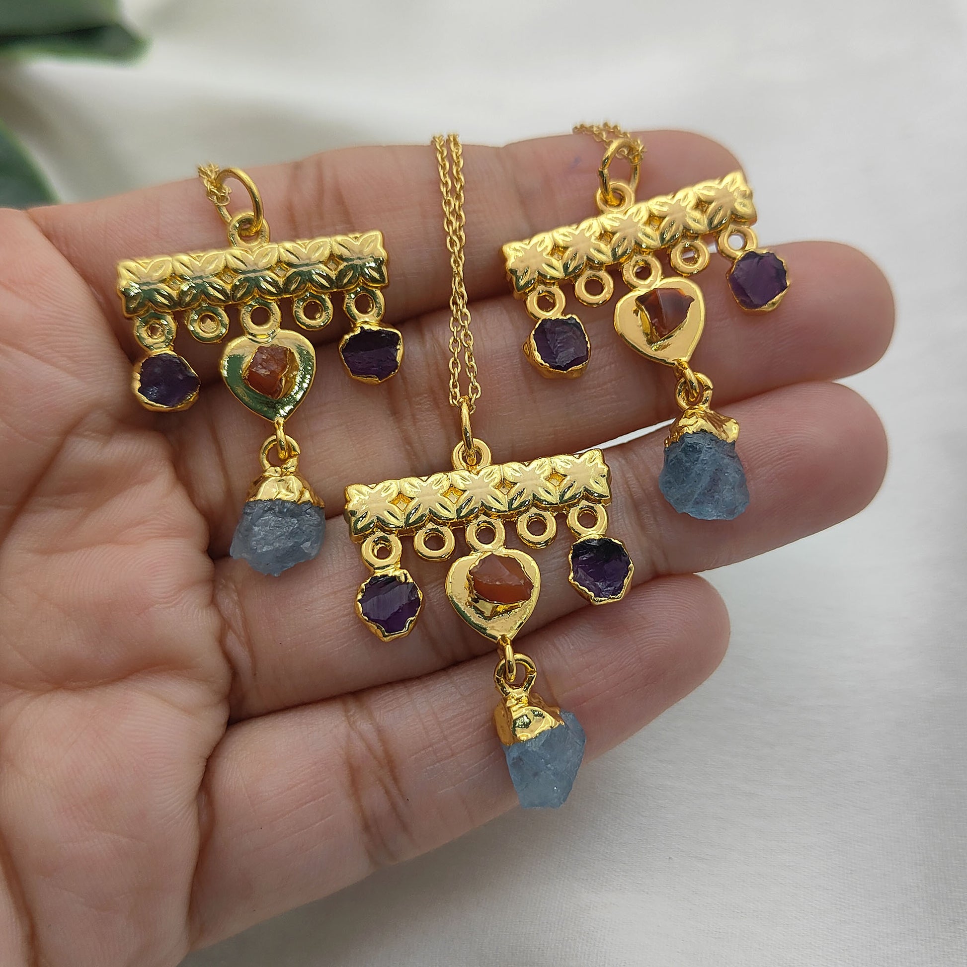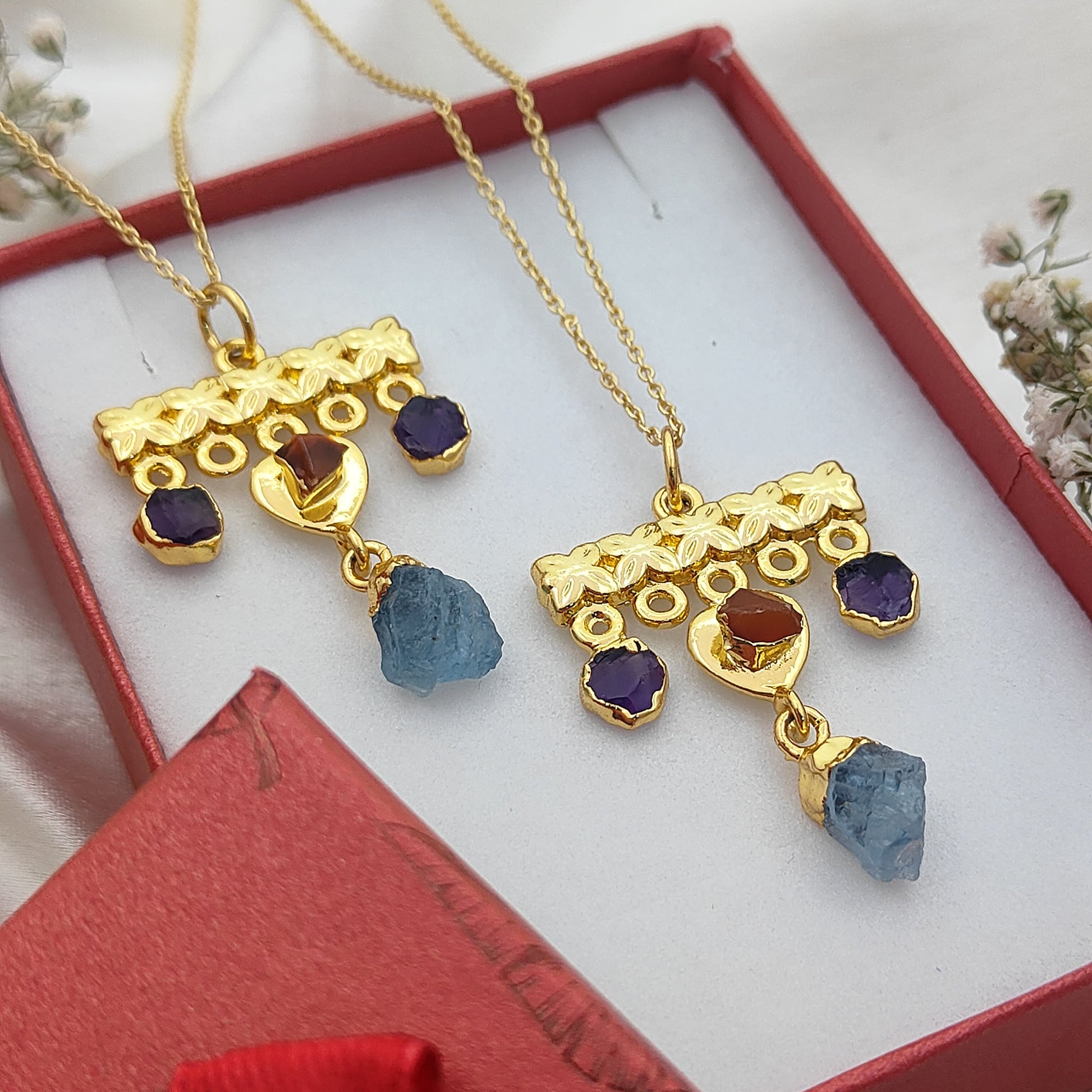 Minimalist Raw Crystal Necklace with Aquamarine, Carnelian & Amethyst Handmade Gold Plated Birthstone Jewelry