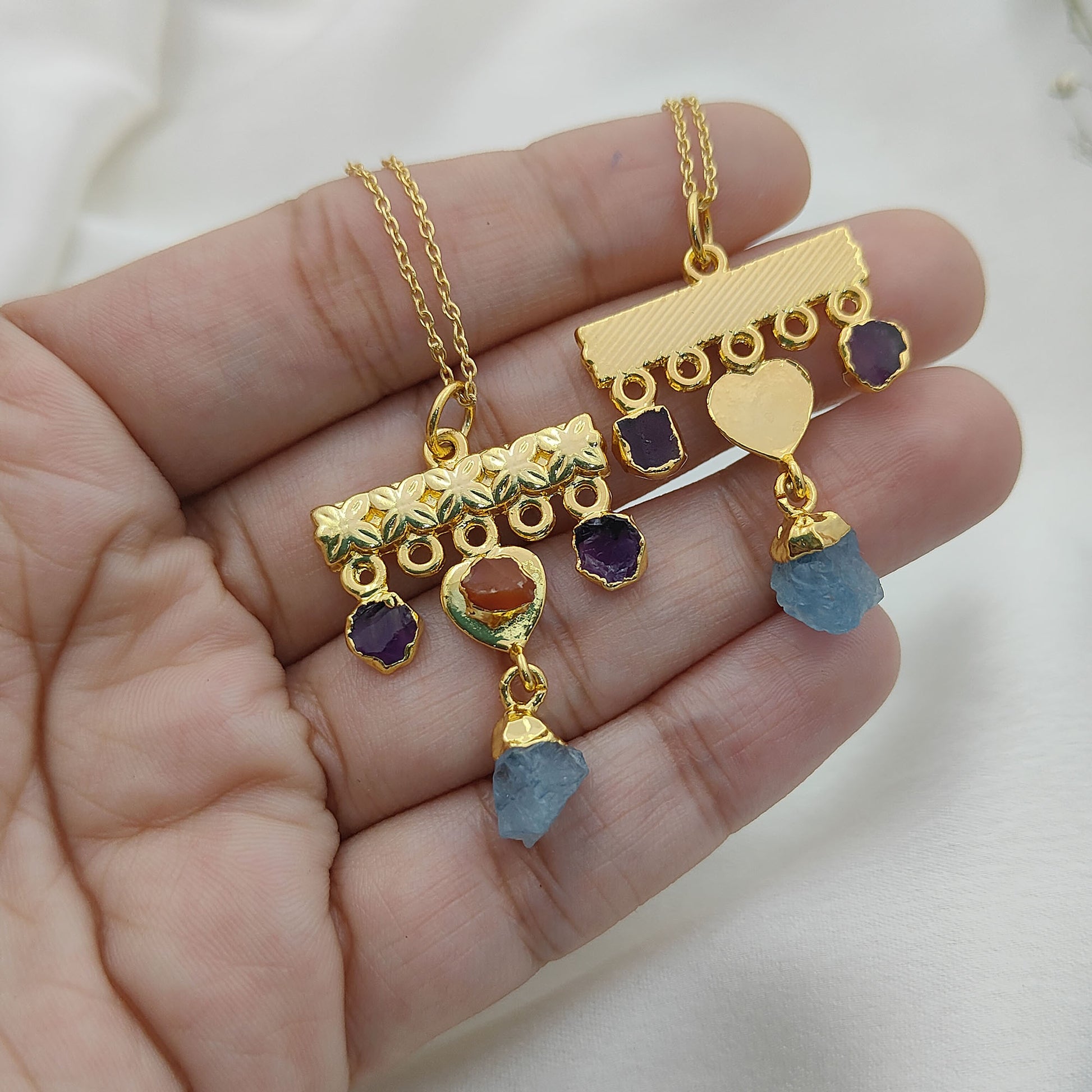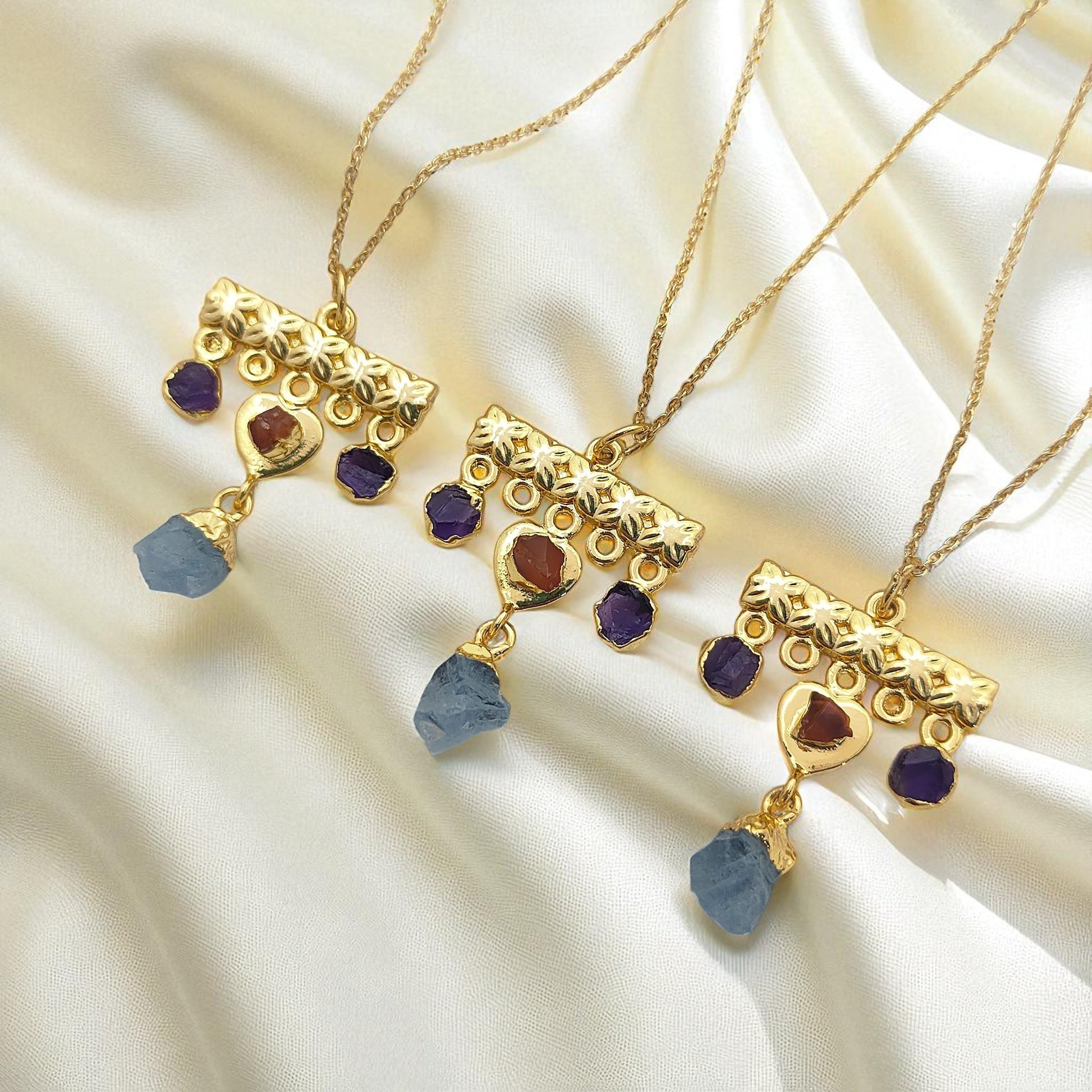 Add a touch of natural beauty to your style with this handmade minimalist necklace, featuring raw Aquamarine, Carnelian, and Amethyst crystals. Each gemstone is carefully selected in its organic form, showcasing its unique color and energy. The gold-plated chain enhances the delicate design, making it perfect for layering or wearing solo. Known for their calming, energizing, and spiritual properties, these gemstones create a beautiful harmony of healing and style.